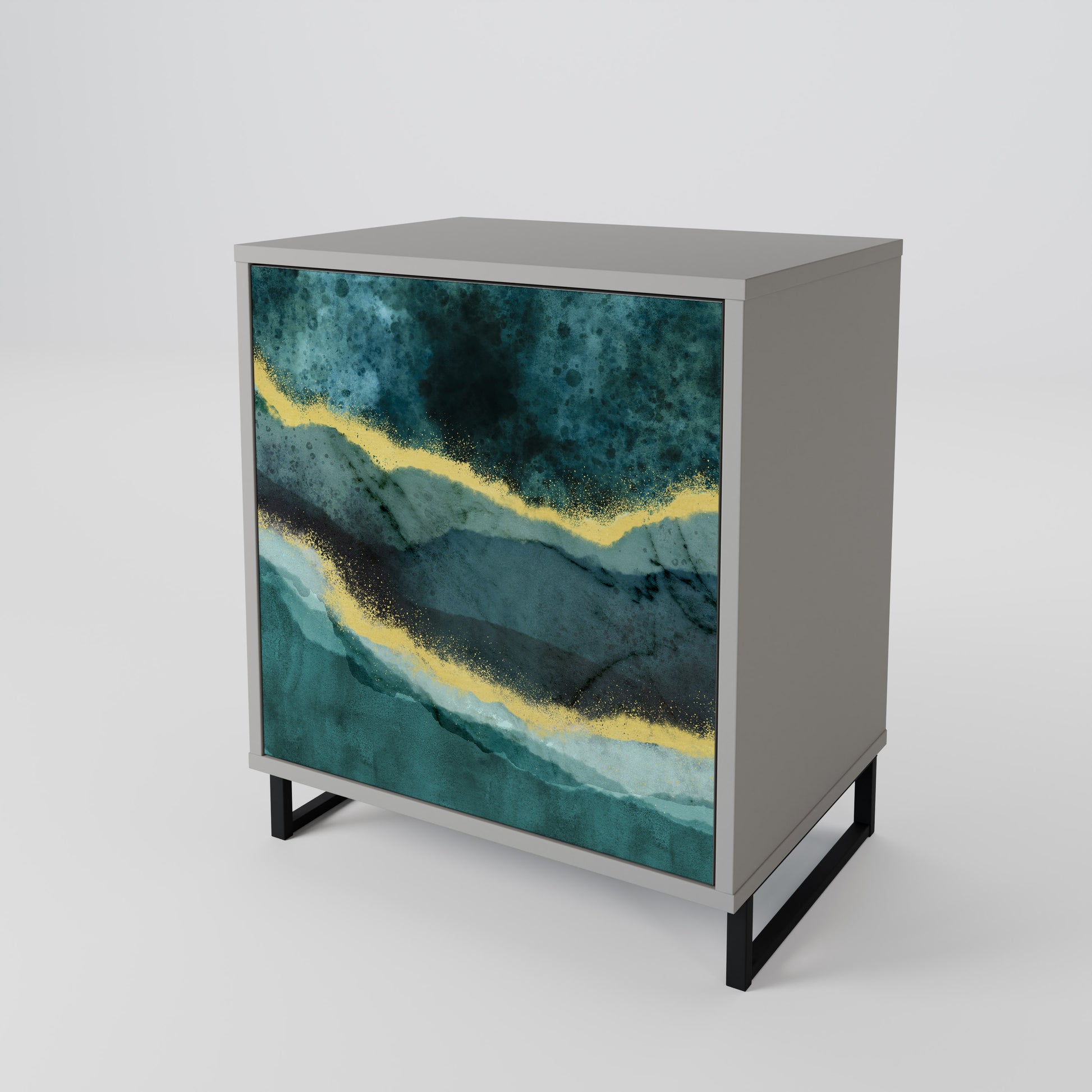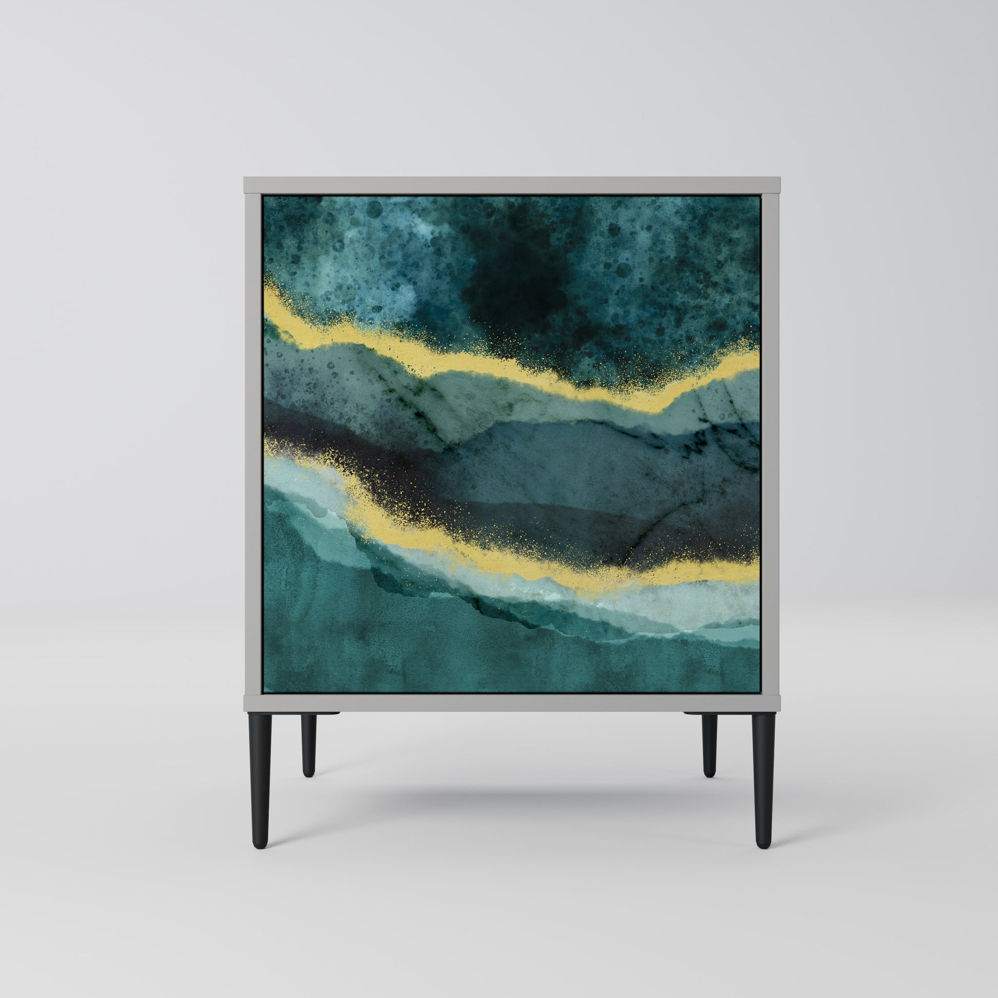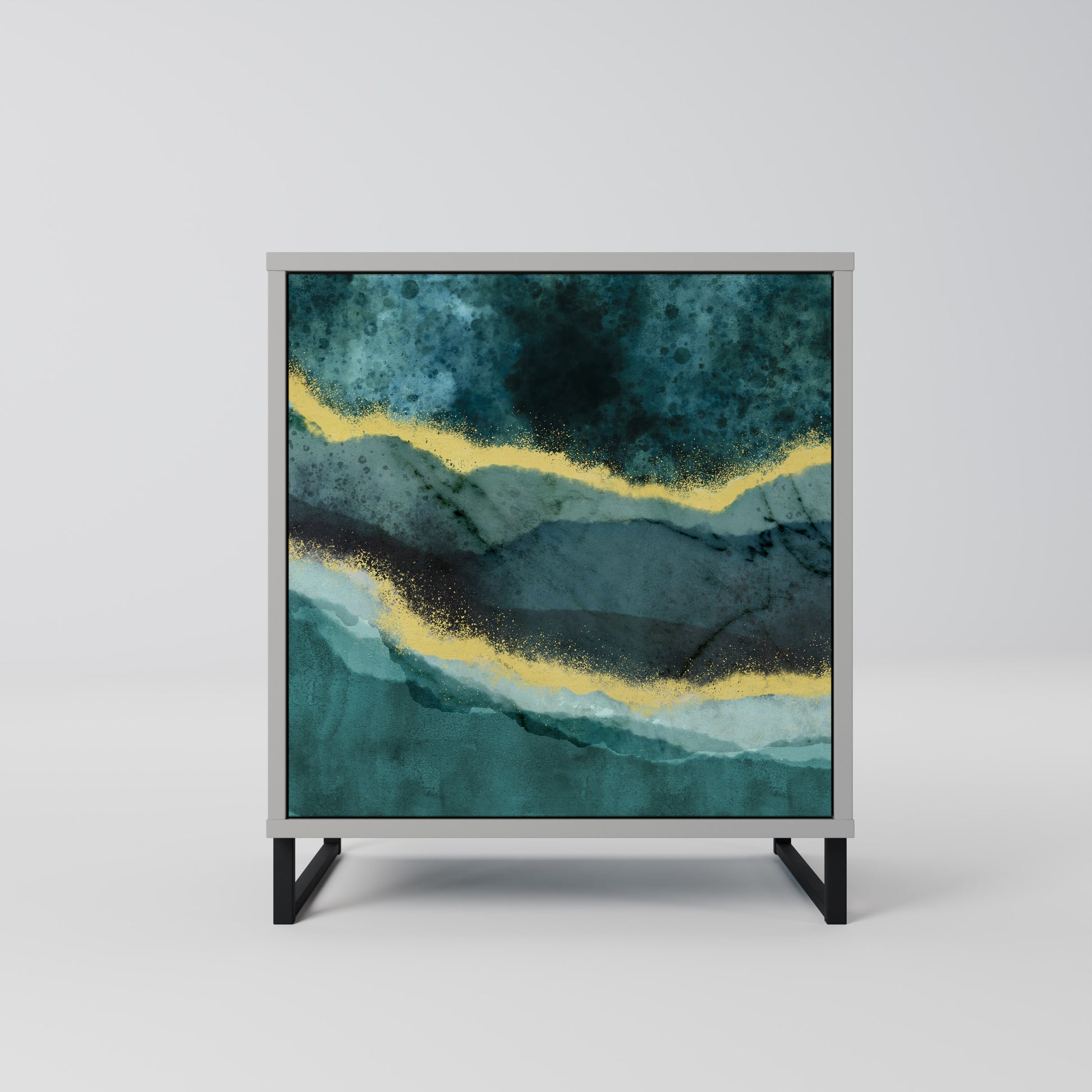 This compact yet remarkably elegant piece of furniture impresses with its minimalist design, perfectly fitting into both modern and classic interiors. The subdued grey color of the body gives the furniture a subtle yet distinctive character, while the fronts with a unique print add an artistic touch.