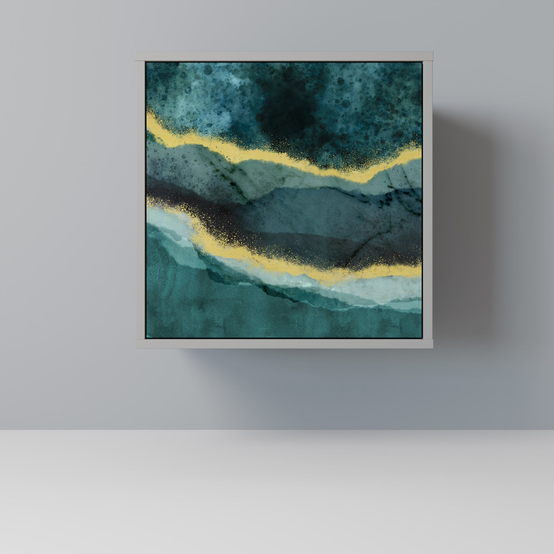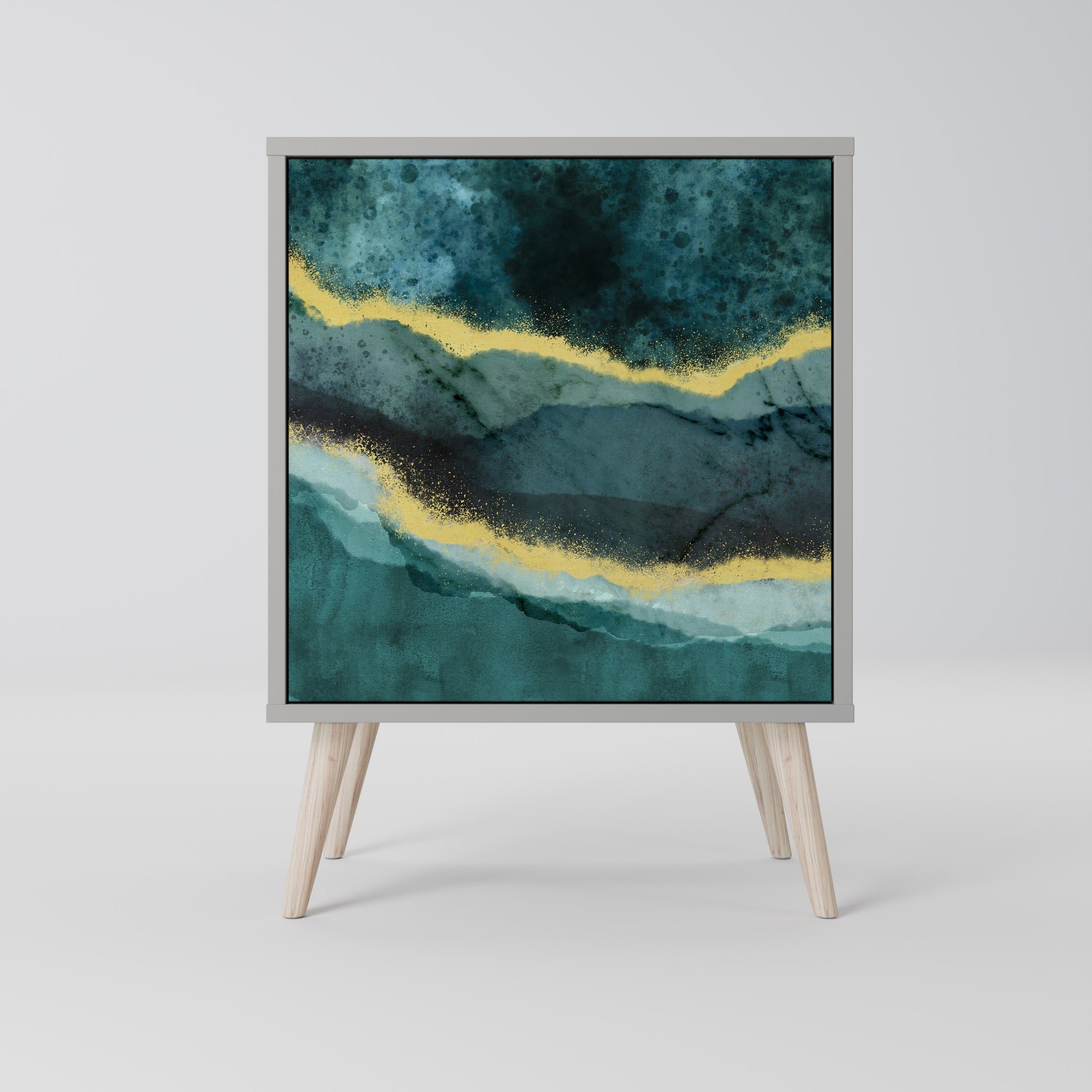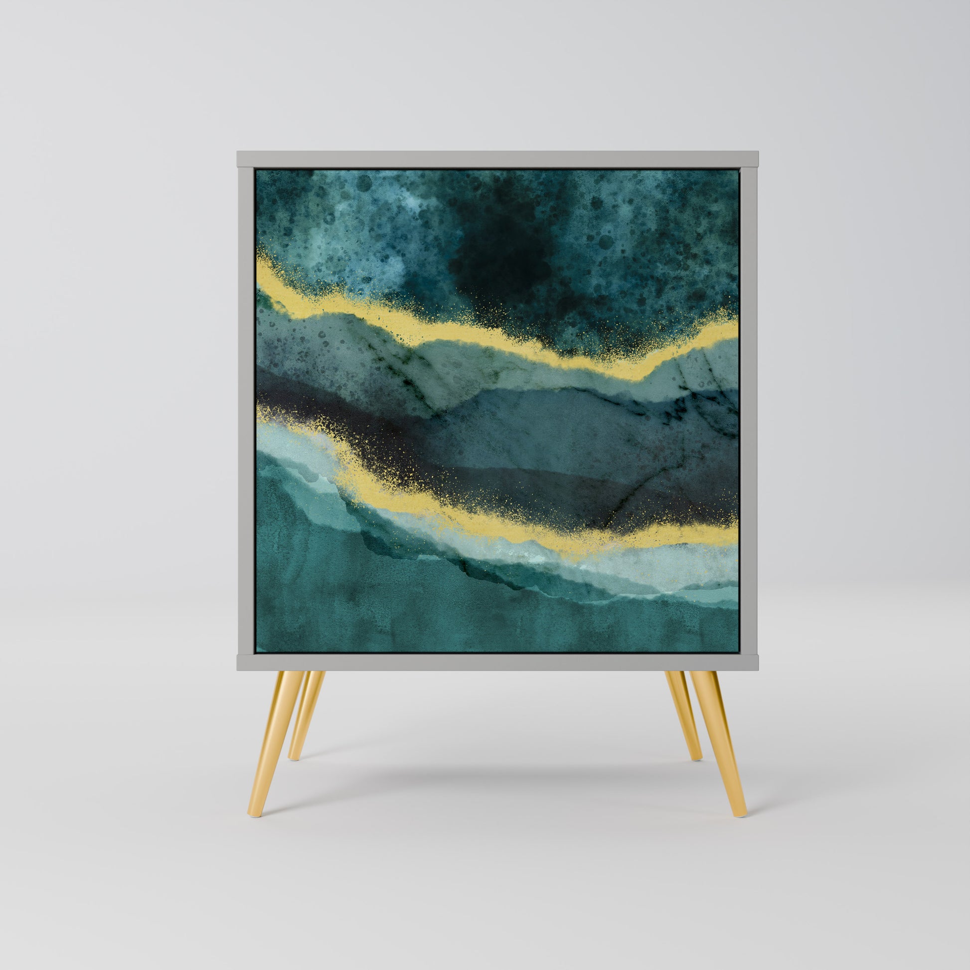 This compact yet remarkably elegant piece of furniture impresses with its minimalist design, perfectly fitting into both modern and classic interiors. The subdued grey color of the body gives the furniture a subtle yet distinctive character, while the fronts with a unique print add an artistic touch.