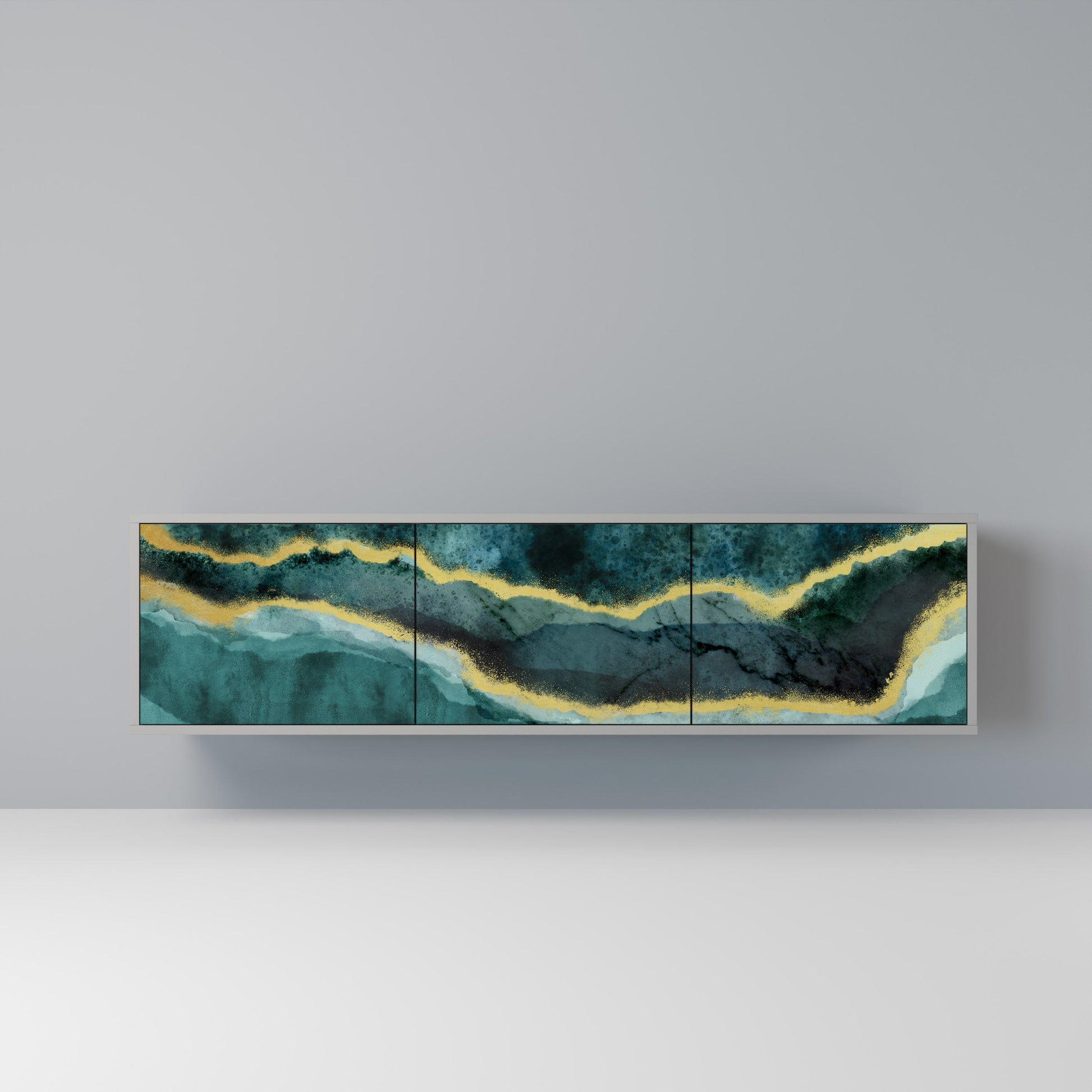 The grey body of the stand creates a refined, modern accent that pairs beautifully with industrial and minimalist arrangements. The fronts with a designer print add character and uniqueness, making this piece not only practical but also a standout decorative element.