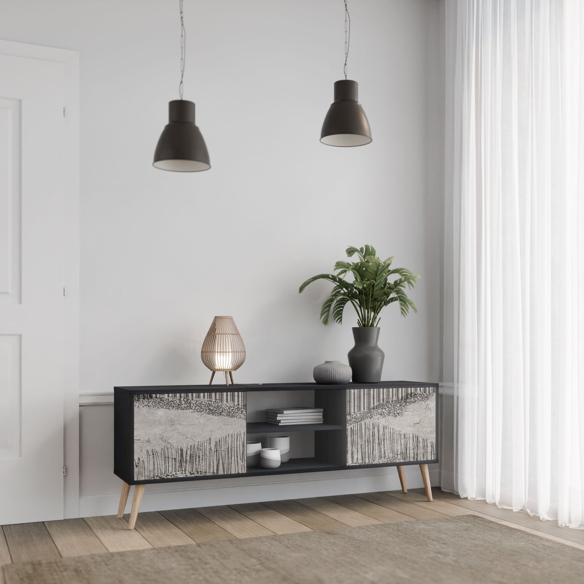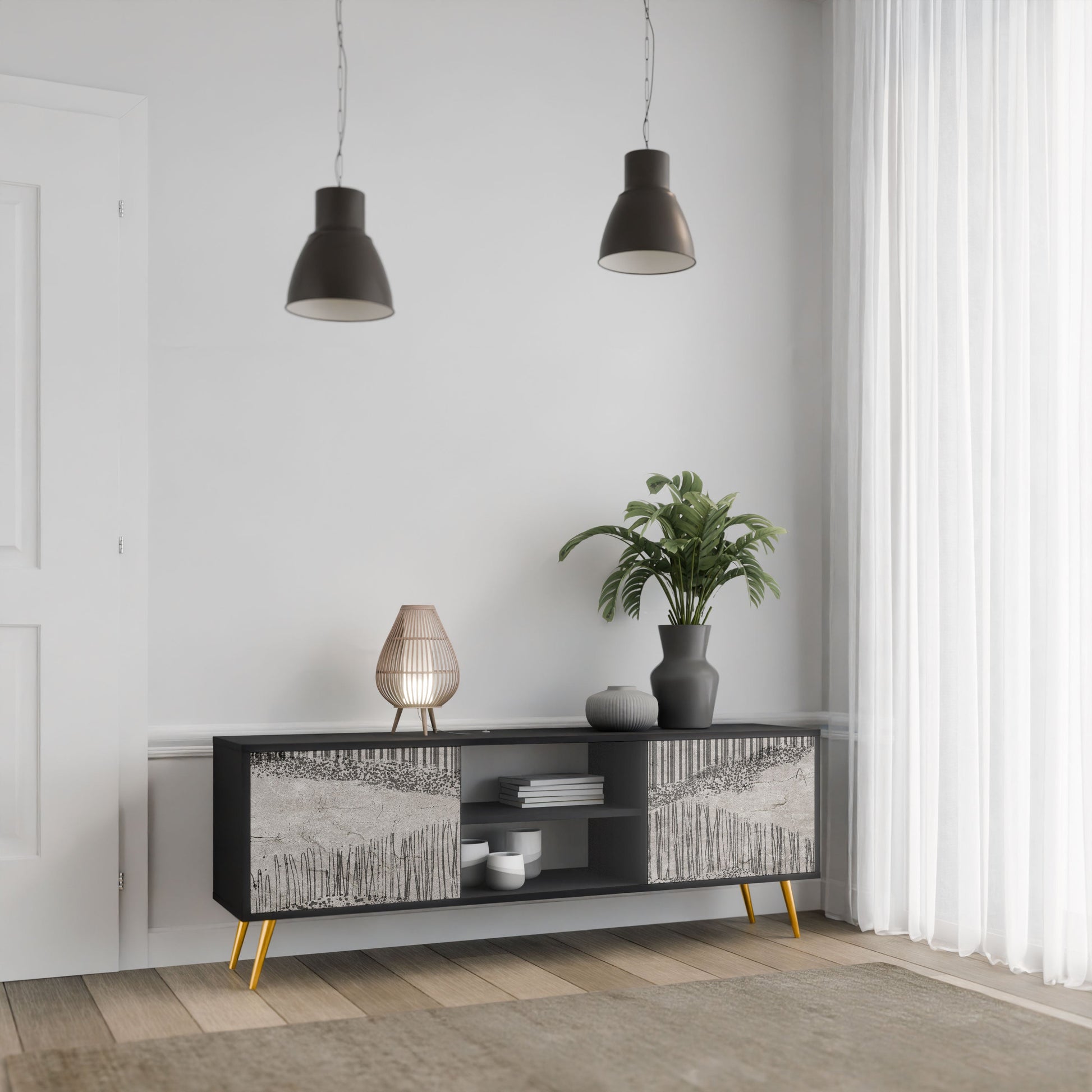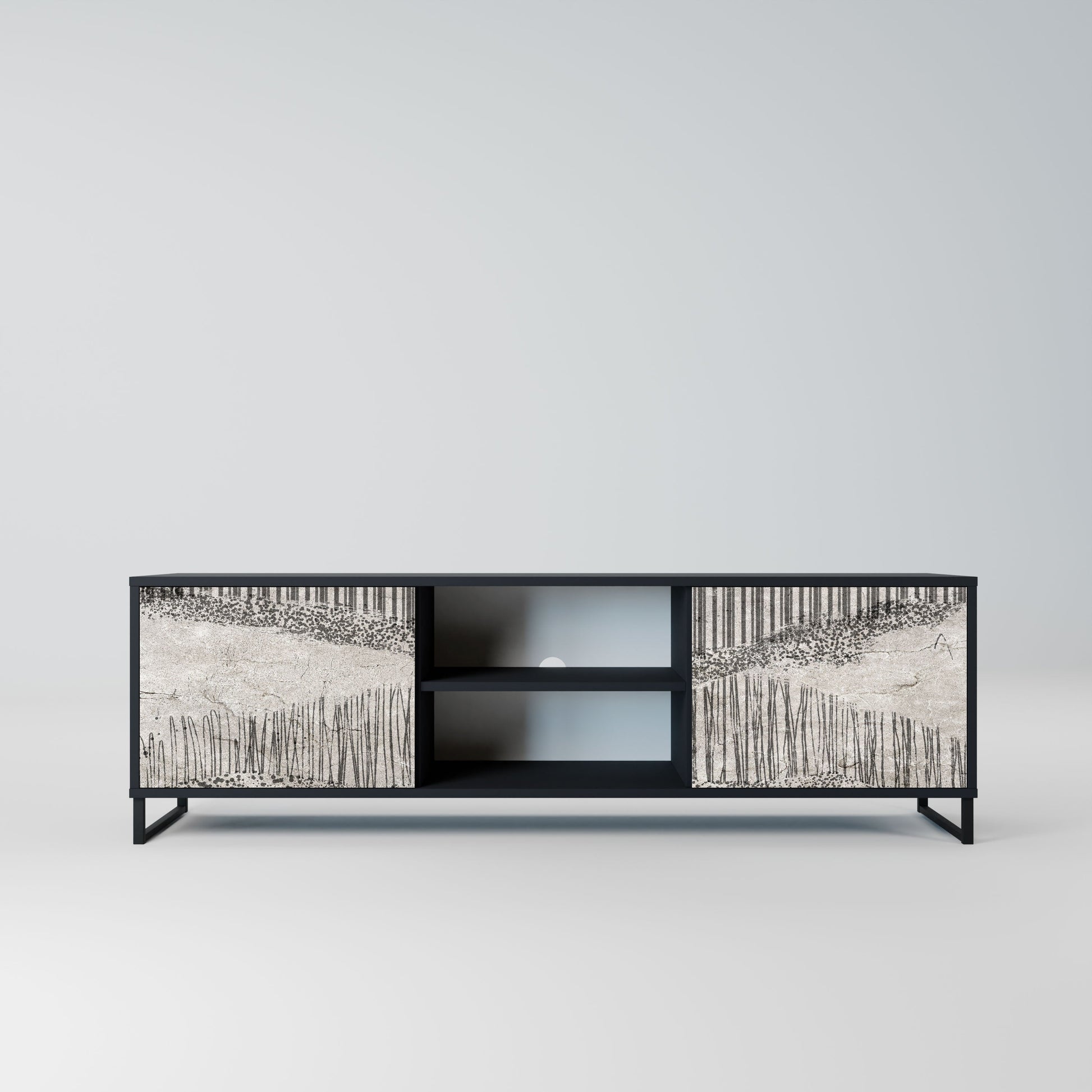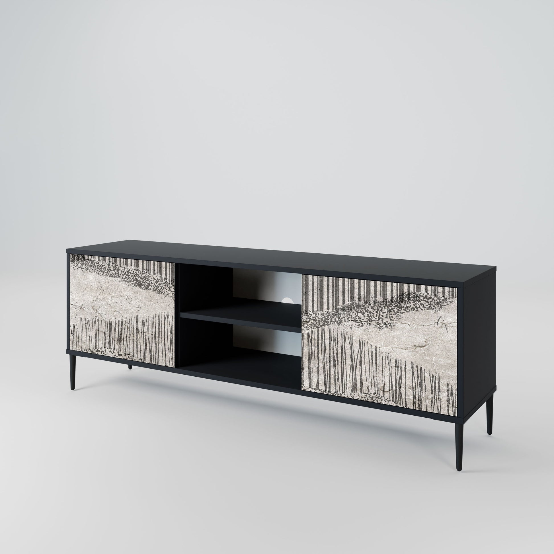 The black body gives the TV stand an elegant, modern look, while the fronts with an exceptional print draw attention, making it the focal point of any room. The spacious interior provides room for electronic devices, cables, remotes, and other accessories, helping you maintain order and organization.
