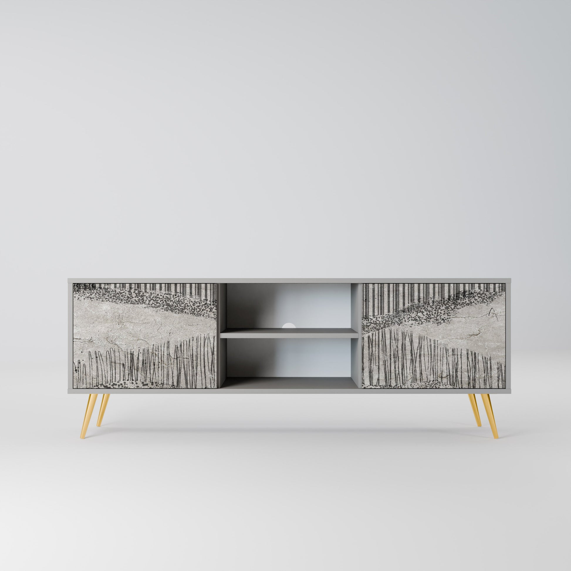 The grey body lends the TV stand a contemporary, refined look, while the fronts with an exceptional print capture attention, becoming the focal point of any room. The spacious interior provides room for electronic devices, cables, remotes, and other accessories, helping you maintain order and organization.