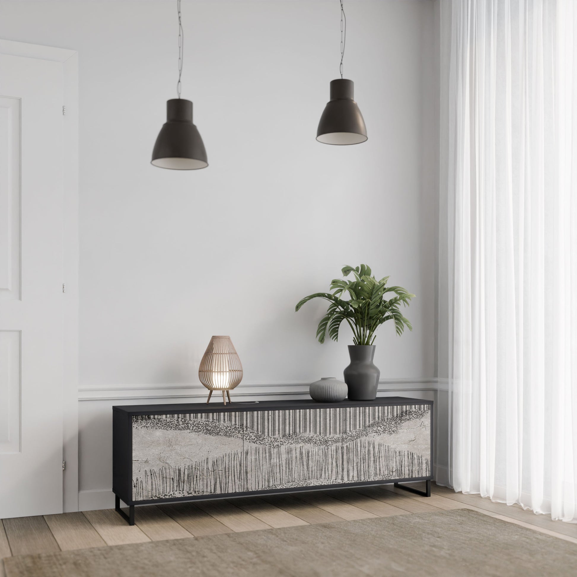 The black body of the stand creates a bold, modern accent that pairs beautifully with industrial and minimalist arrangements. The fronts with a designer print add character and uniqueness, making this piece not only practical but also a standout decorative element.
