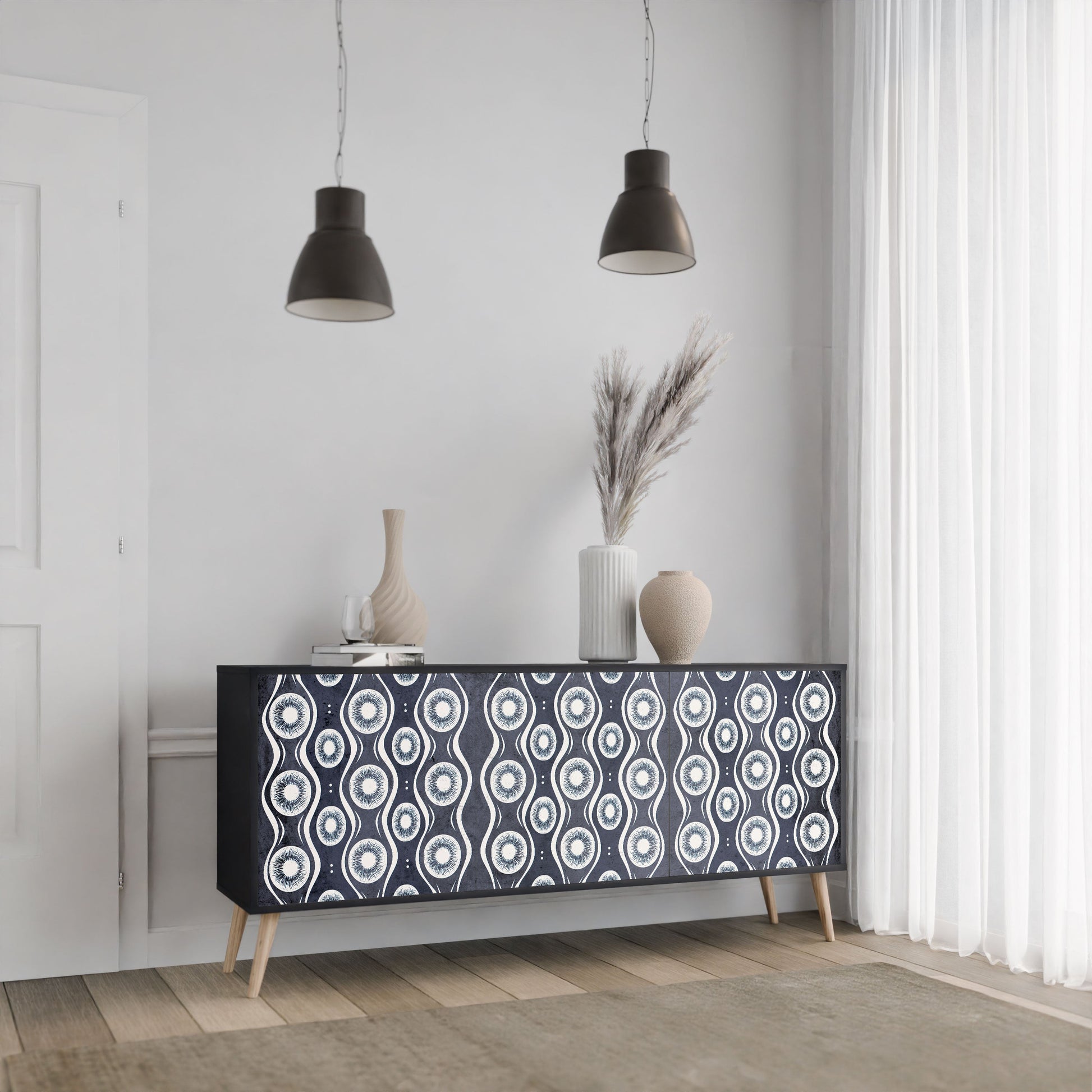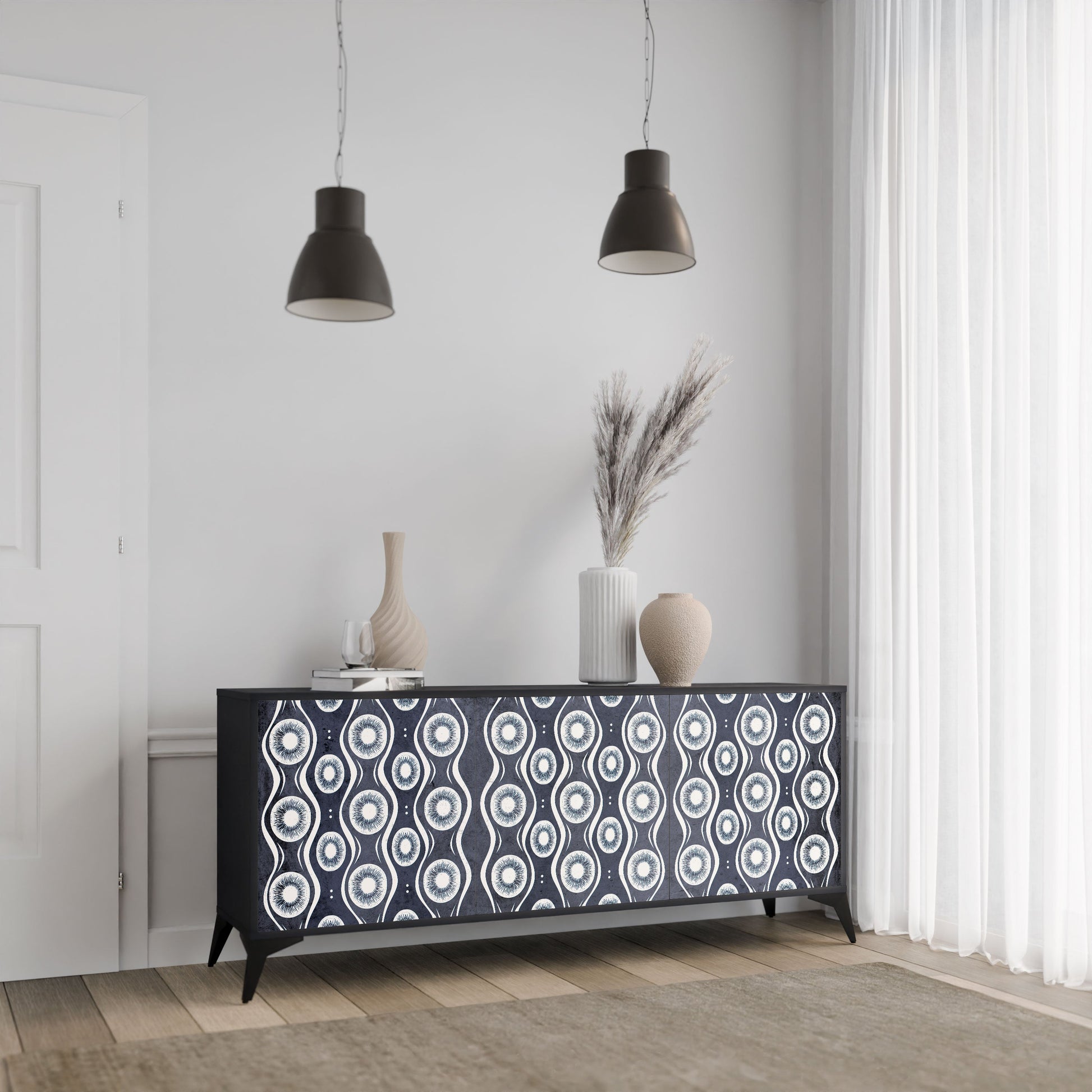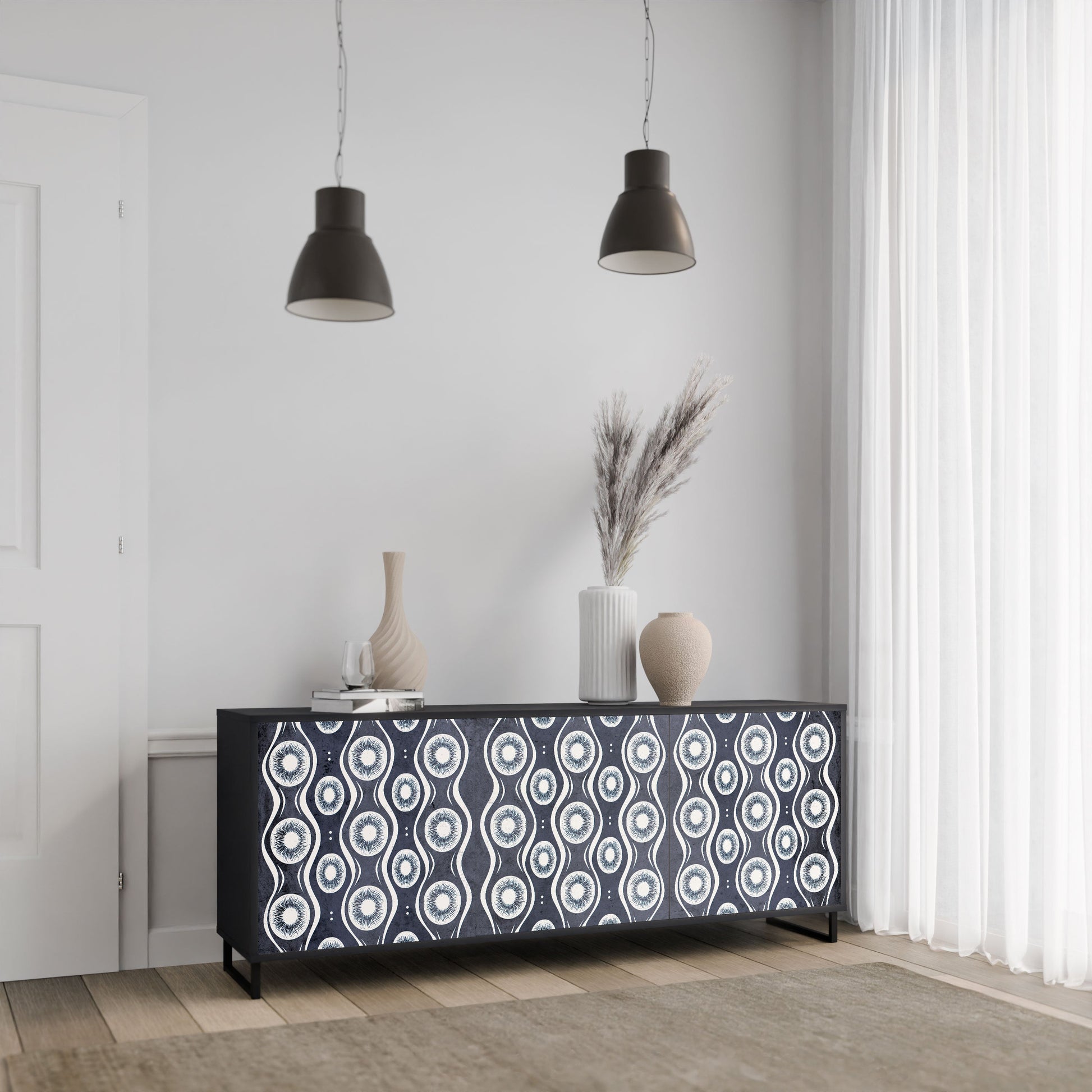 Elegance and functionality in a single piece of furniture – our 3-Door Sideboard with a black body is the perfect solution for lovers of stylish, modern interiors. The black body emphasizes the bold character of the furniture, while the fronts with a unique print add an artistic touch. It fits perfectly in the living room, bedroom, or office, complementing both modern and industrial arrangements.