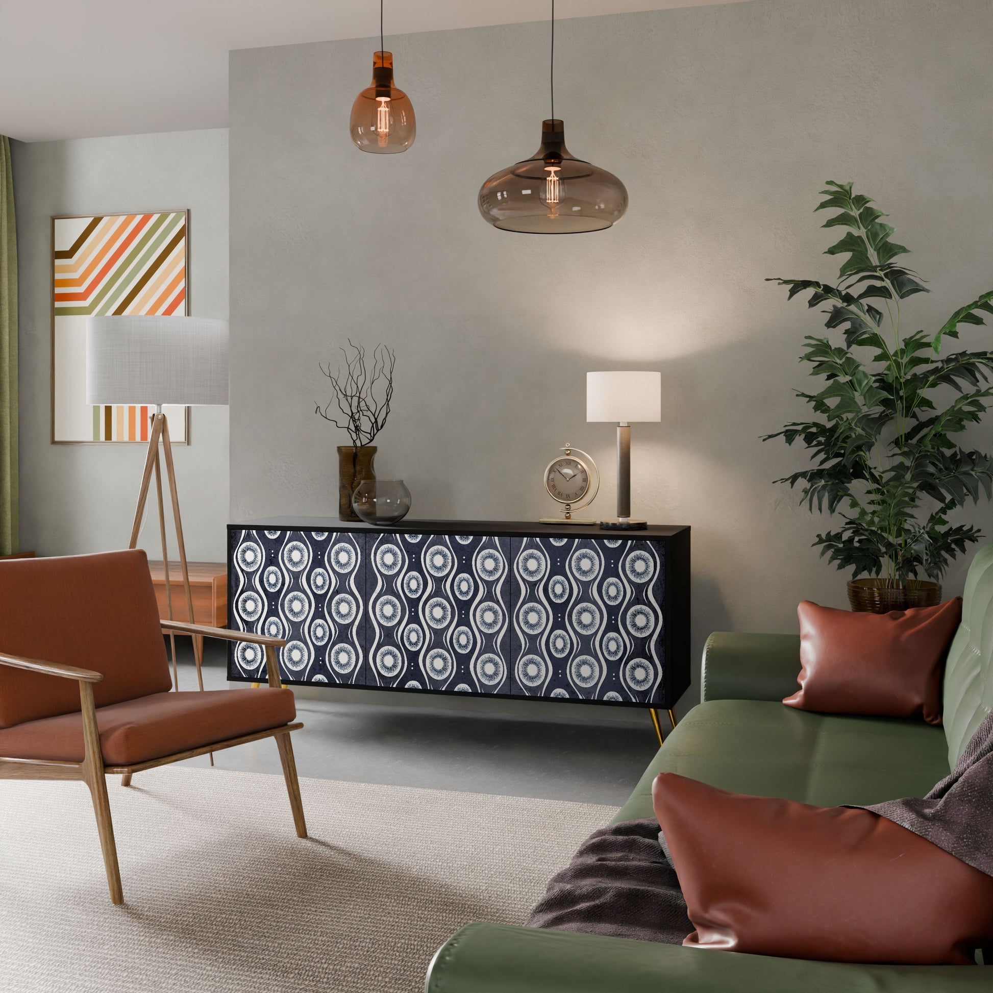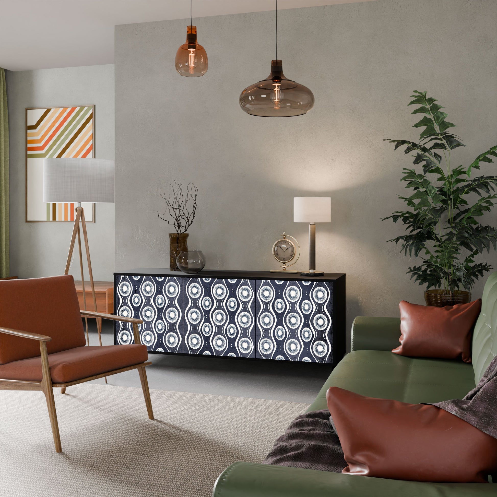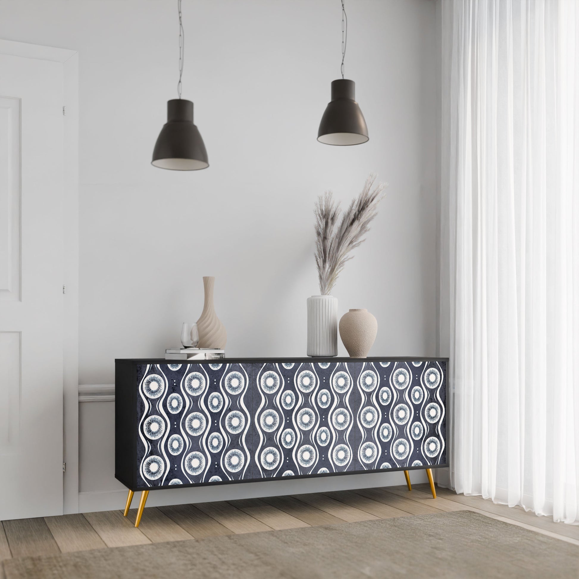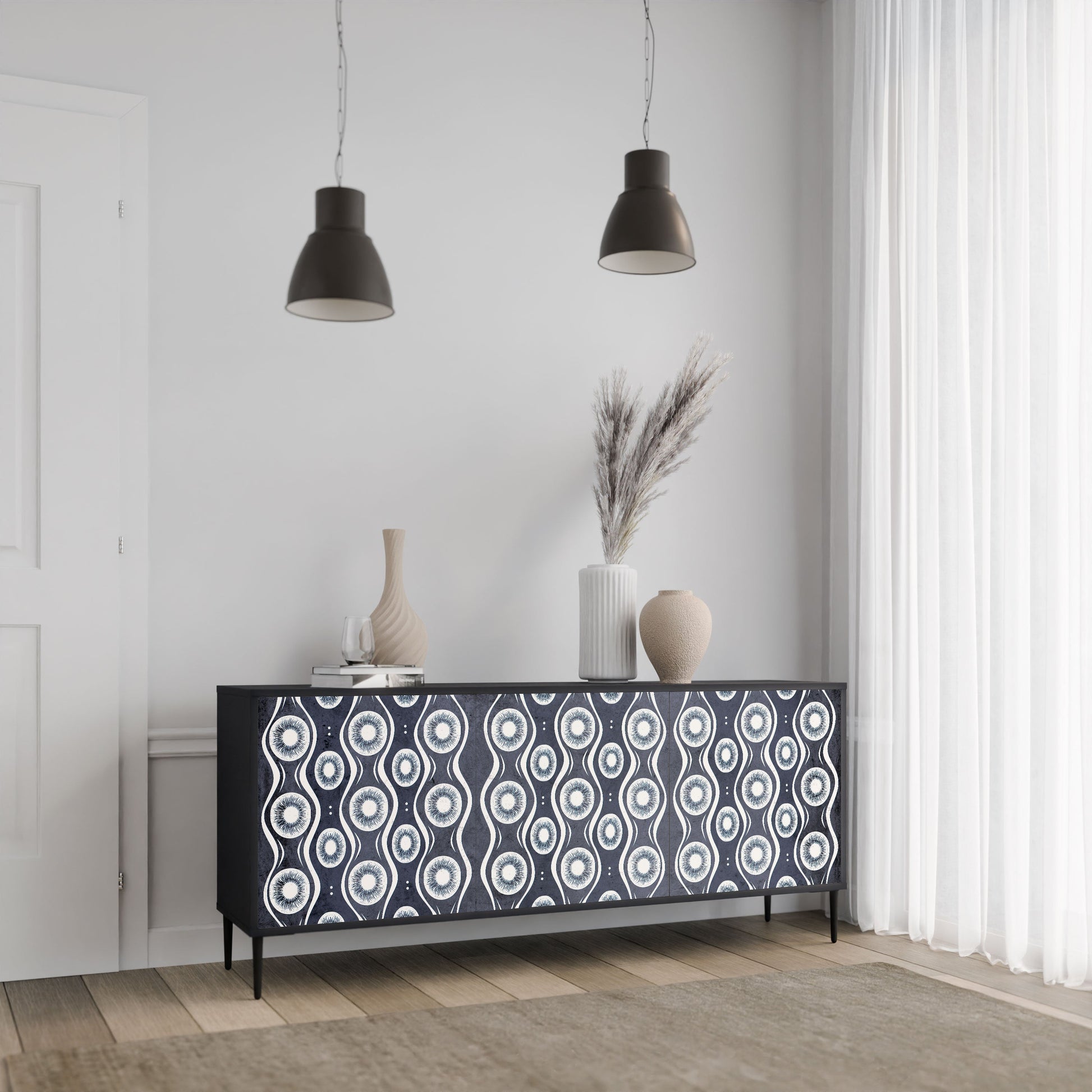 Elegance and functionality in a single piece of furniture – our 3-Door Sideboard with a black body is the perfect solution for lovers of stylish, modern interiors. The black body emphasizes the bold character of the furniture, while the fronts with a unique print add an artistic touch. It fits perfectly in the living room, bedroom, or office, complementing both modern and industrial arrangements.