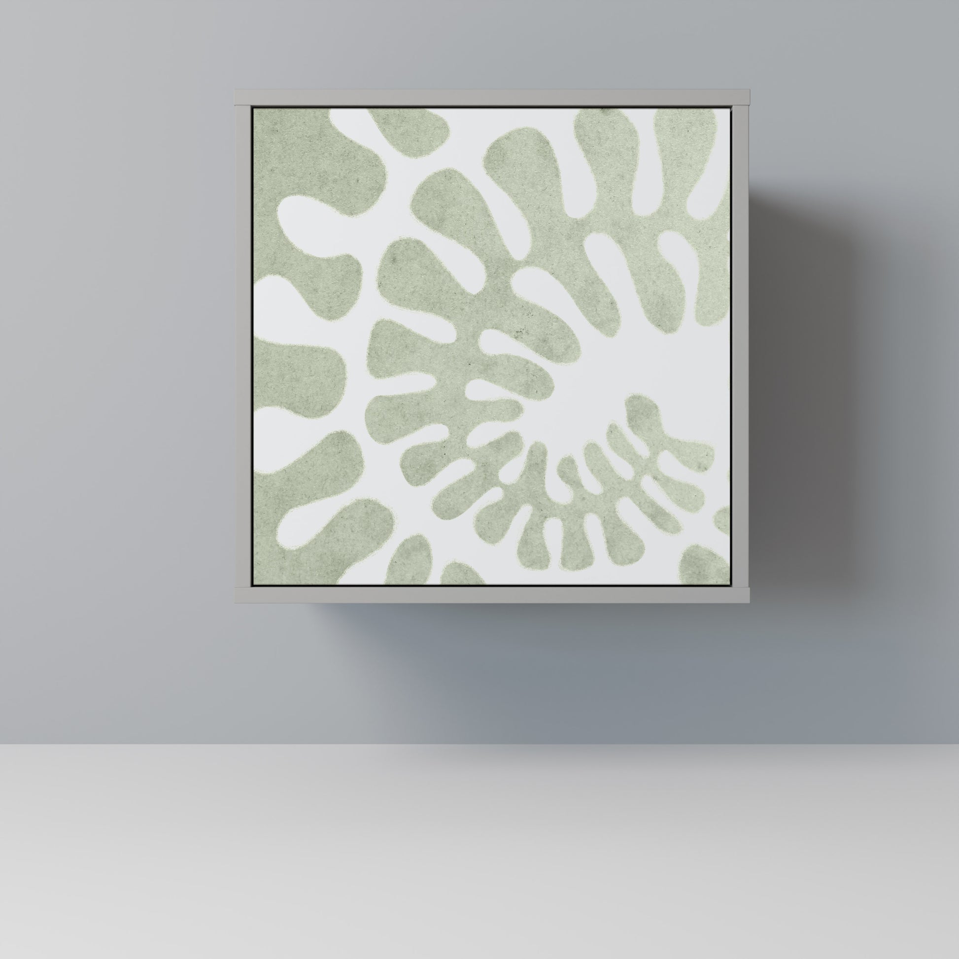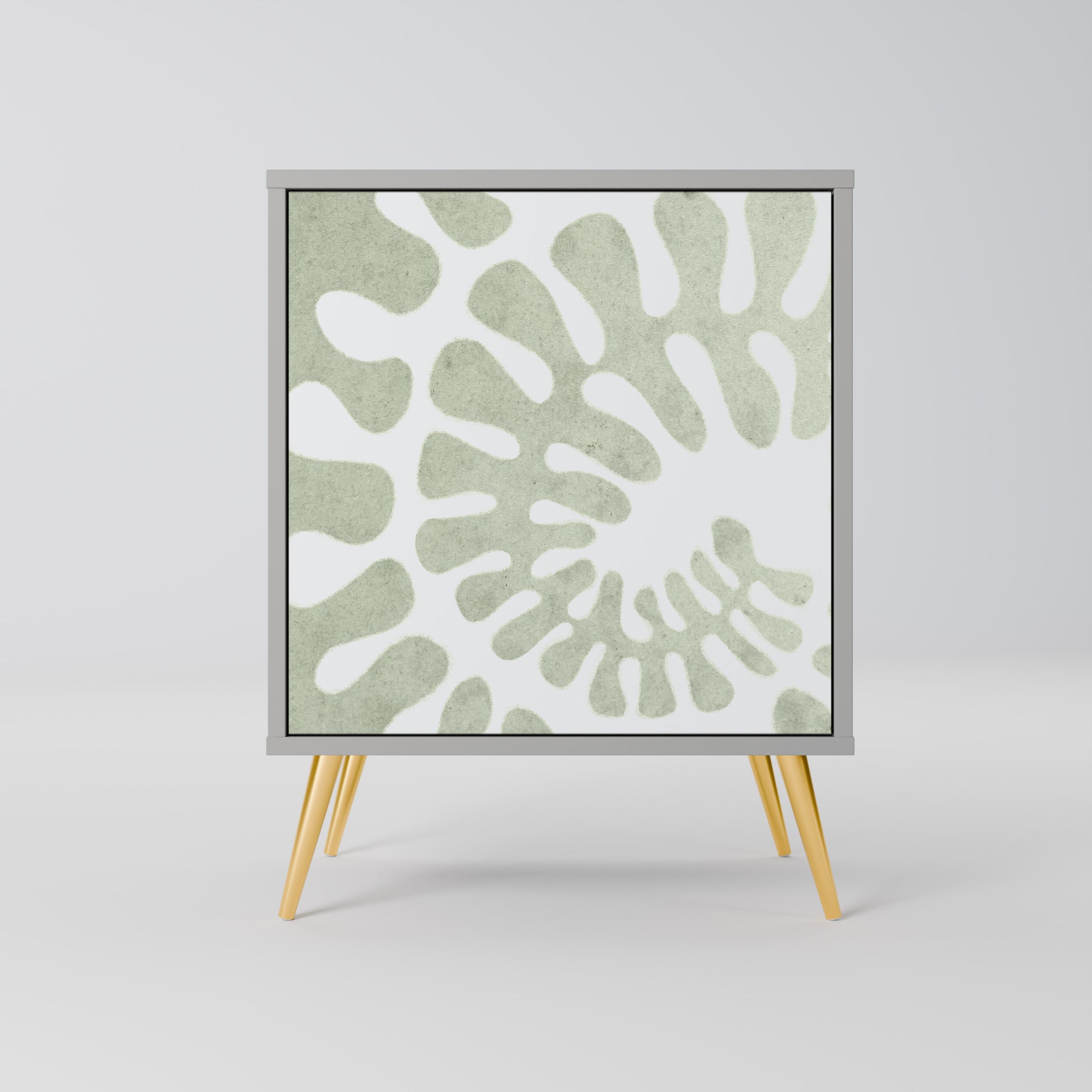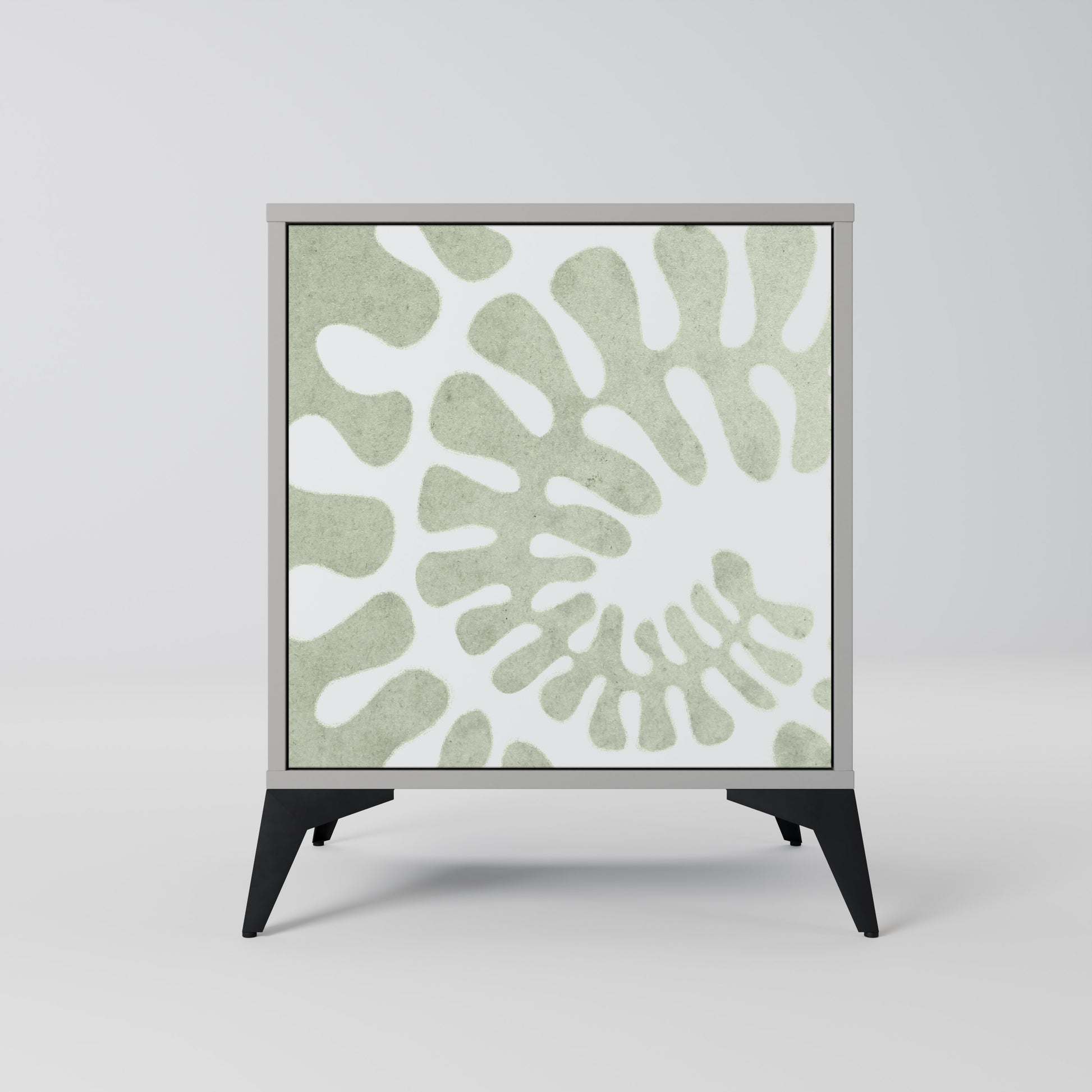 This compact yet remarkably elegant piece of furniture impresses with its minimalist design, perfectly fitting into both modern and classic interiors. The subdued grey color of the body gives the furniture a subtle yet distinctive character, while the fronts with a unique print add an artistic touch.