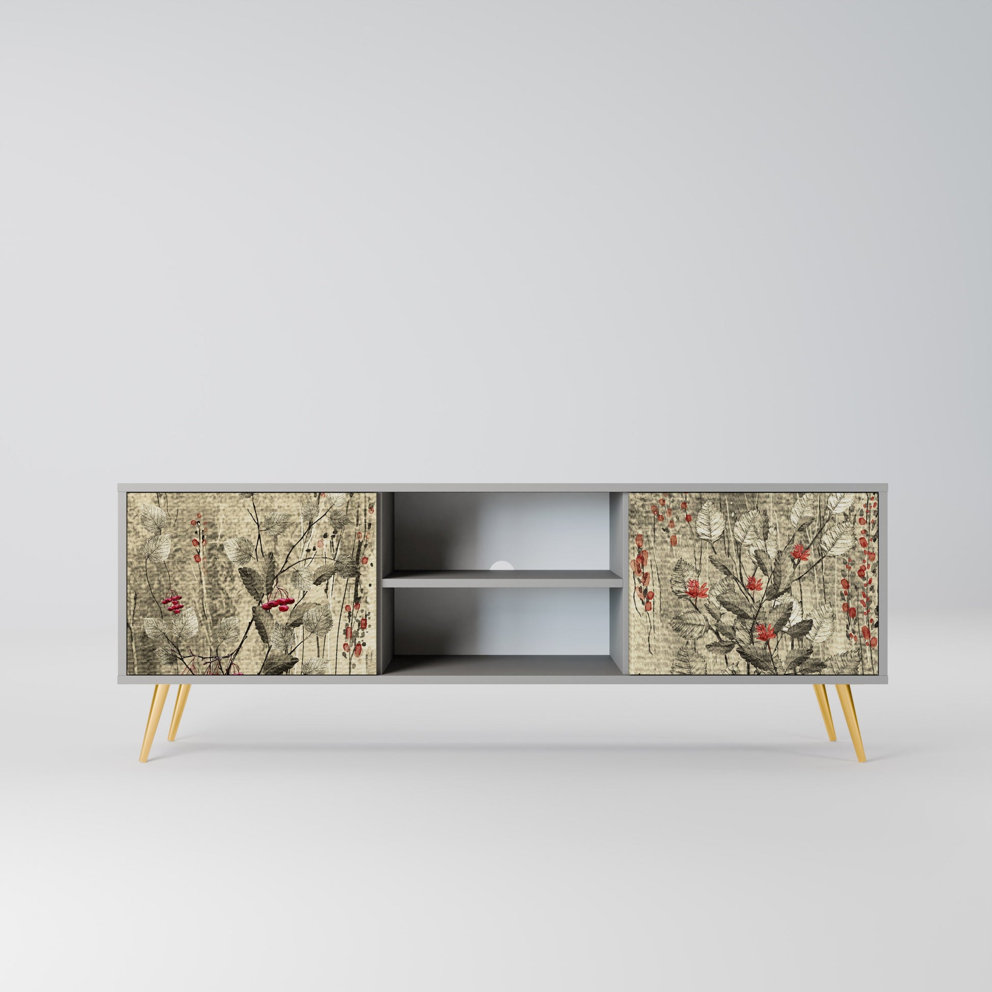 The grey body lends the TV stand a contemporary, refined look, while the fronts with an exceptional print capture attention, becoming the focal point of any room. The spacious interior provides room for electronic devices, cables, remotes, and other accessories, helping you maintain order and organization.