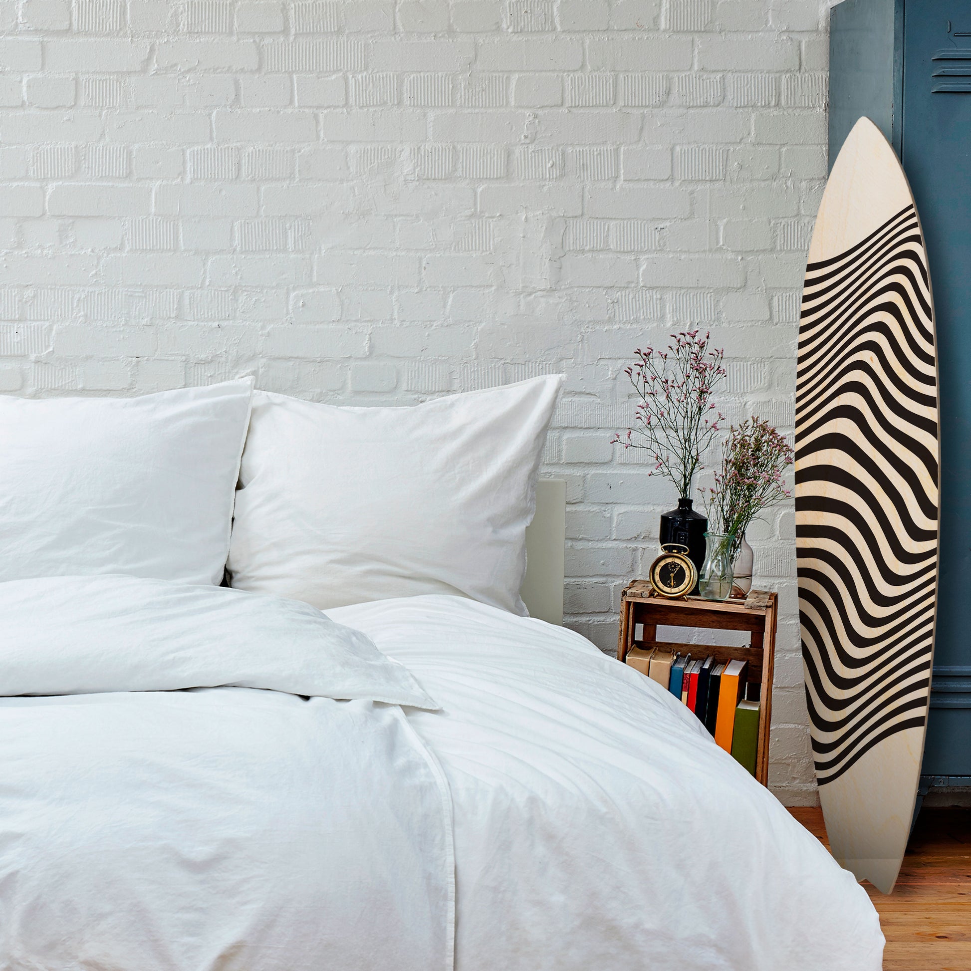 The surfboard has been designed with maximum functionality and arrangement flexibility in mind. It can be hung vertically or horizontally, or displayed freestanding by leaning it against a wall, dresser, or shelf. This makes it easy to adapt the piece to the character of the space and changing interior needs.