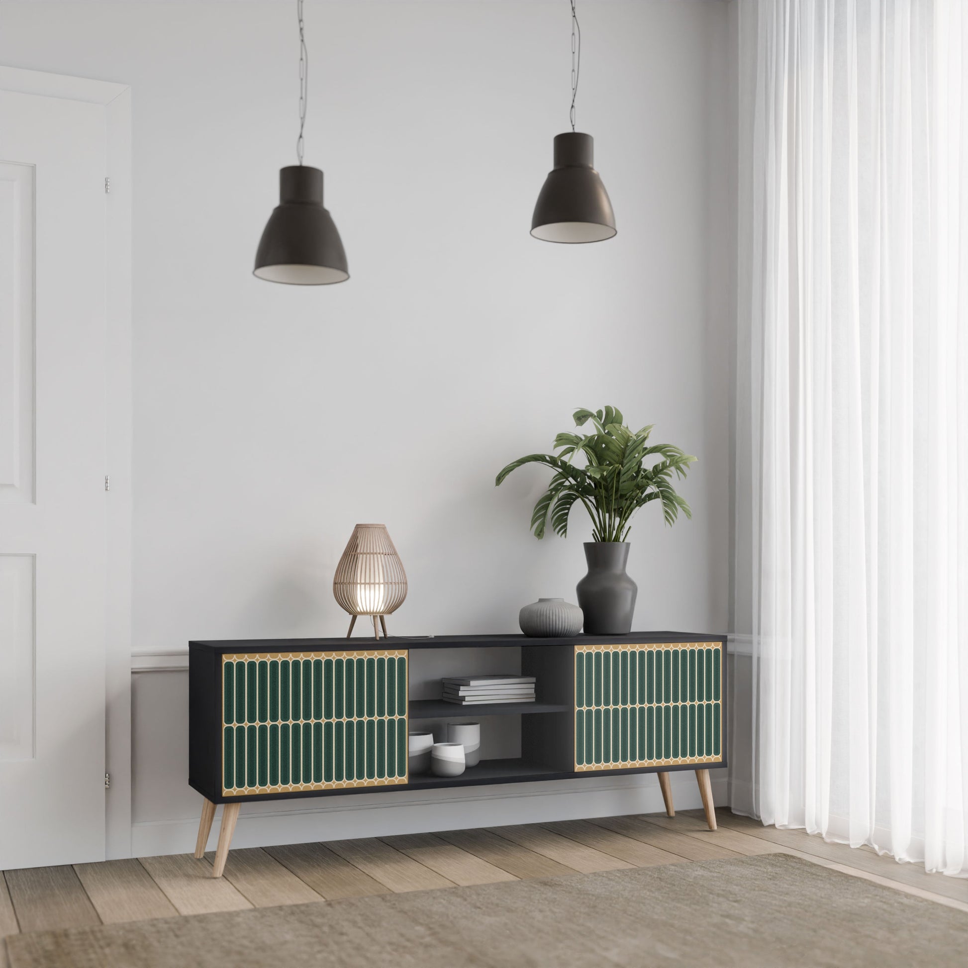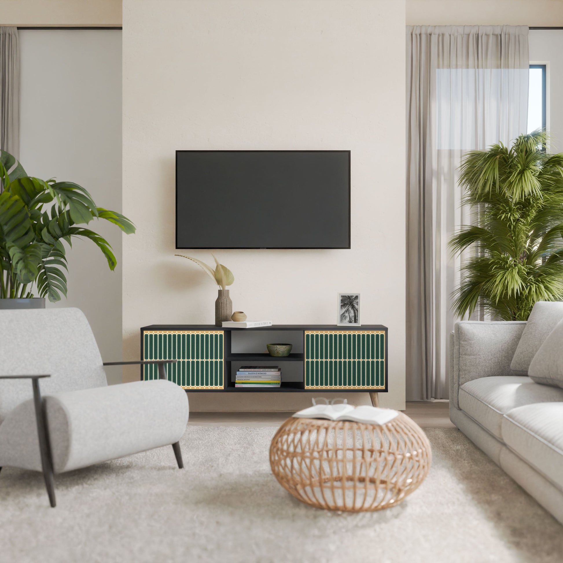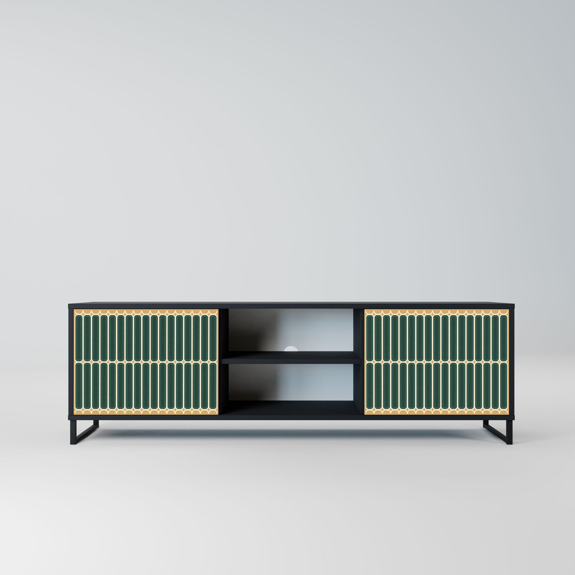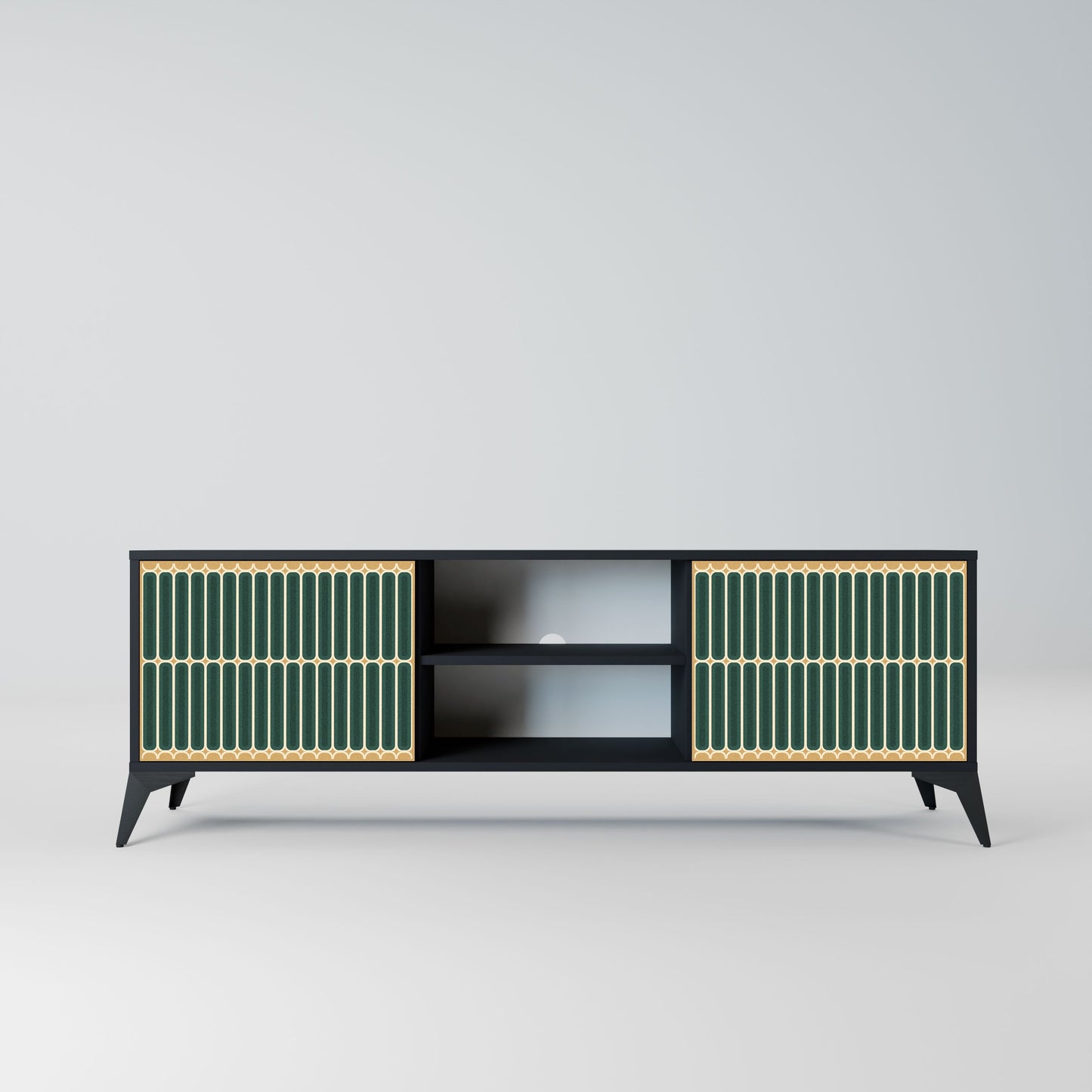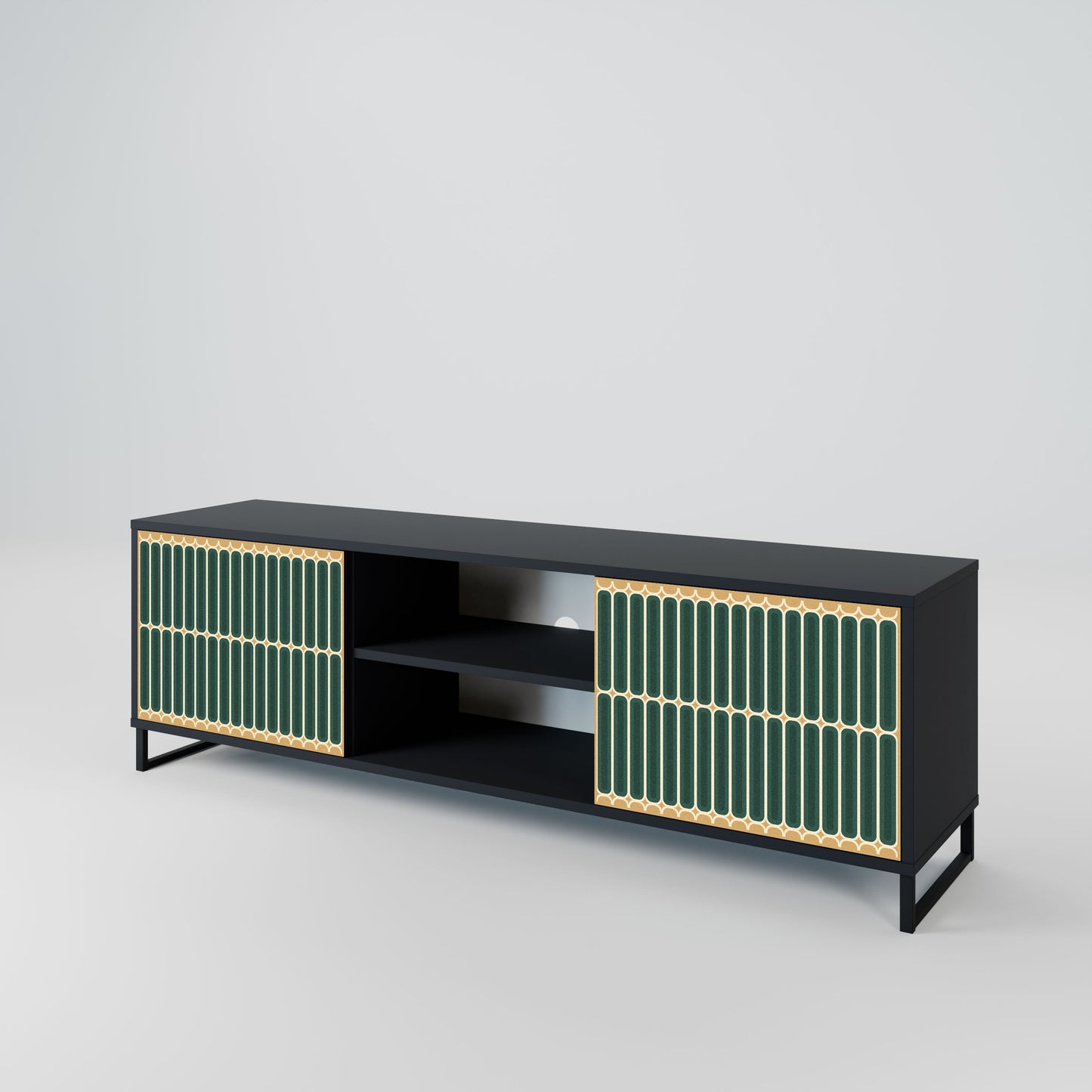 The black body gives the TV stand an elegant, modern look, while the fronts with an exceptional print draw attention, making it the focal point of any room. The spacious interior provides room for electronic devices, cables, remotes, and other accessories, helping you maintain order and organization.