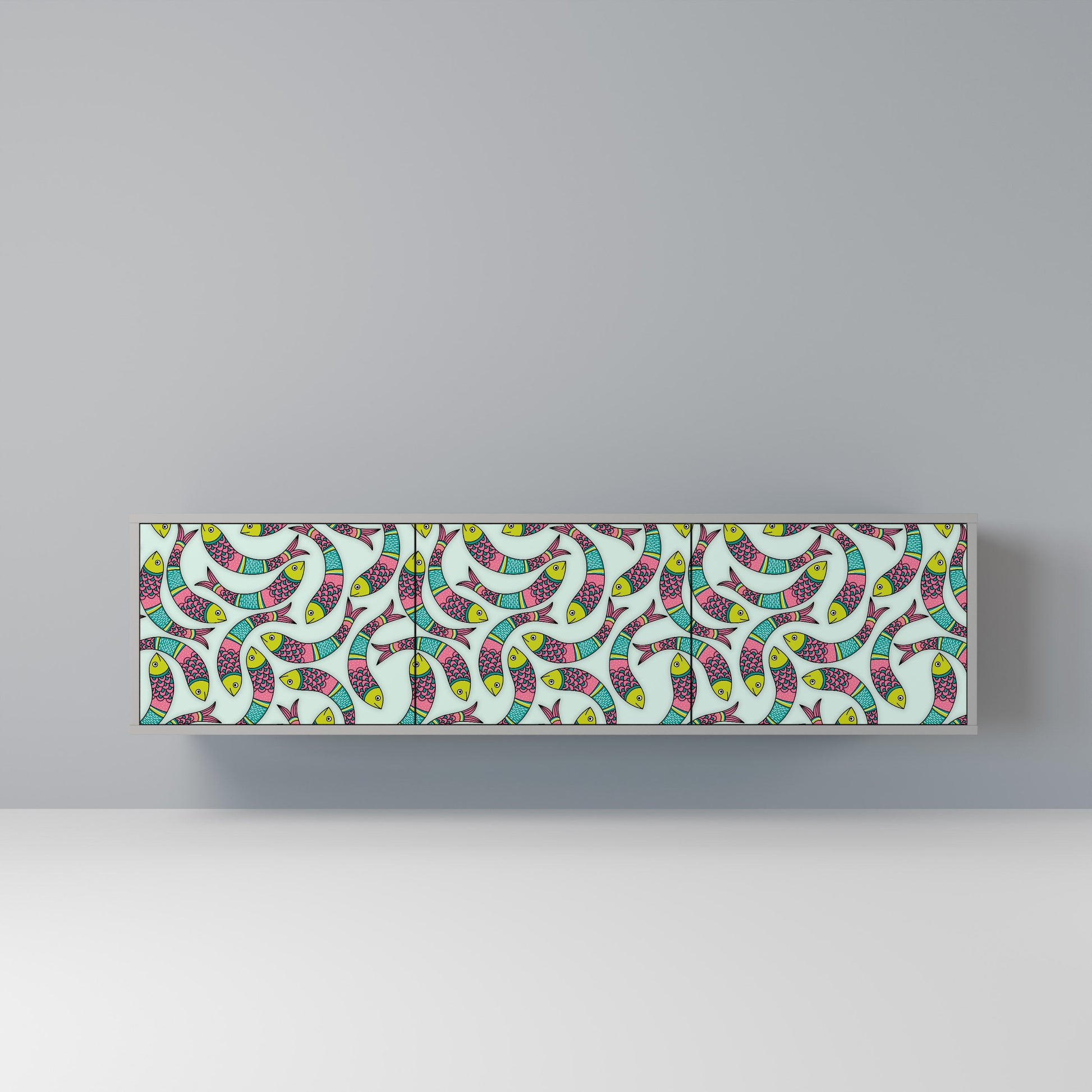 The grey body of the stand creates a refined, modern accent that pairs beautifully with industrial and minimalist arrangements. The fronts with a designer print add character and uniqueness, making this piece not only practical but also a standout decorative element.