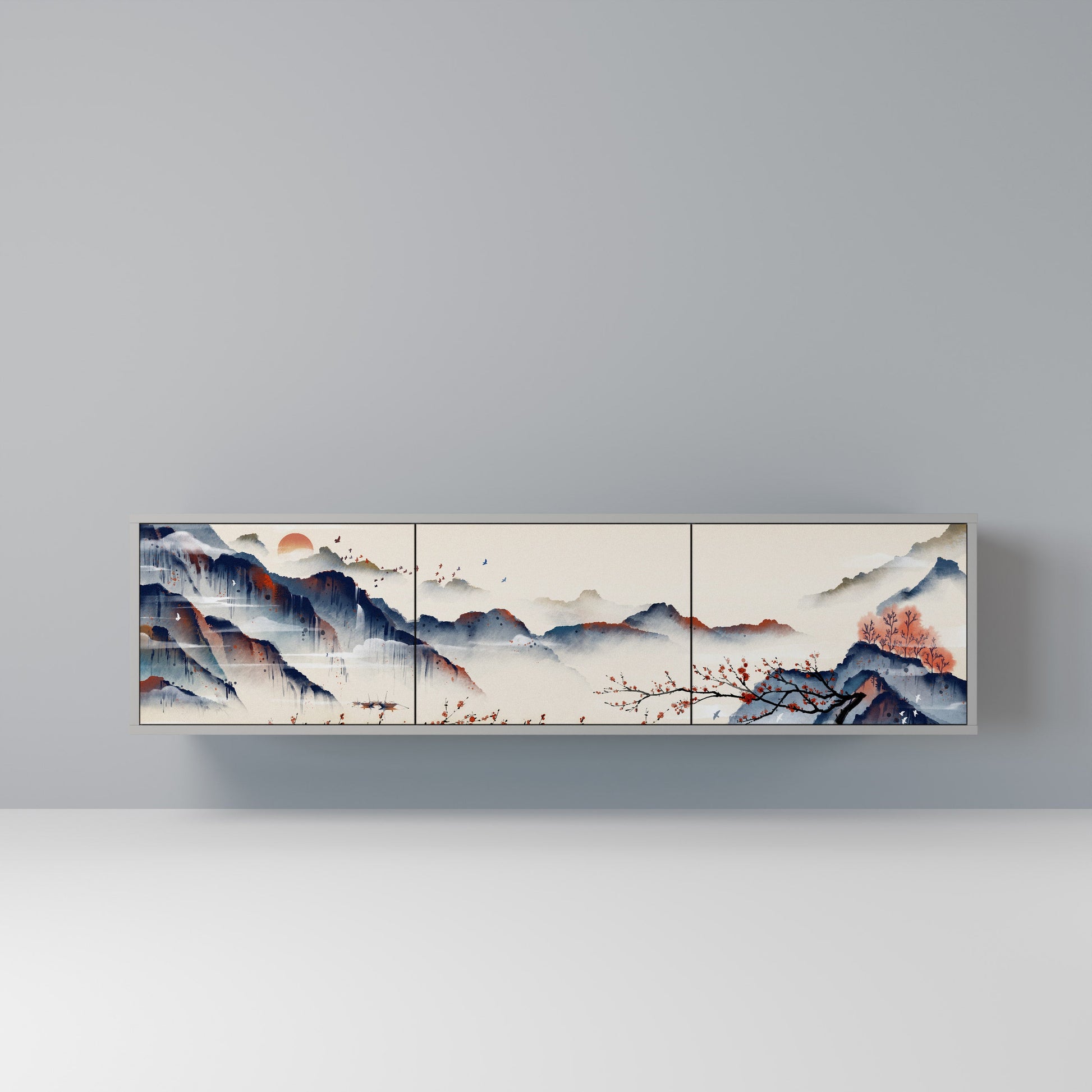 JAPANESE LANDSCAPE 3-Door TV Stand in Grey Finish
