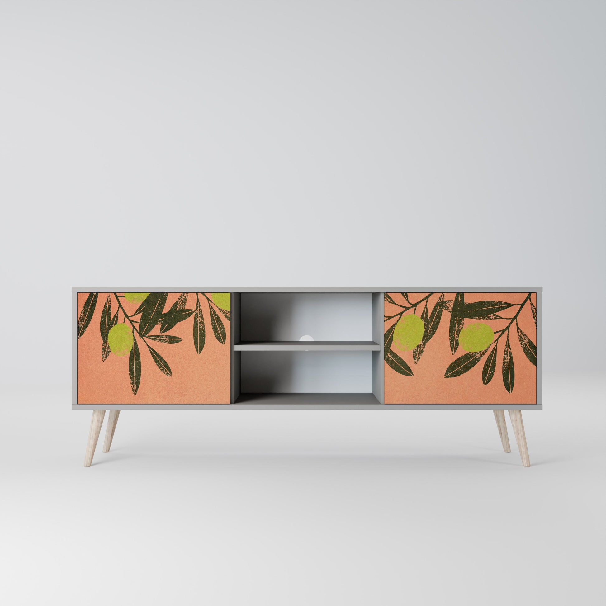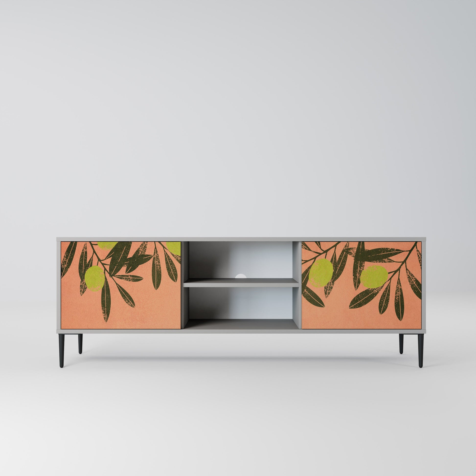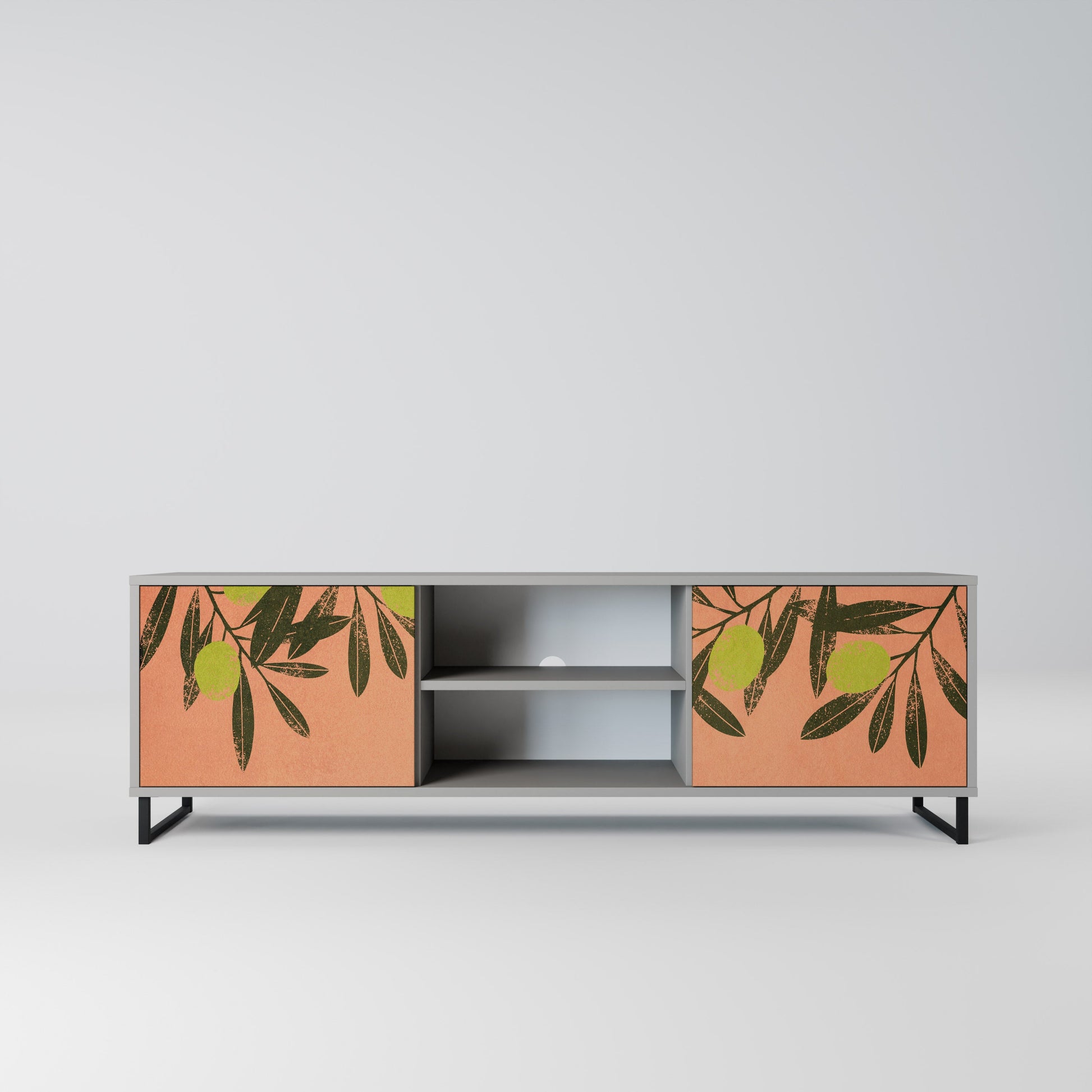The grey body lends the TV stand a contemporary, refined look, while the fronts with an exceptional print capture attention, becoming the focal point of any room. The spacious interior provides room for electronic devices, cables, remotes, and other accessories, helping you maintain order and organization.