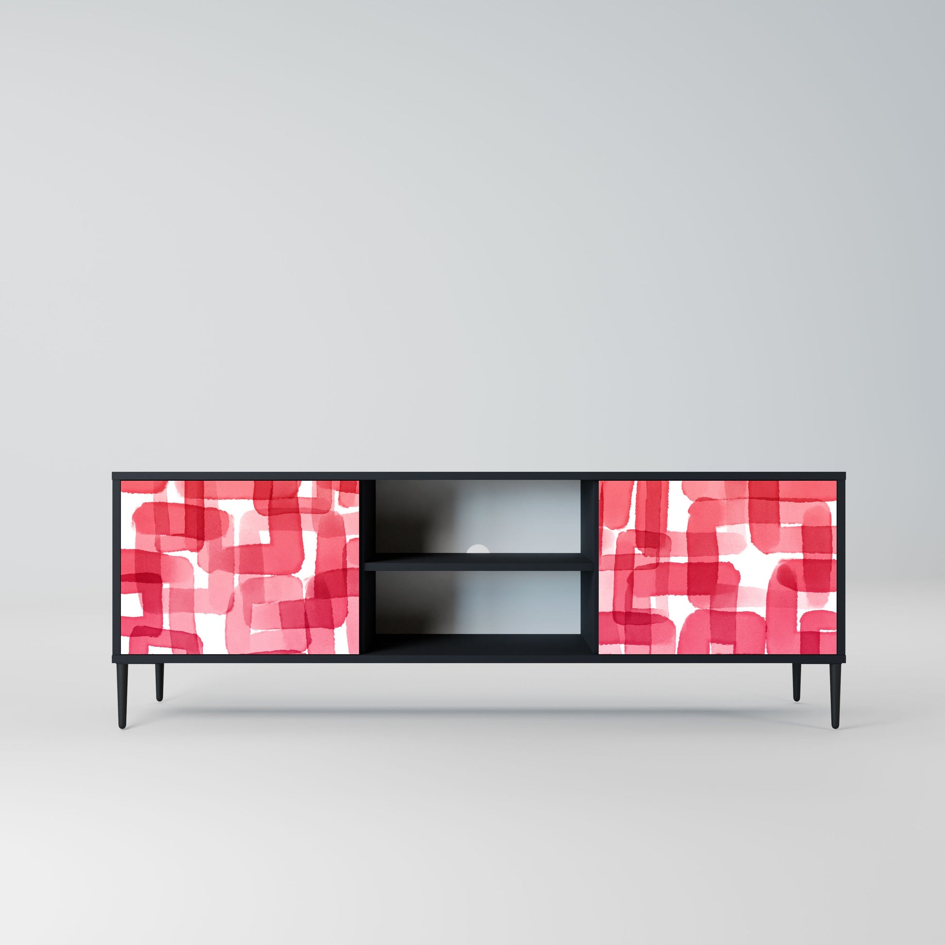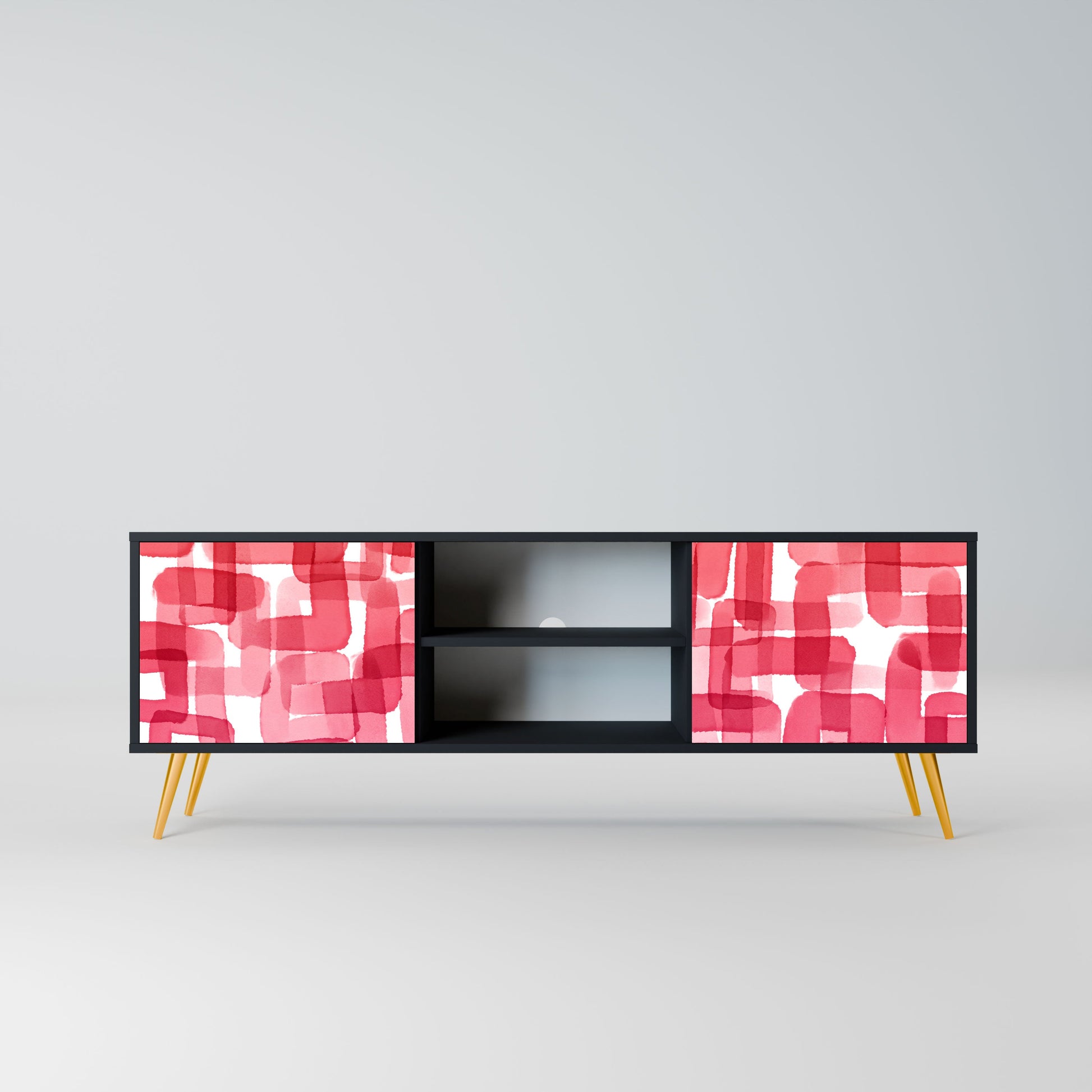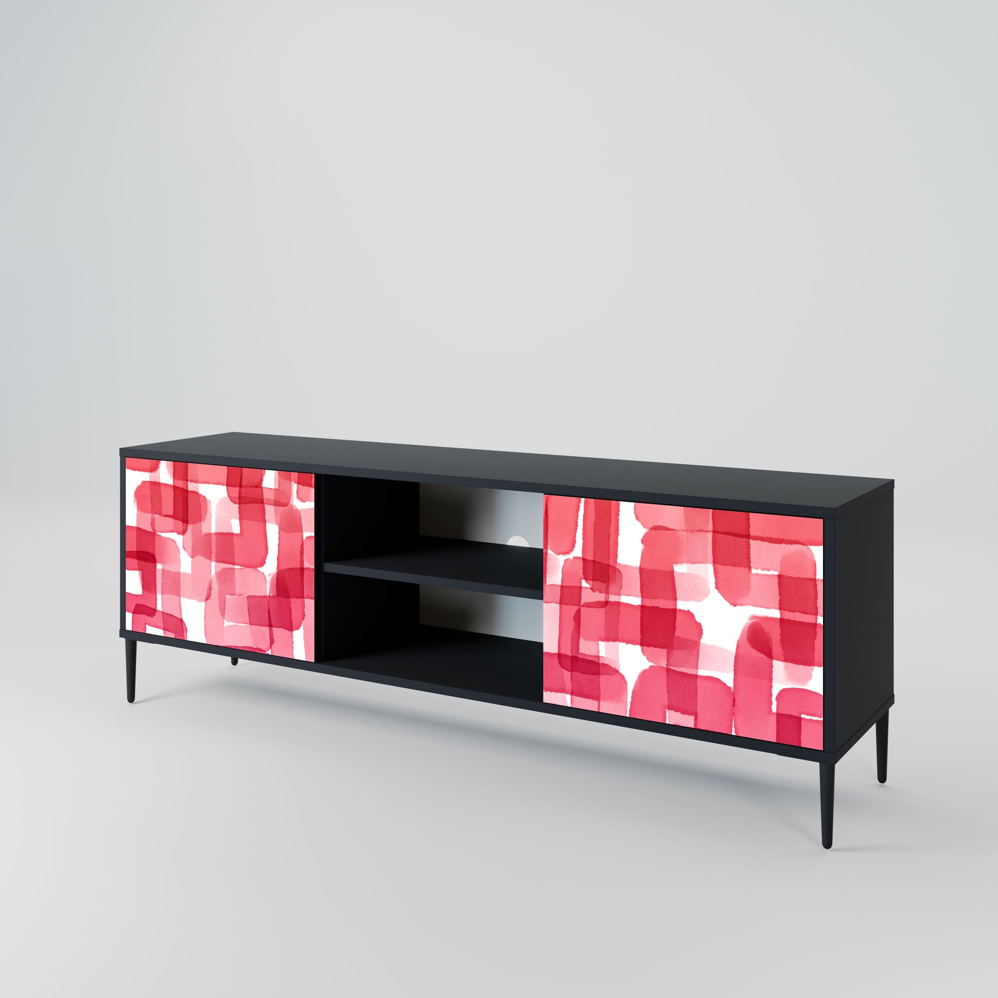 The black body gives the TV stand an elegant, modern look, while the fronts with an exceptional print draw attention, making it the focal point of any room. The spacious interior provides room for electronic devices, cables, remotes, and other accessories, helping you maintain order and organization.