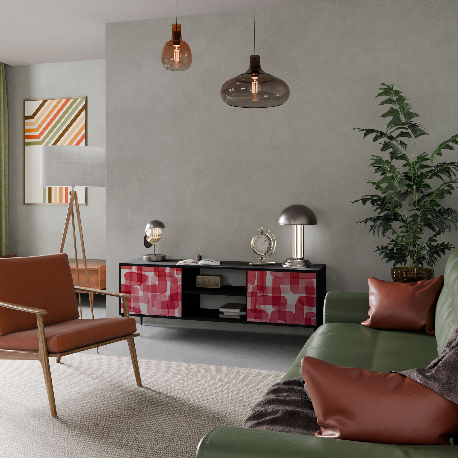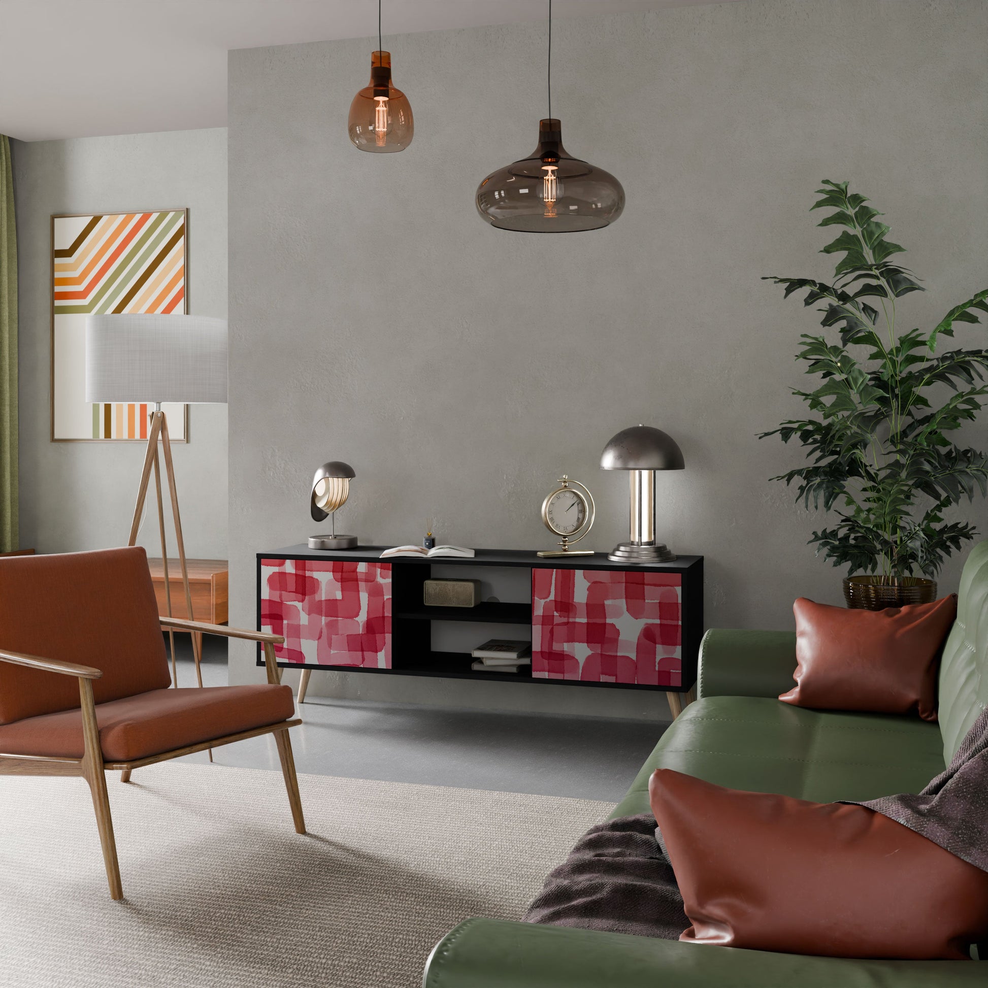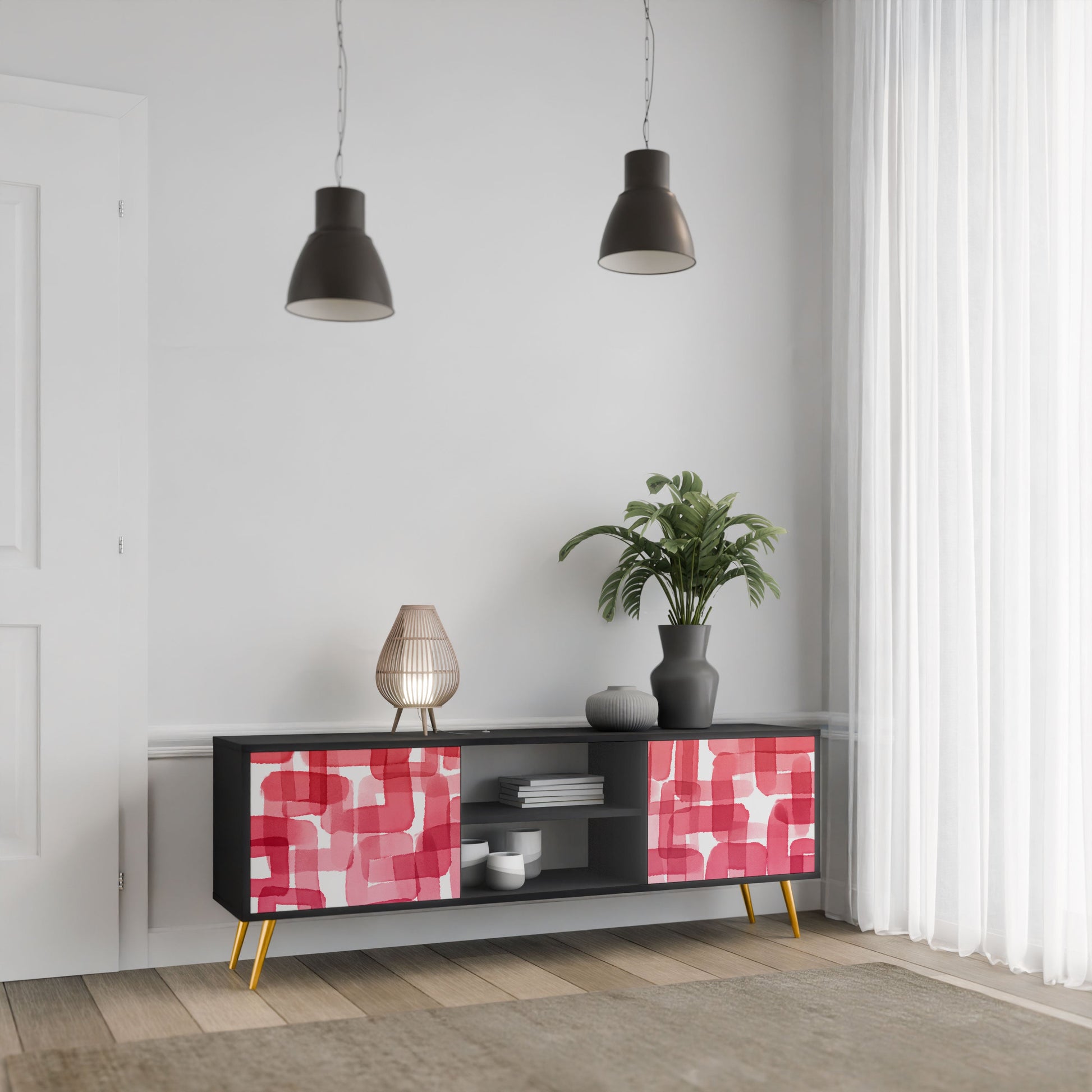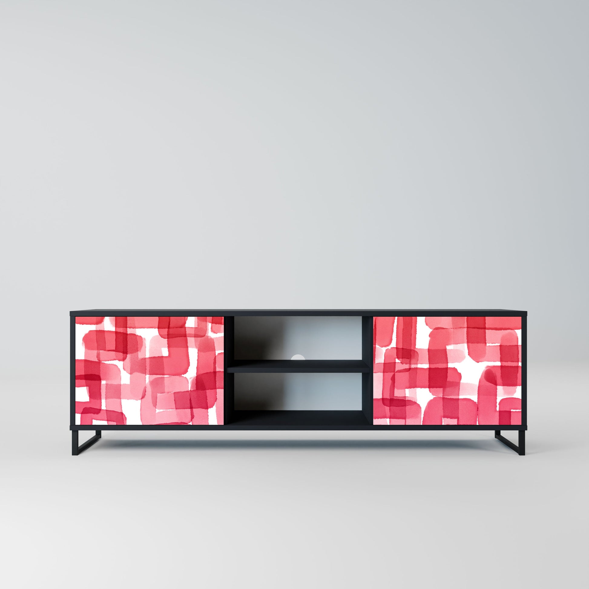 The black body gives the TV stand an elegant, modern look, while the fronts with an exceptional print draw attention, making it the focal point of any room. The spacious interior provides room for electronic devices, cables, remotes, and other accessories, helping you maintain order and organization.