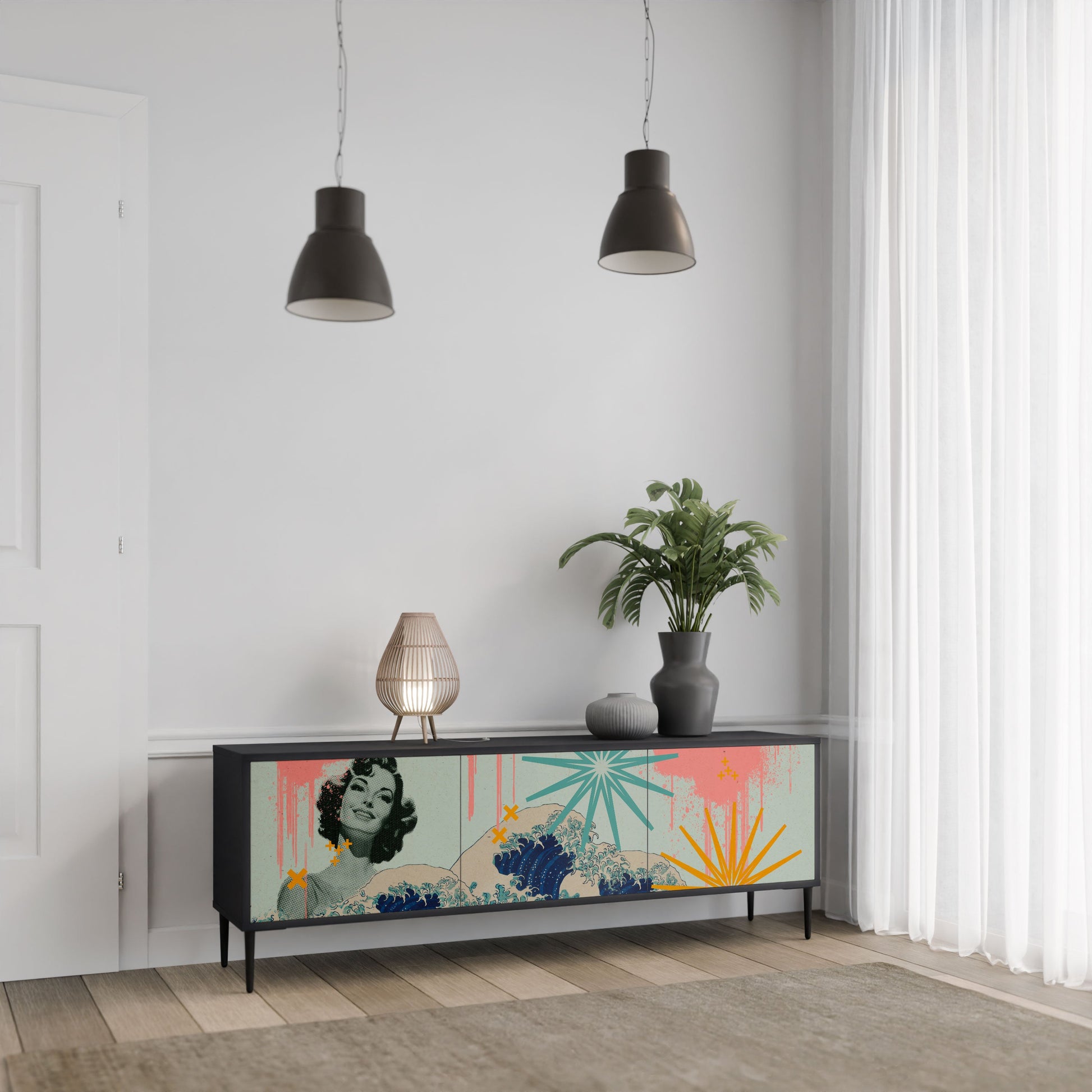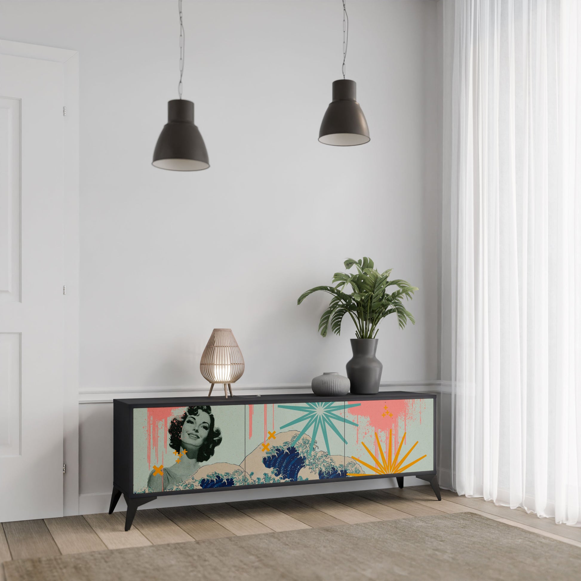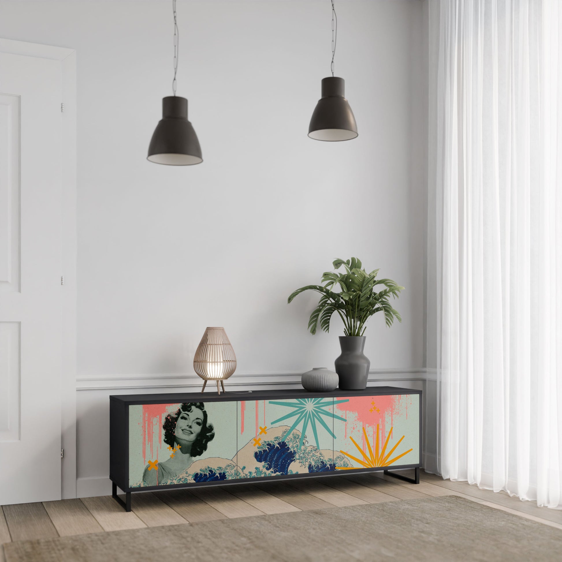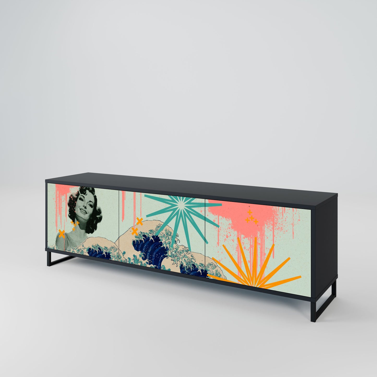 The black body of the stand creates a bold, modern accent that pairs beautifully with industrial and minimalist arrangements. The fronts with a designer print add character and uniqueness, making this piece not only practical but also a standout decorative element.