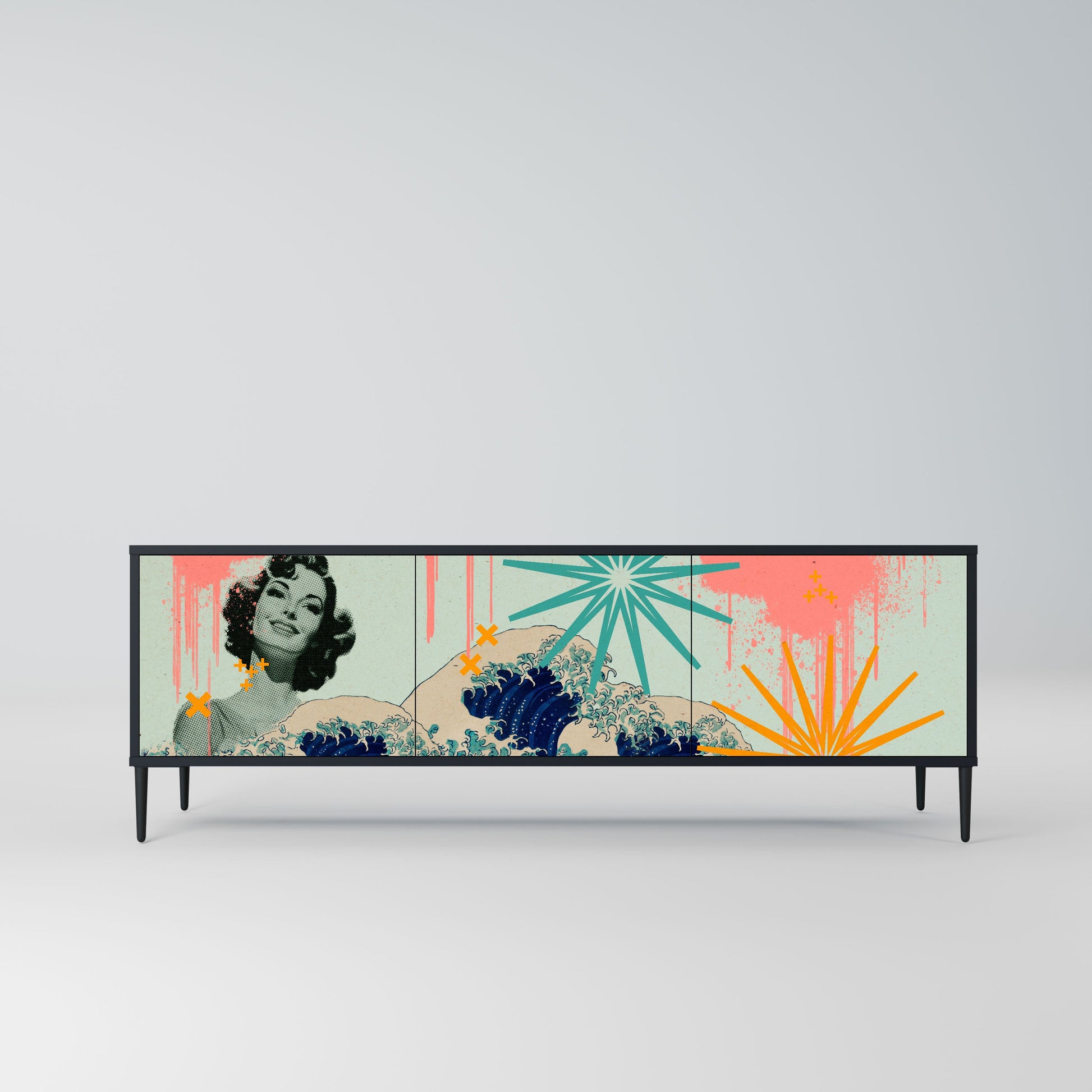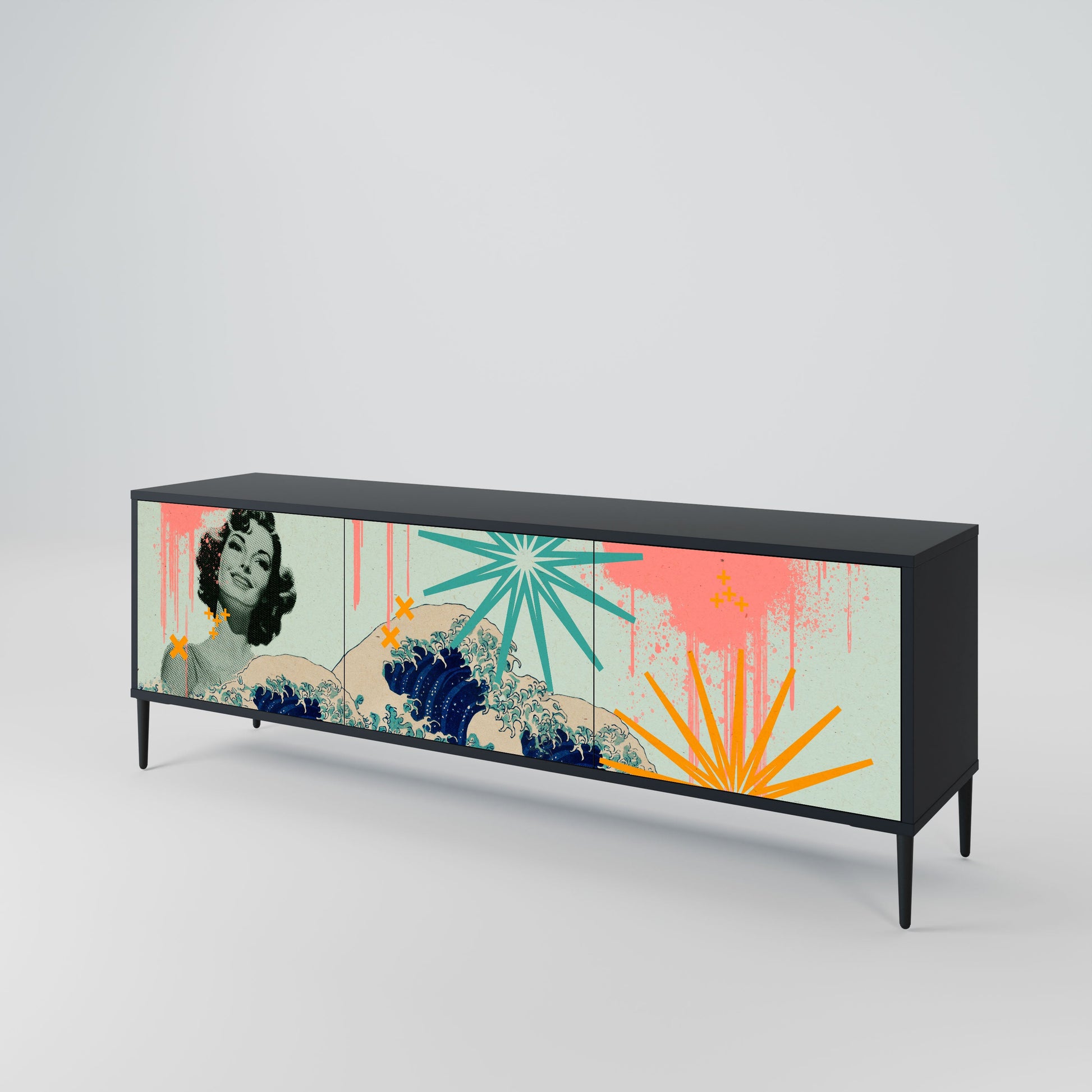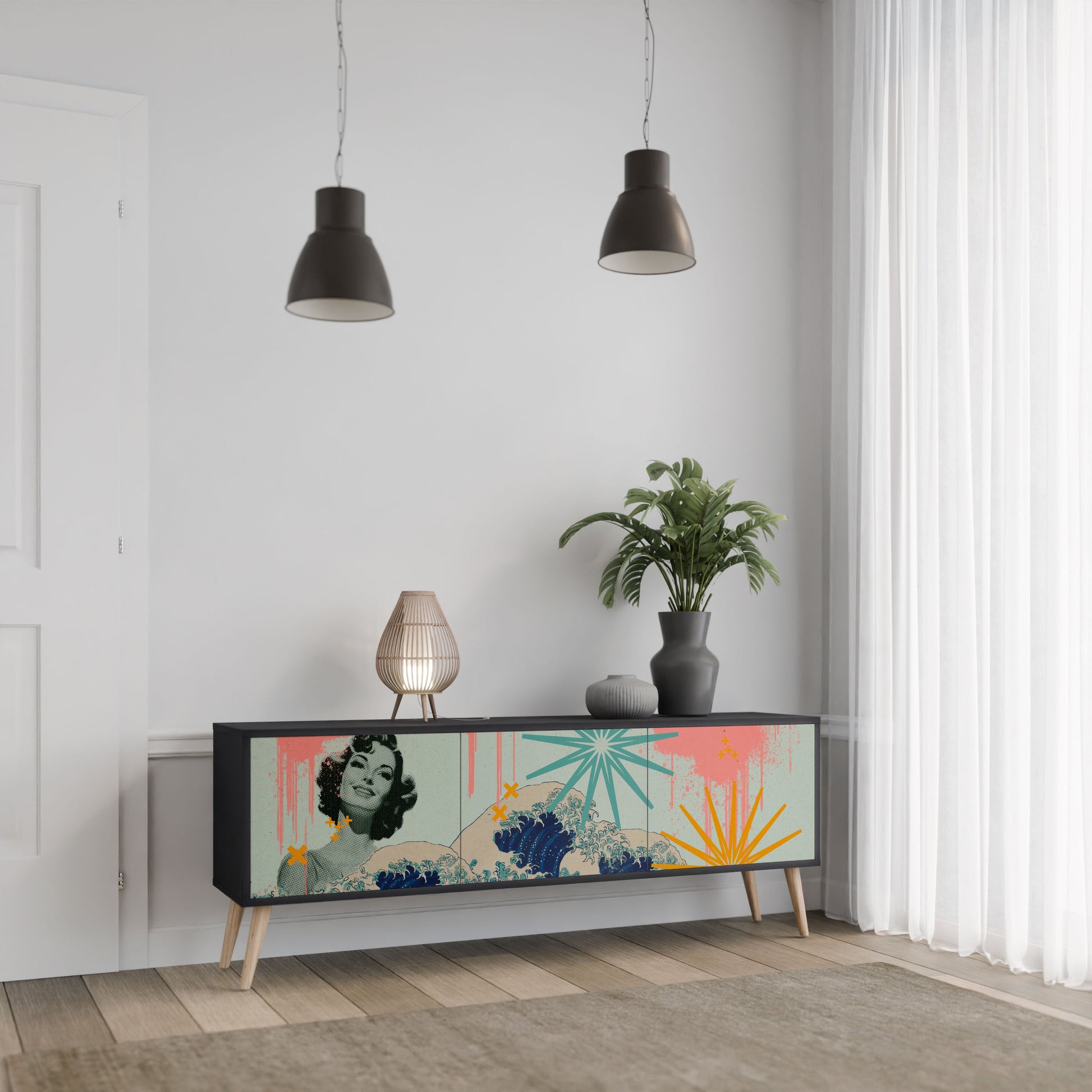 The black body of the stand creates a bold, modern accent that pairs beautifully with industrial and minimalist arrangements. The fronts with a designer print add character and uniqueness, making this piece not only practical but also a standout decorative element.