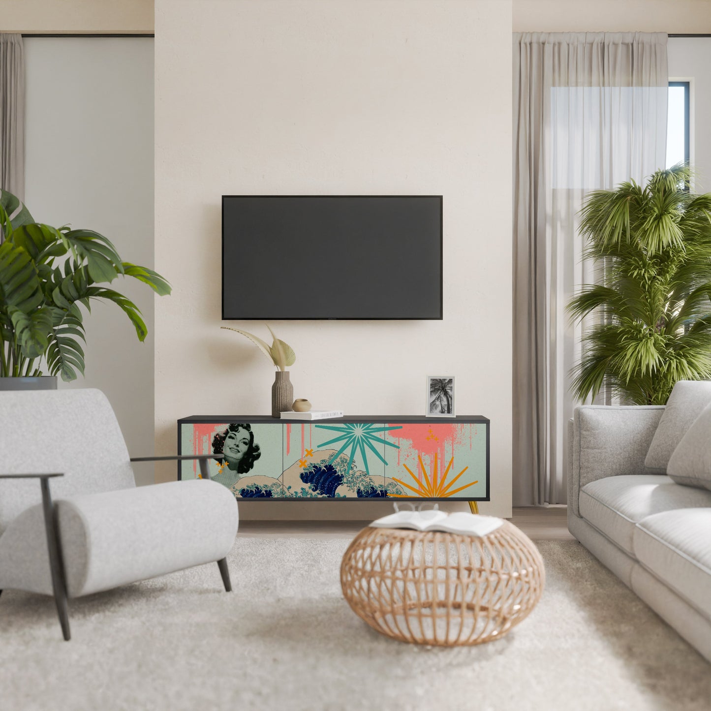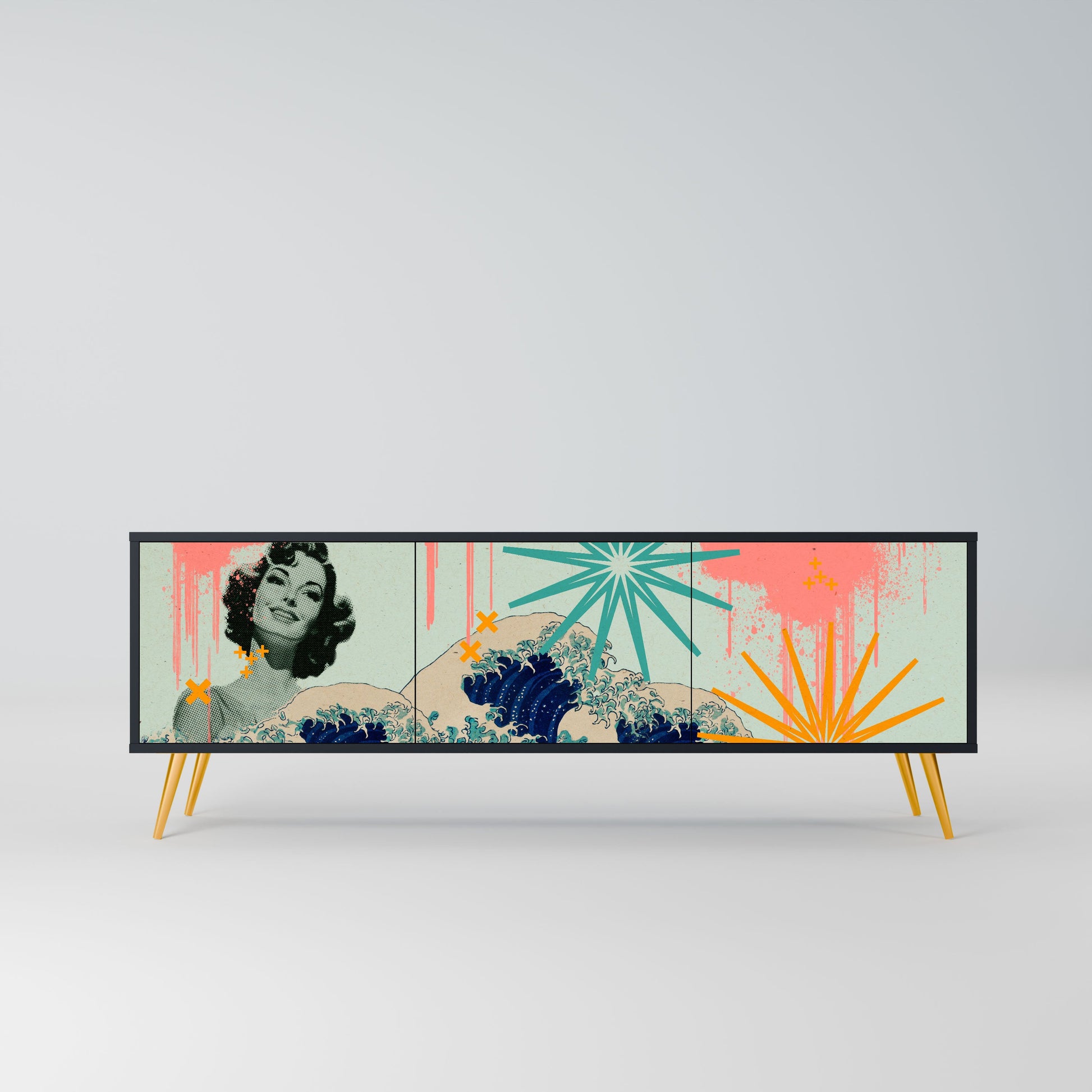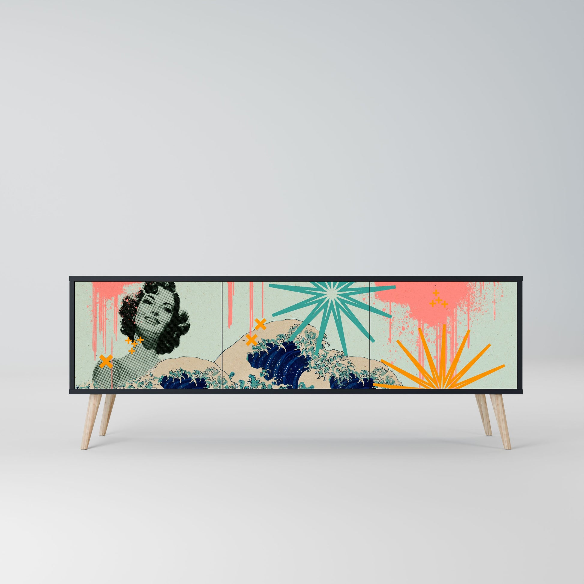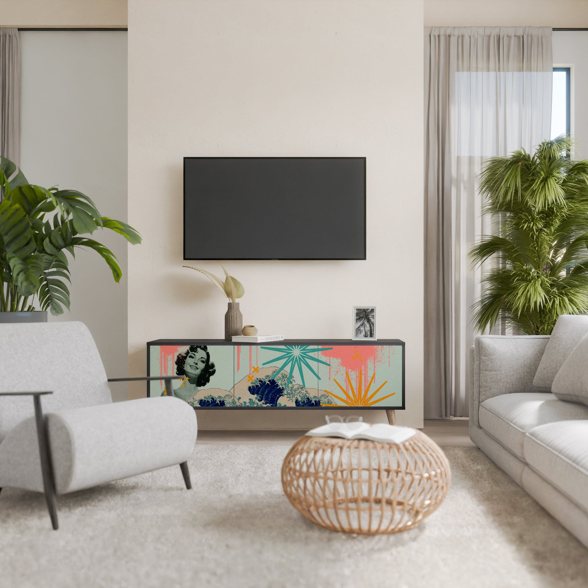 The black body of the stand creates a bold, modern accent that pairs beautifully with industrial and minimalist arrangements. The fronts with a designer print add character and uniqueness, making this piece not only practical but also a standout decorative element.