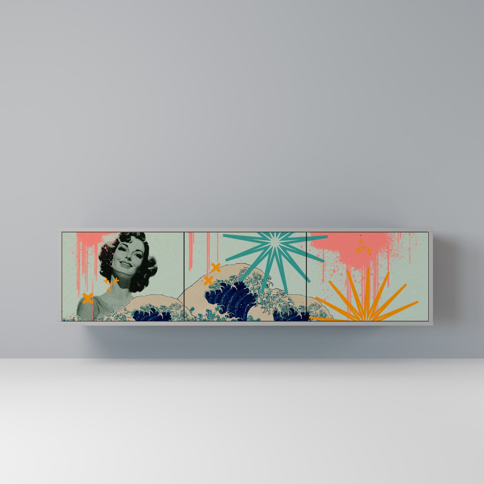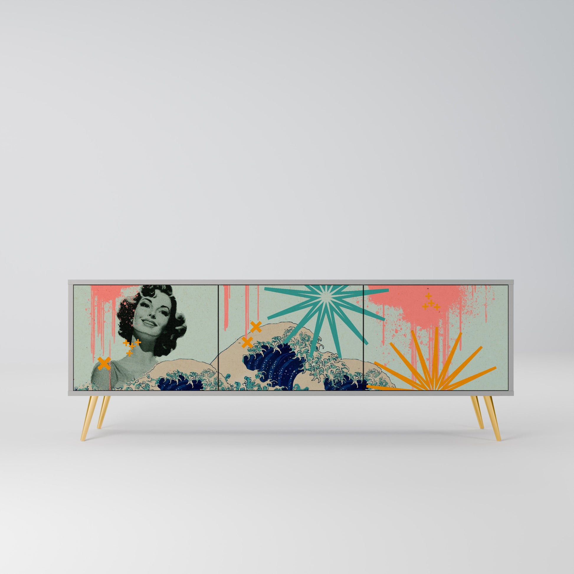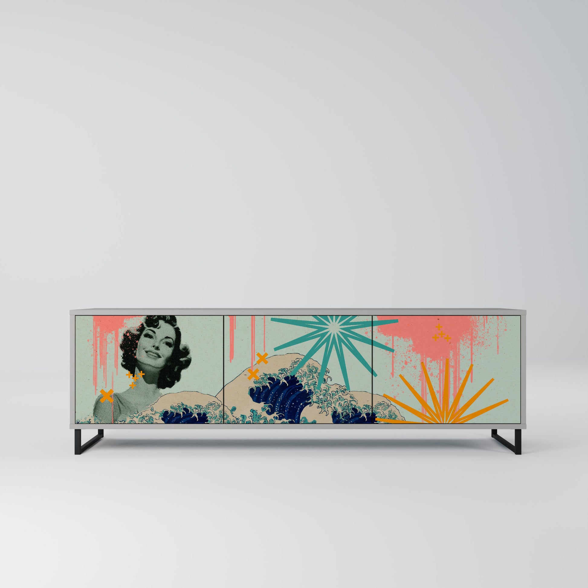 The grey body of the stand creates a refined, modern accent that pairs beautifully with industrial and minimalist arrangements. The fronts with a designer print add character and uniqueness, making this piece not only practical but also a standout decorative element.