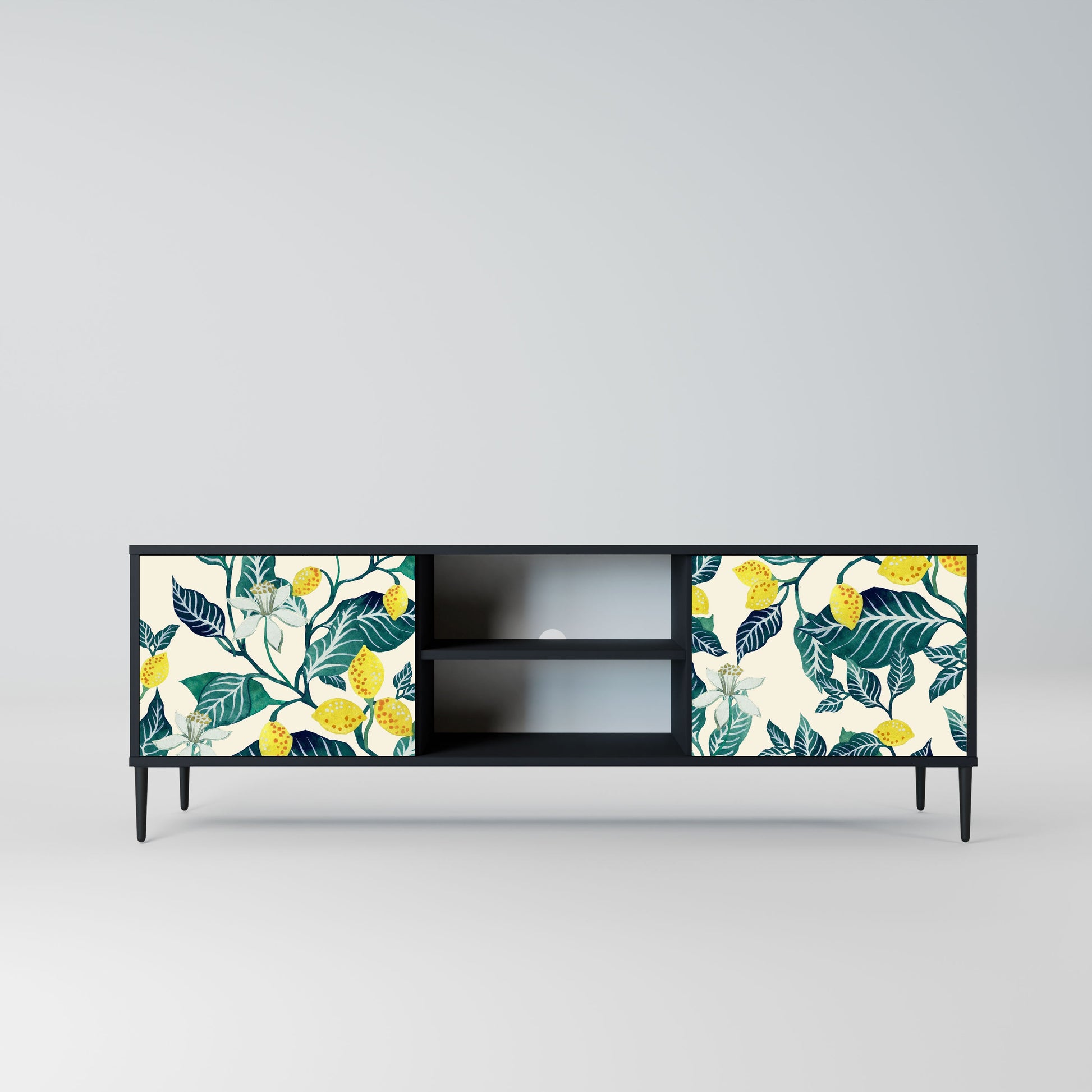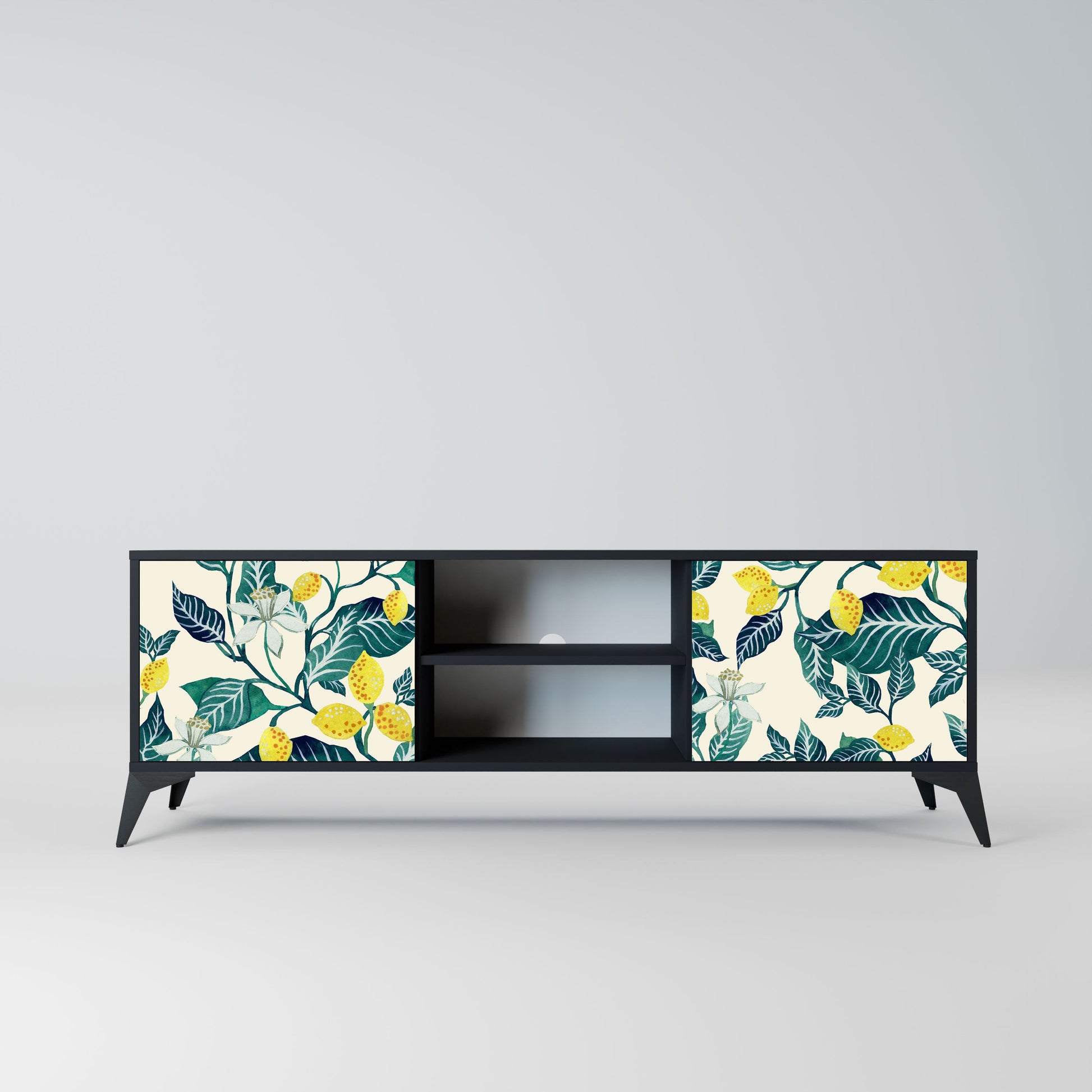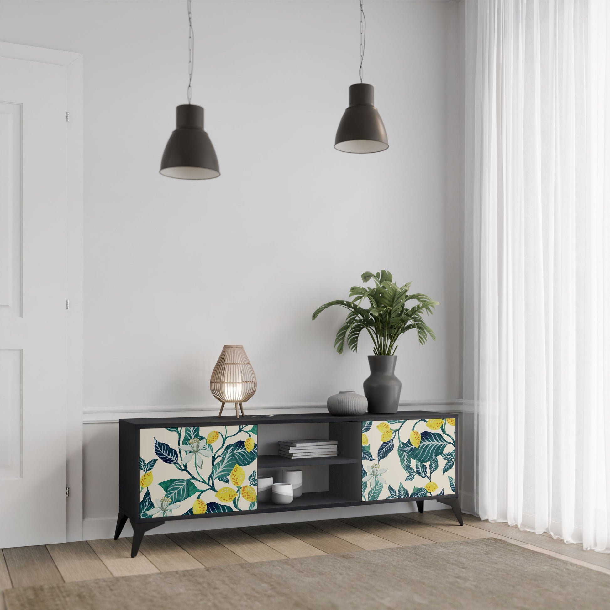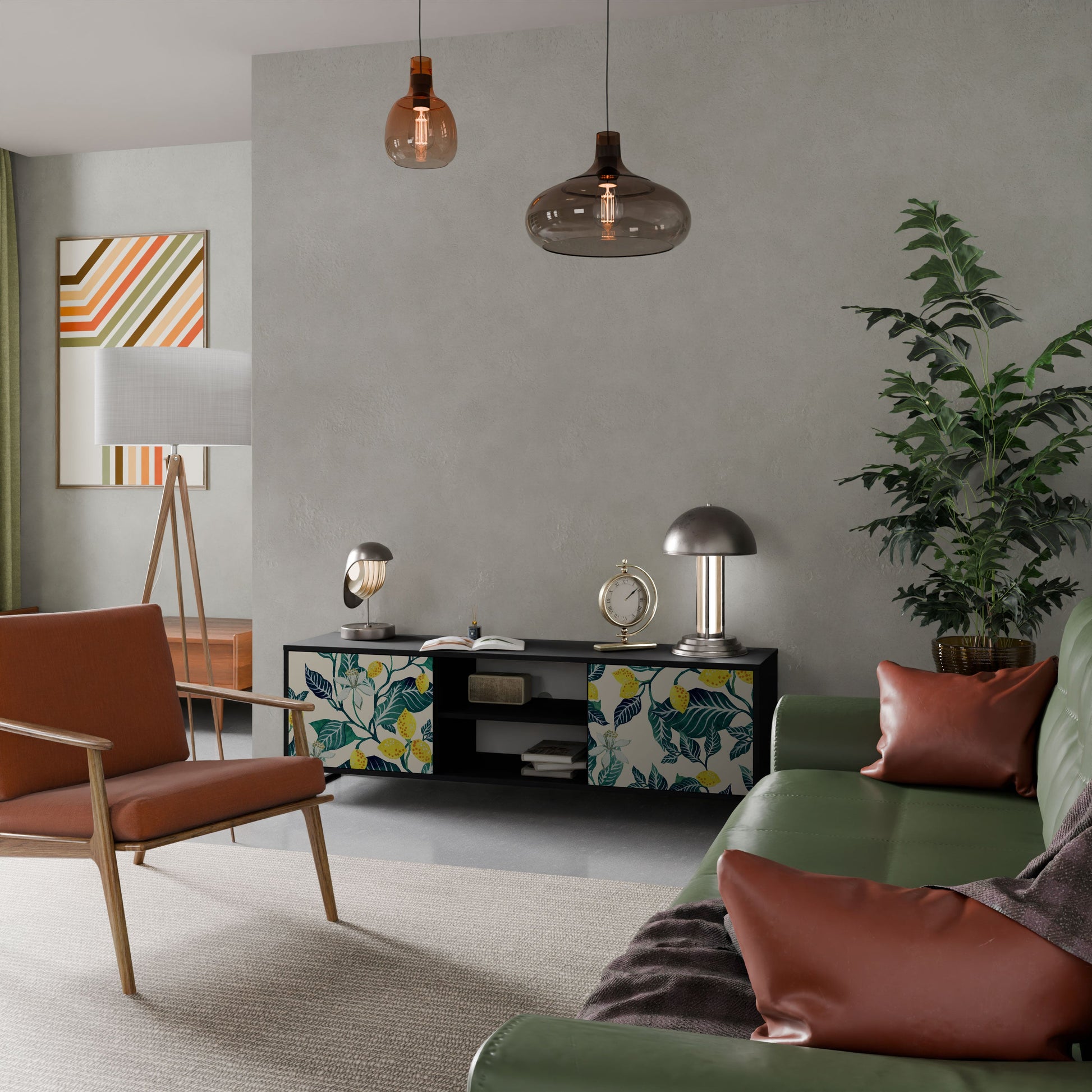 The black body gives the TV stand an elegant, modern look, while the fronts with an exceptional print draw attention, making it the focal point of any room. The spacious interior provides room for electronic devices, cables, remotes, and other accessories, helping you maintain order and organization.
