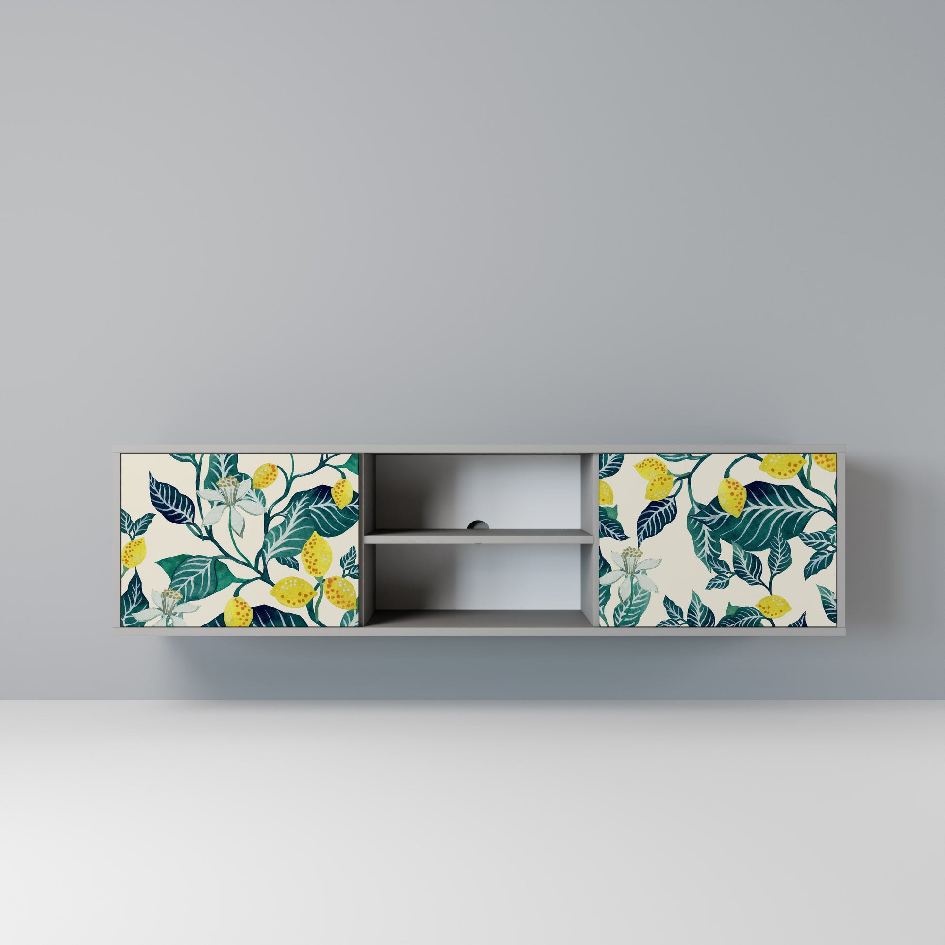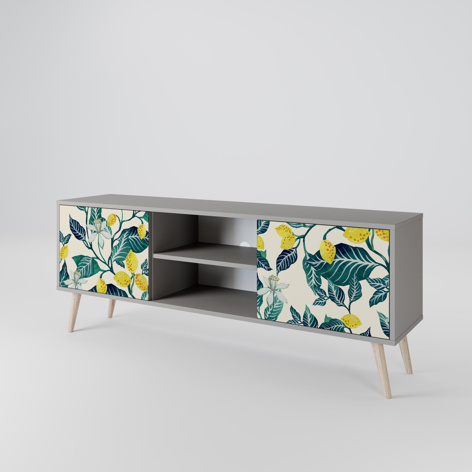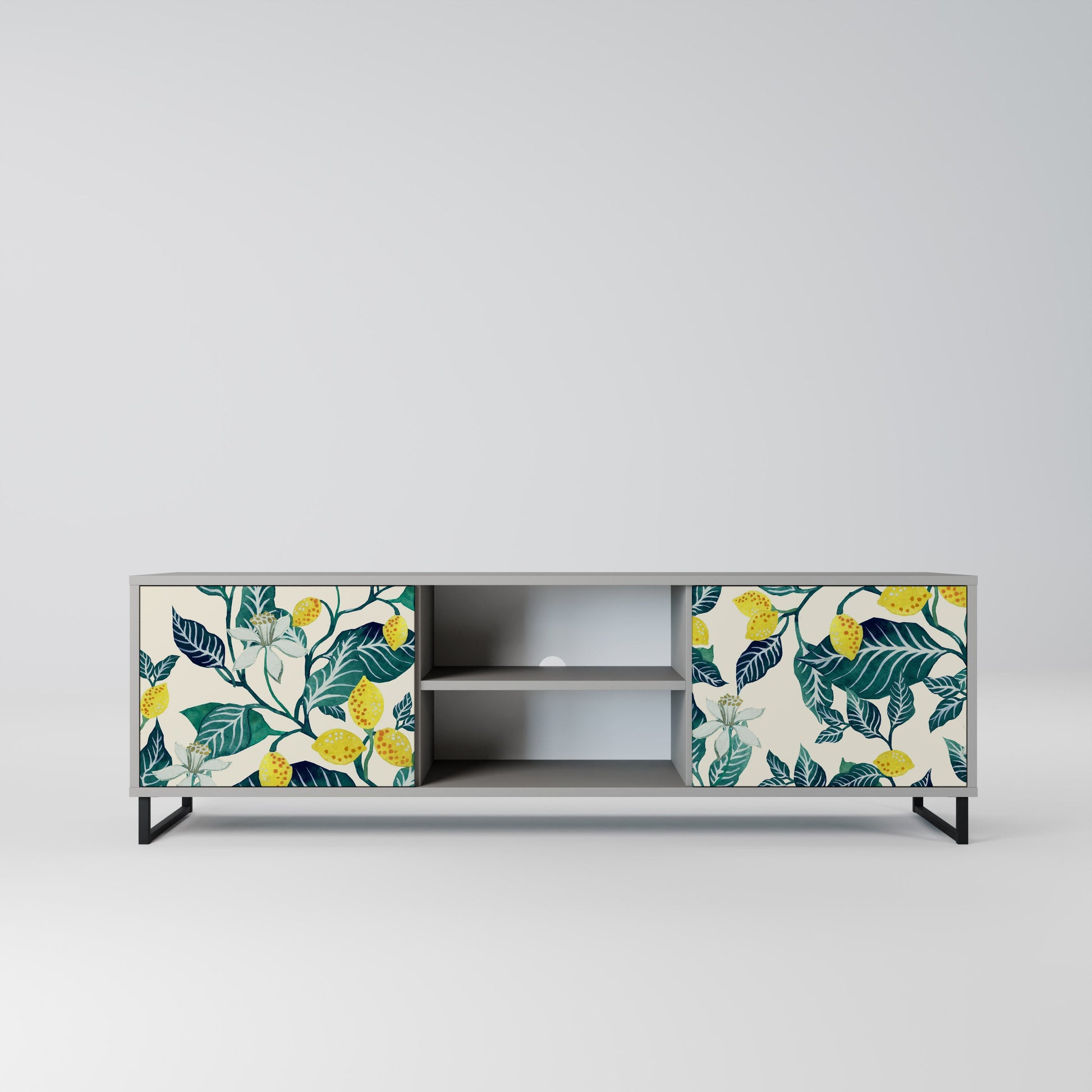 The grey body lends the TV stand a contemporary, refined look, while the fronts with an exceptional print capture attention, becoming the focal point of any room. The spacious interior provides room for electronic devices, cables, remotes, and other accessories, helping you maintain order and organization.