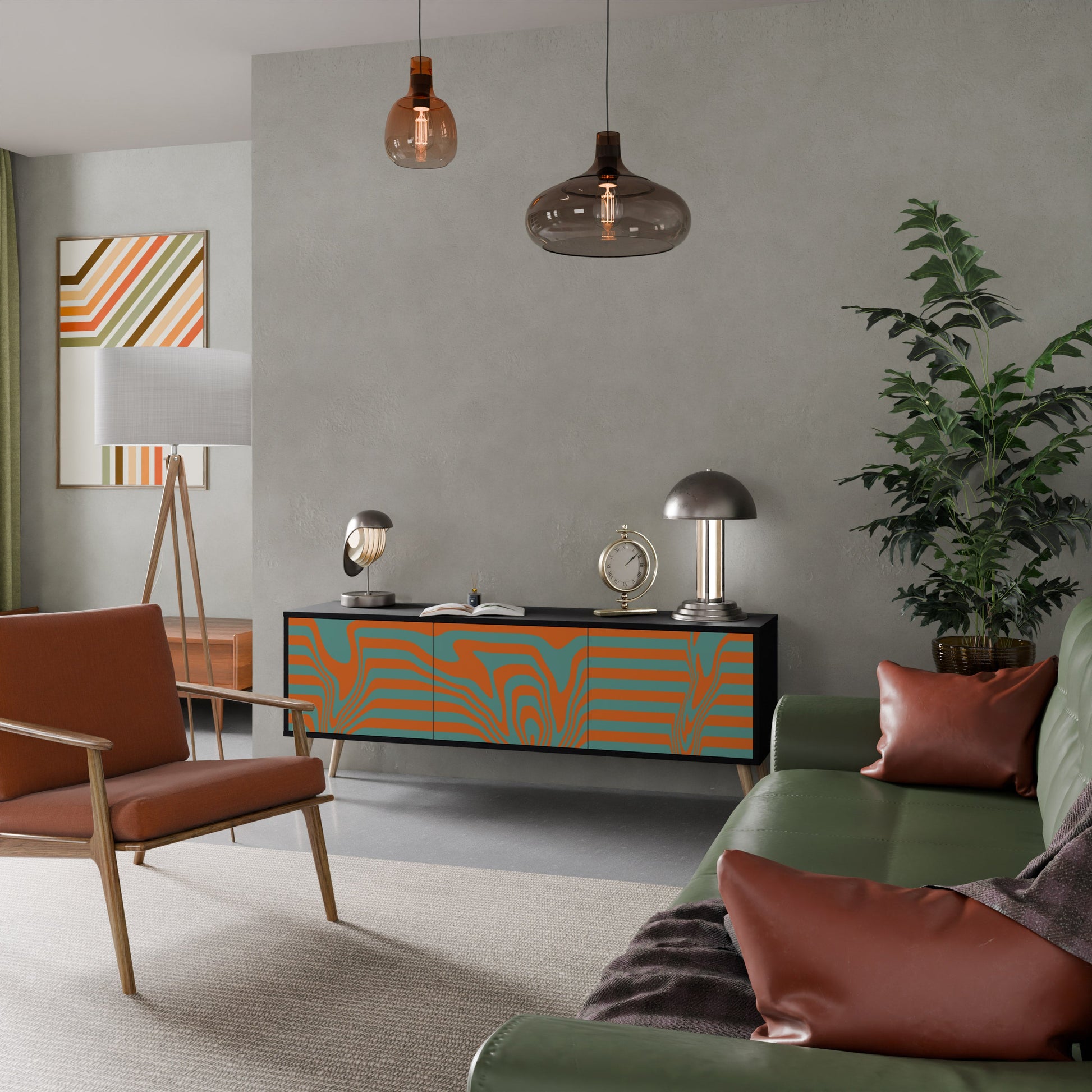 The black body of the stand creates a bold, modern accent that pairs beautifully with industrial and minimalist arrangements. The fronts with a designer print add character and uniqueness, making this piece not only practical but also a standout decorative element.