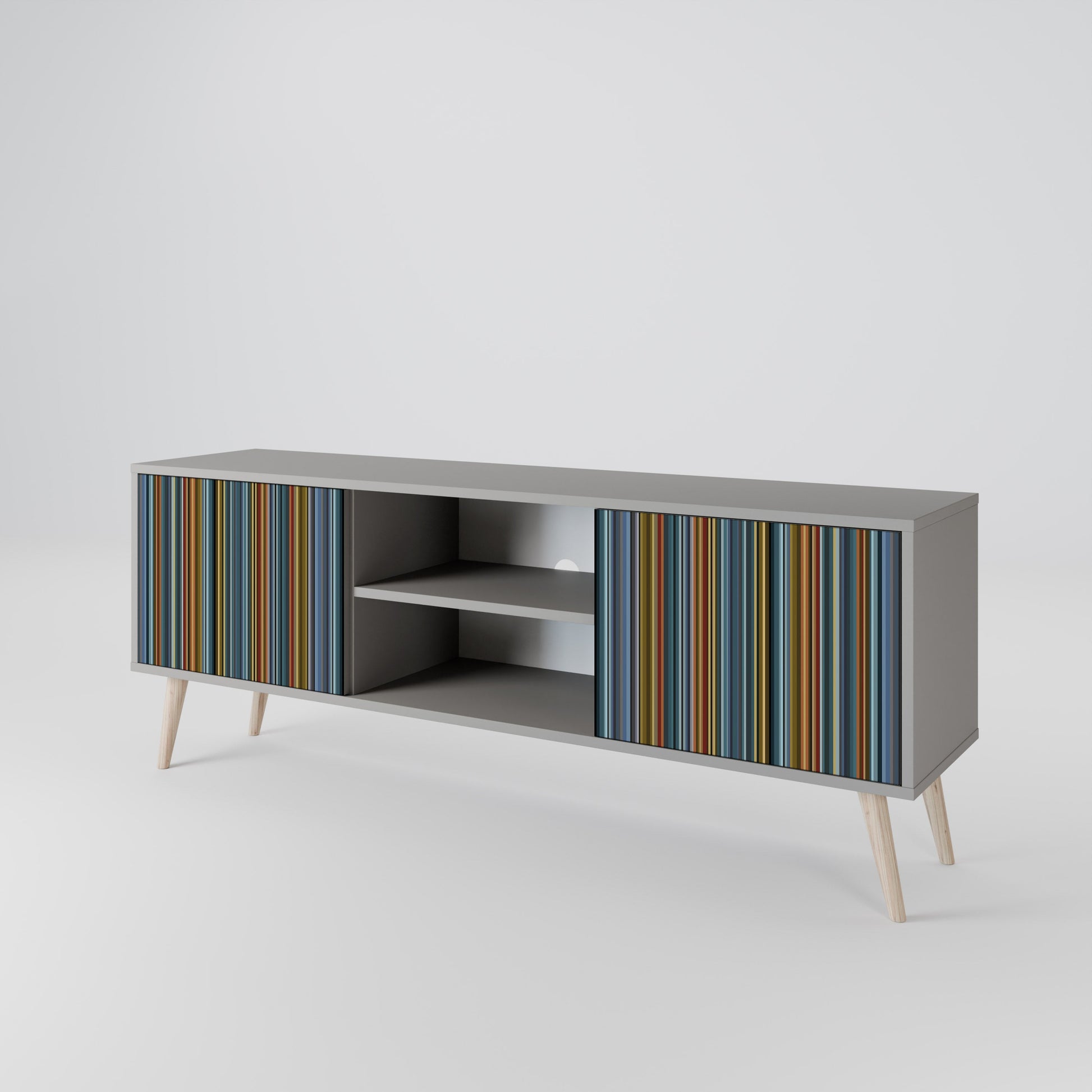 The grey body lends the TV stand a contemporary, refined look, while the fronts with an exceptional print capture attention, becoming the focal point of any room. The spacious interior provides room for electronic devices, cables, remotes, and other accessories, helping you maintain order and organization.