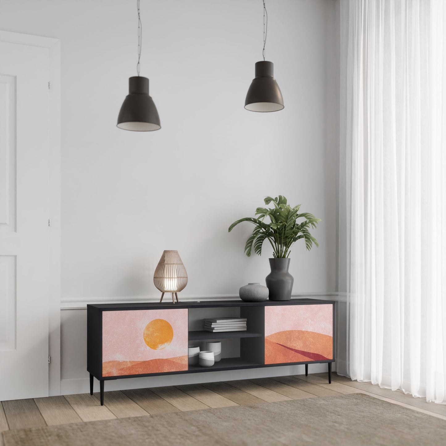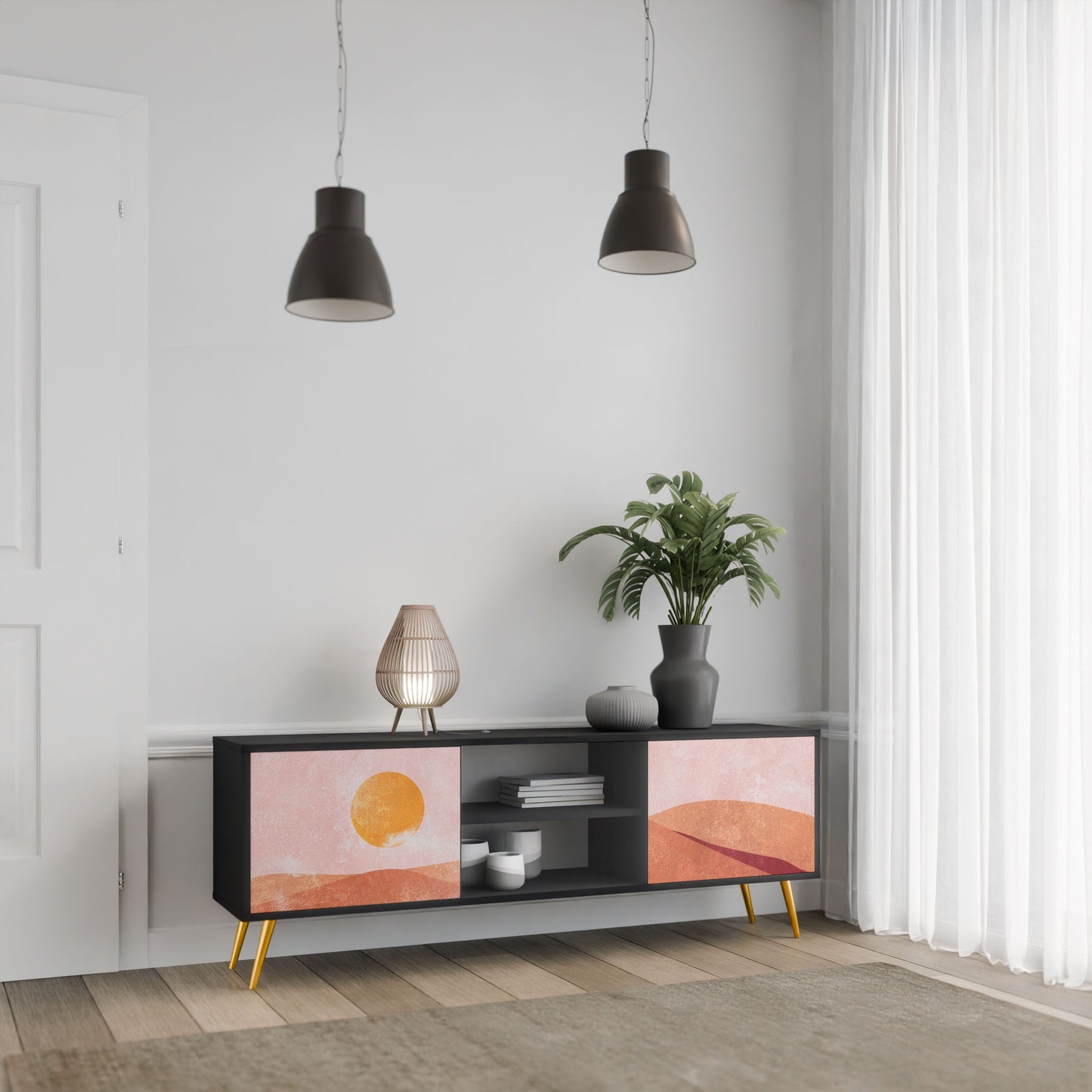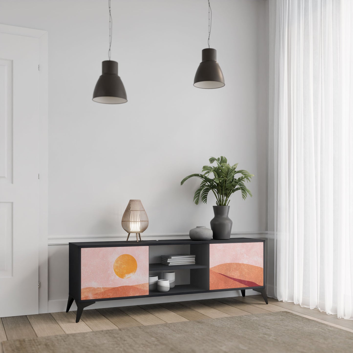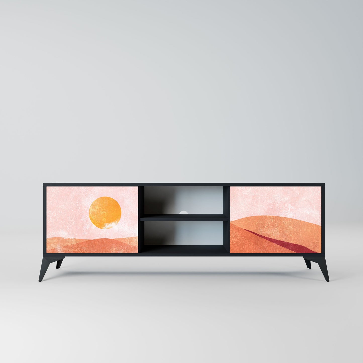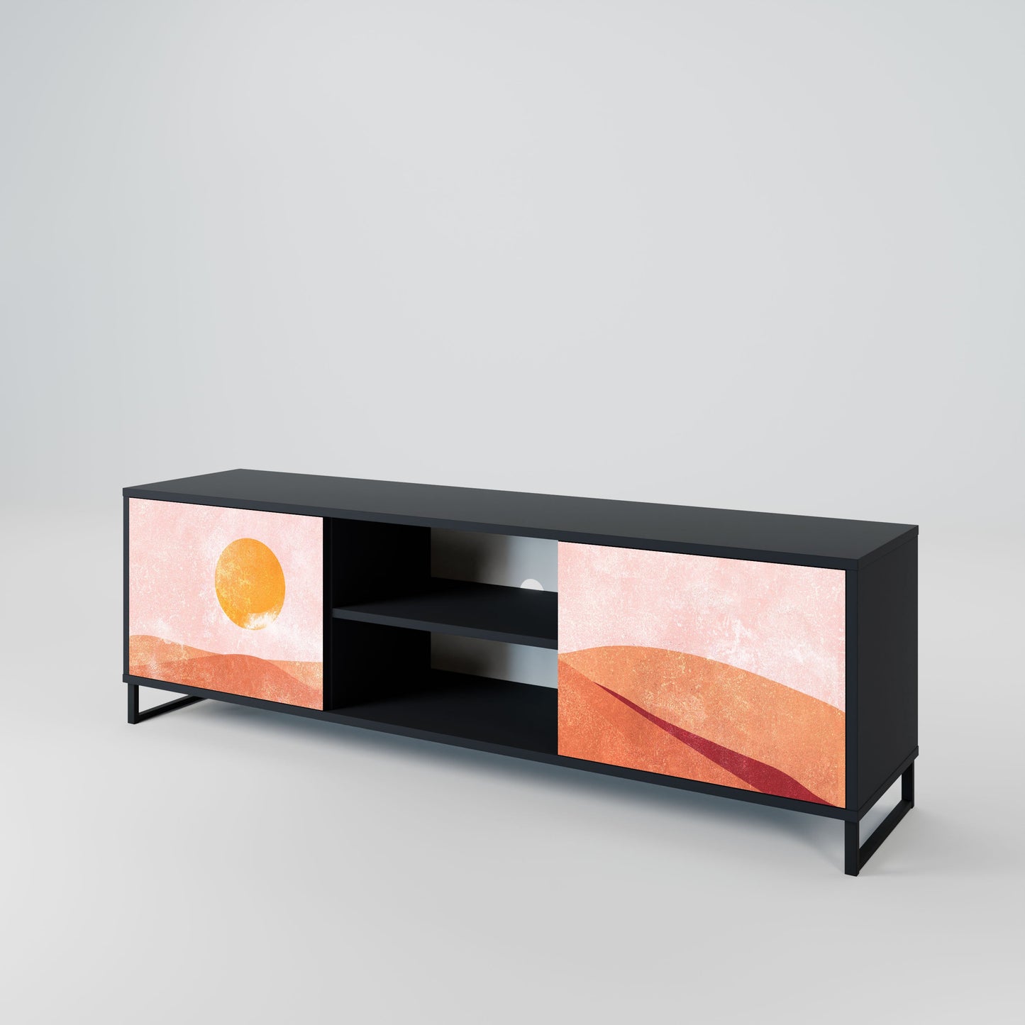 The black body gives the TV stand an elegant, modern look, while the fronts with an exceptional print draw attention, making it the focal point of any room. The spacious interior provides room for electronic devices, cables, remotes, and other accessories, helping you maintain order and organization.