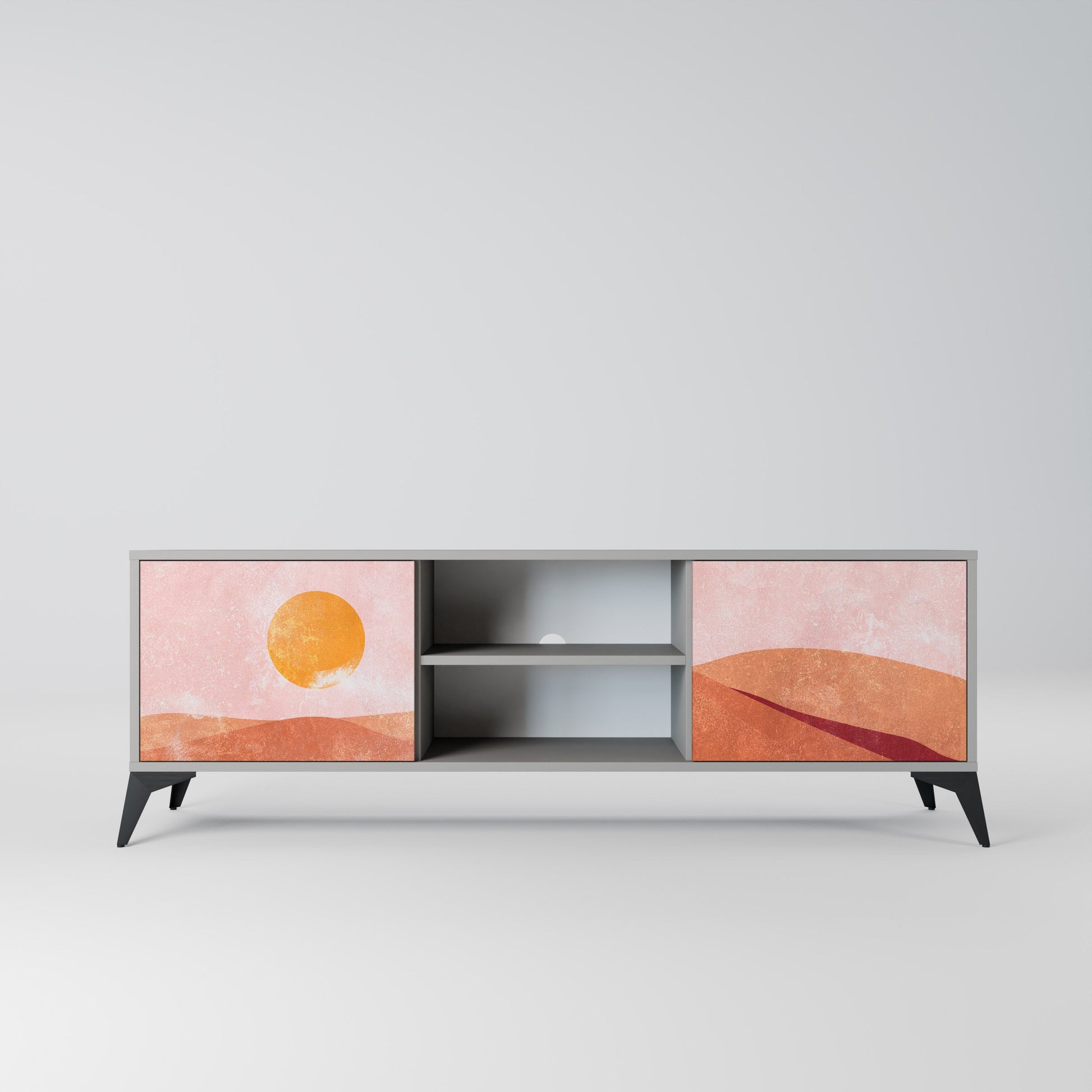 The grey body lends the TV stand a contemporary, refined look, while the fronts with an exceptional print capture attention, becoming the focal point of any room. The spacious interior provides room for electronic devices, cables, remotes, and other accessories, helping you maintain order and organization.