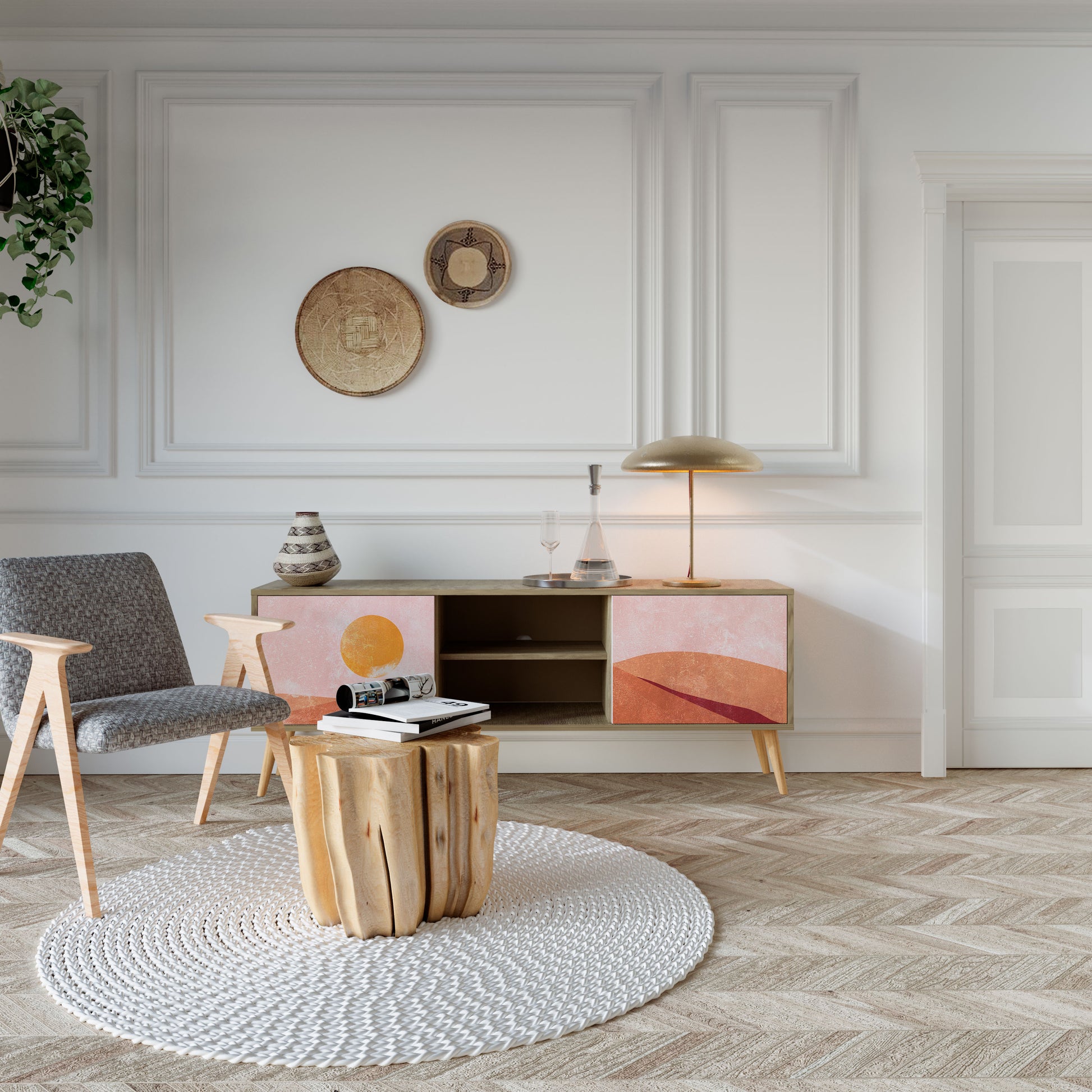 We invite you to discover our 2-door TV stand that combines simplicity with exceptional style. Made from the highest-quality materials, this elegant piece in oak tones, featuring wooden doors with a printed finish, is the perfect addition to any modern living room.