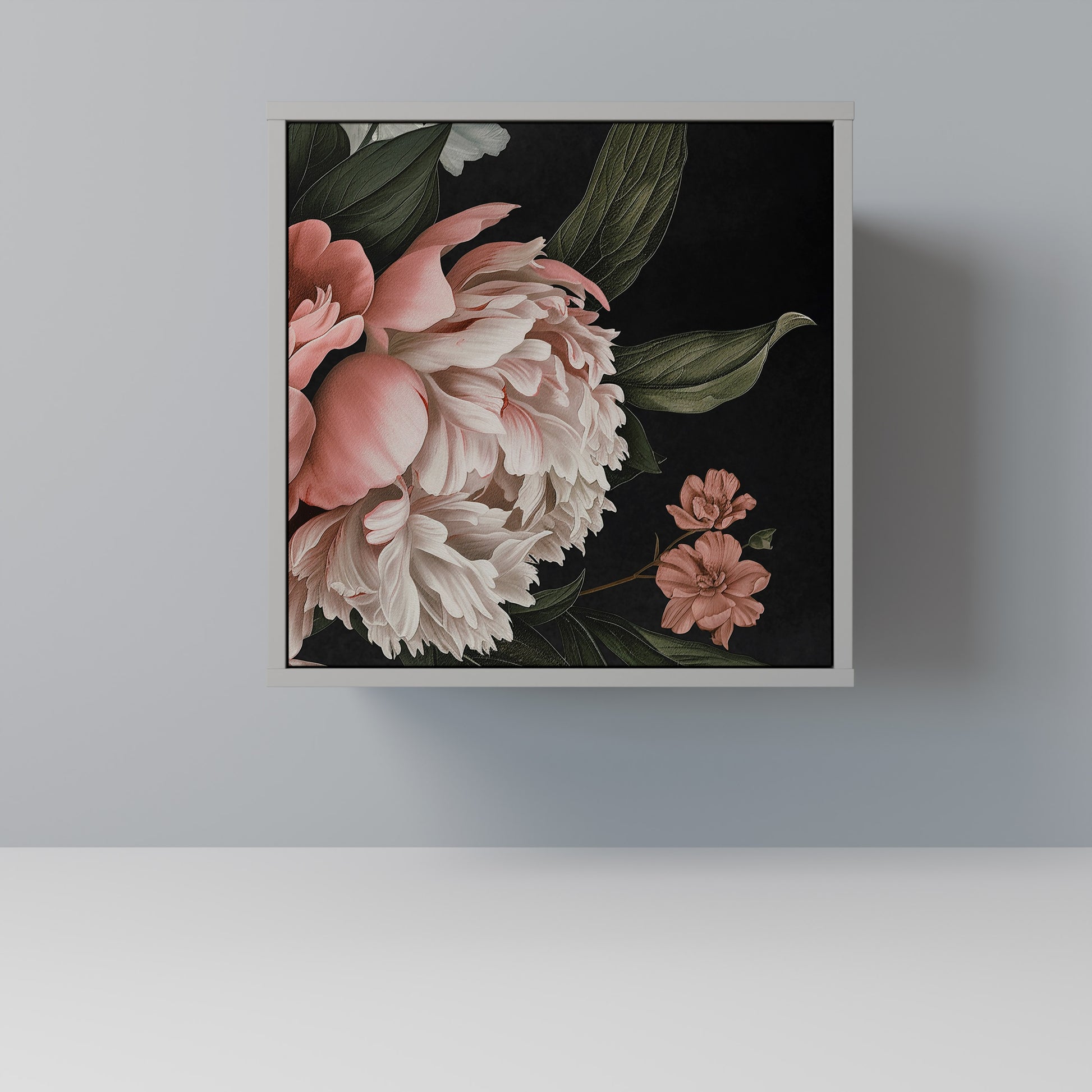 This compact yet remarkably elegant piece of furniture impresses with its minimalist design, perfectly fitting into both modern and classic interiors. The subdued grey color of the body gives the furniture a subtle yet distinctive character, while the fronts with a unique print add an artistic touch.