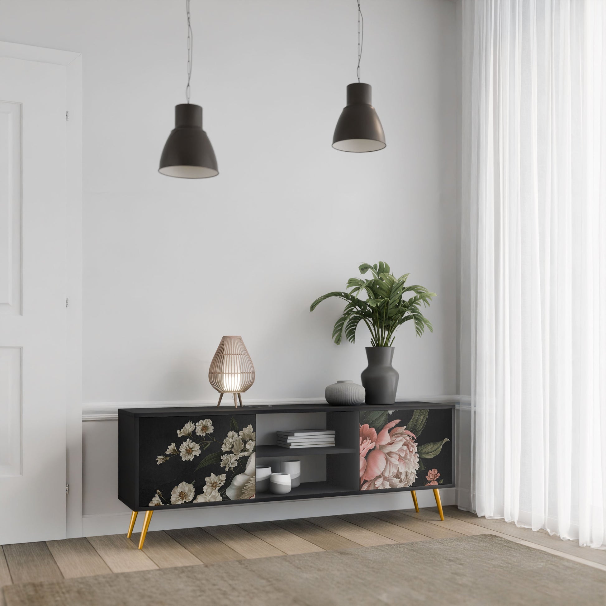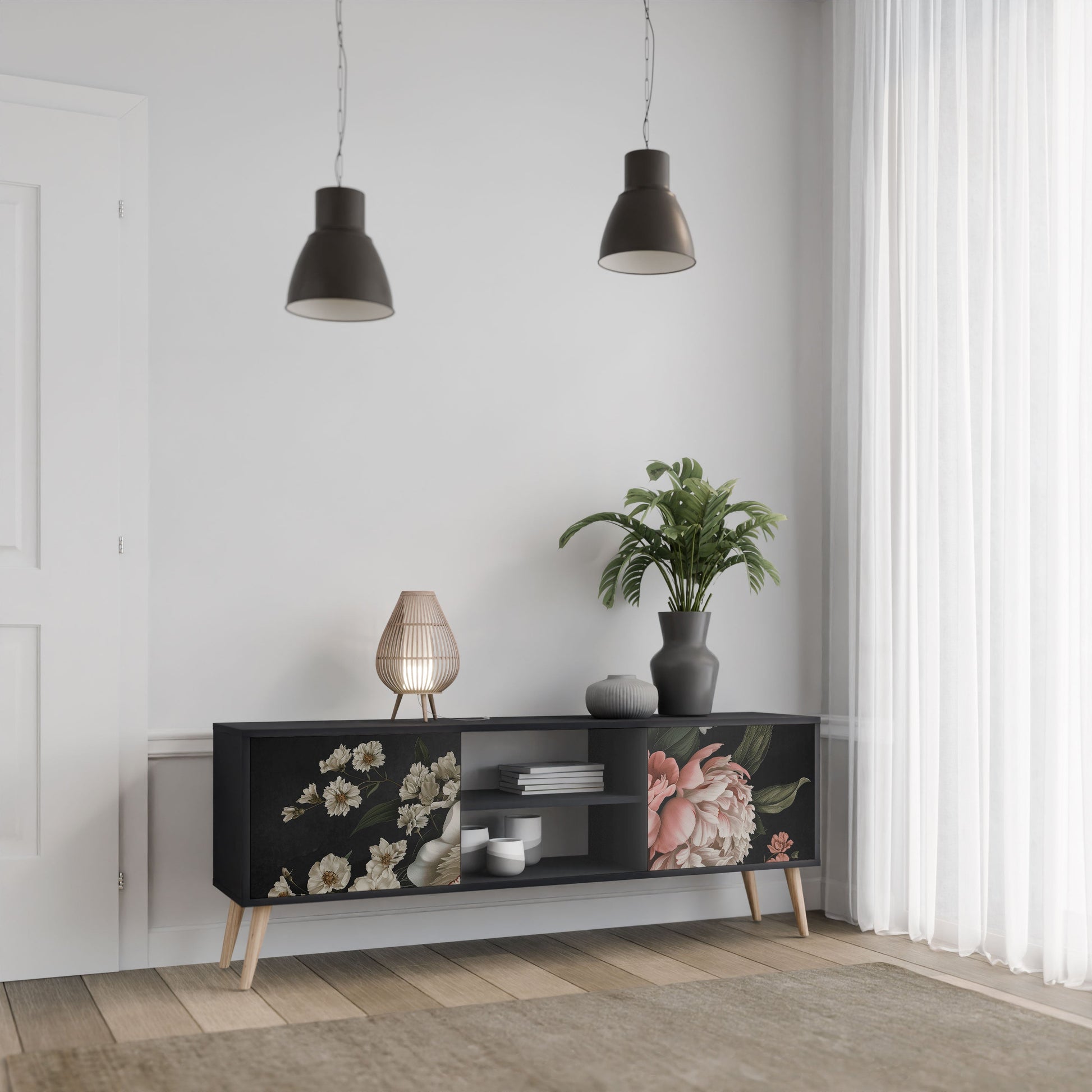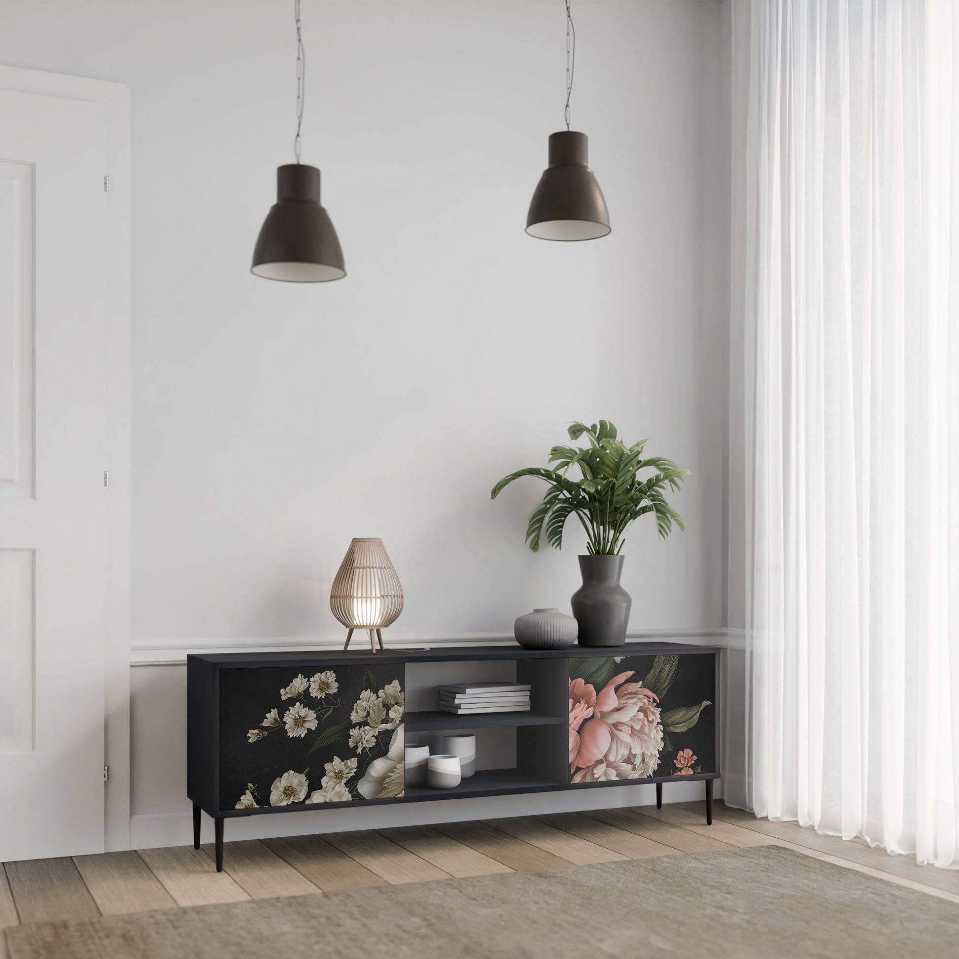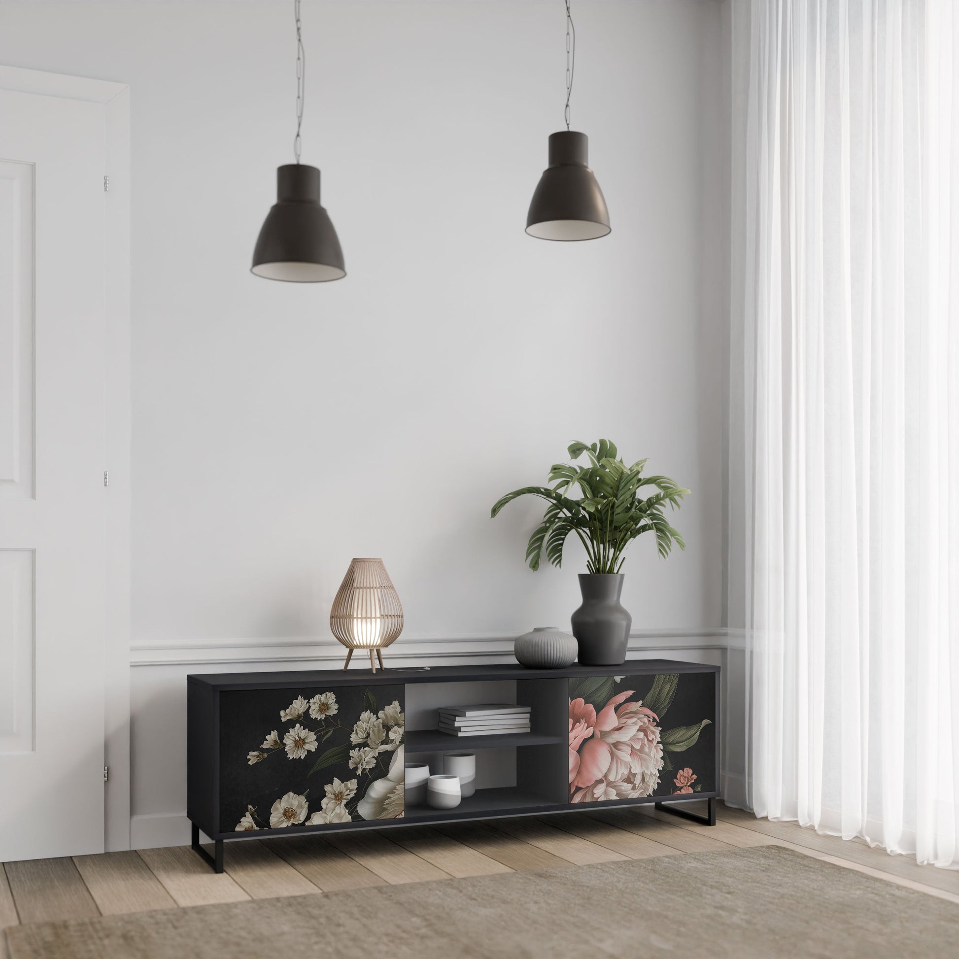 The black body gives the TV stand an elegant, modern look, while the fronts with an exceptional print draw attention, making it the focal point of any room. The spacious interior provides room for electronic devices, cables, remotes, and other accessories, helping you maintain order and organization.