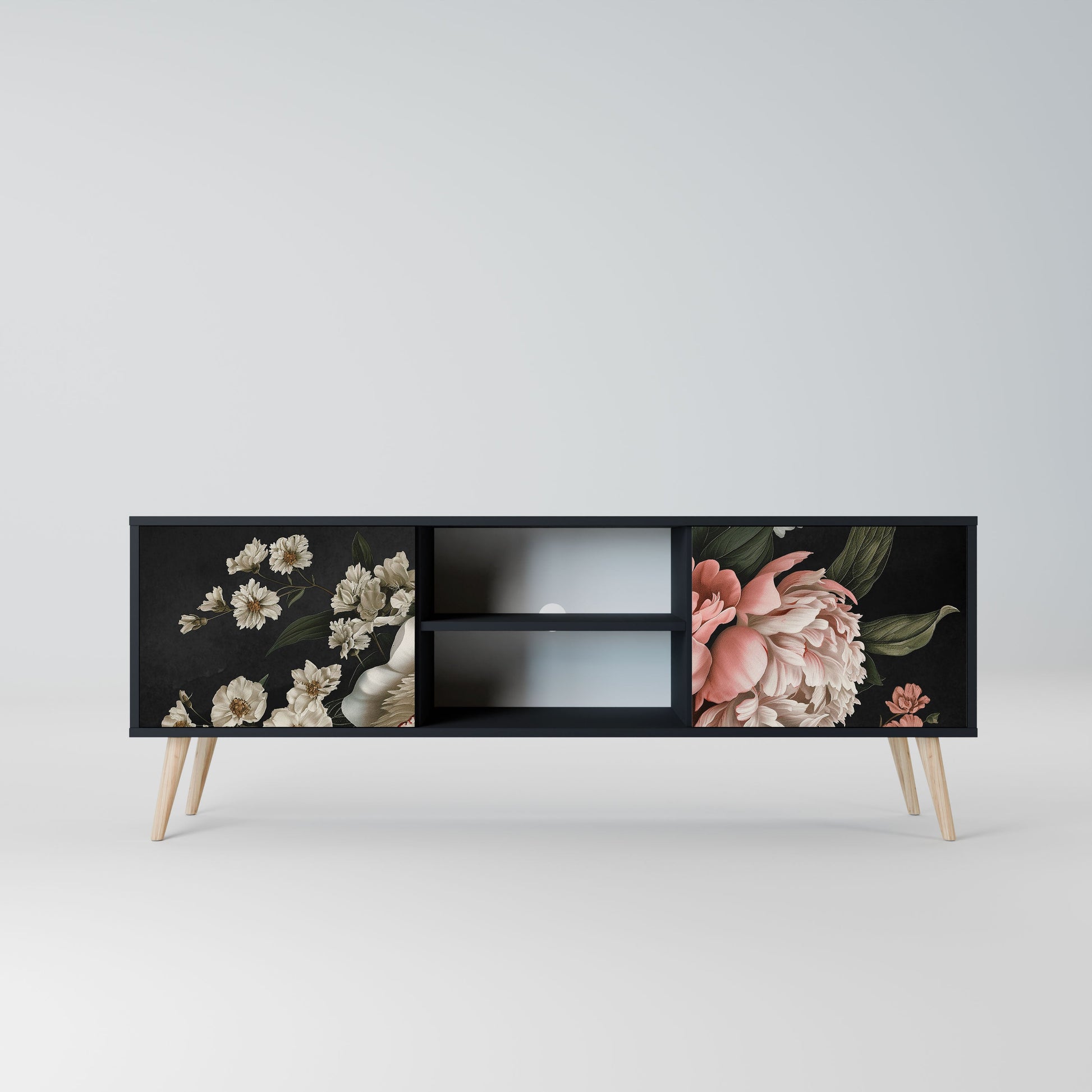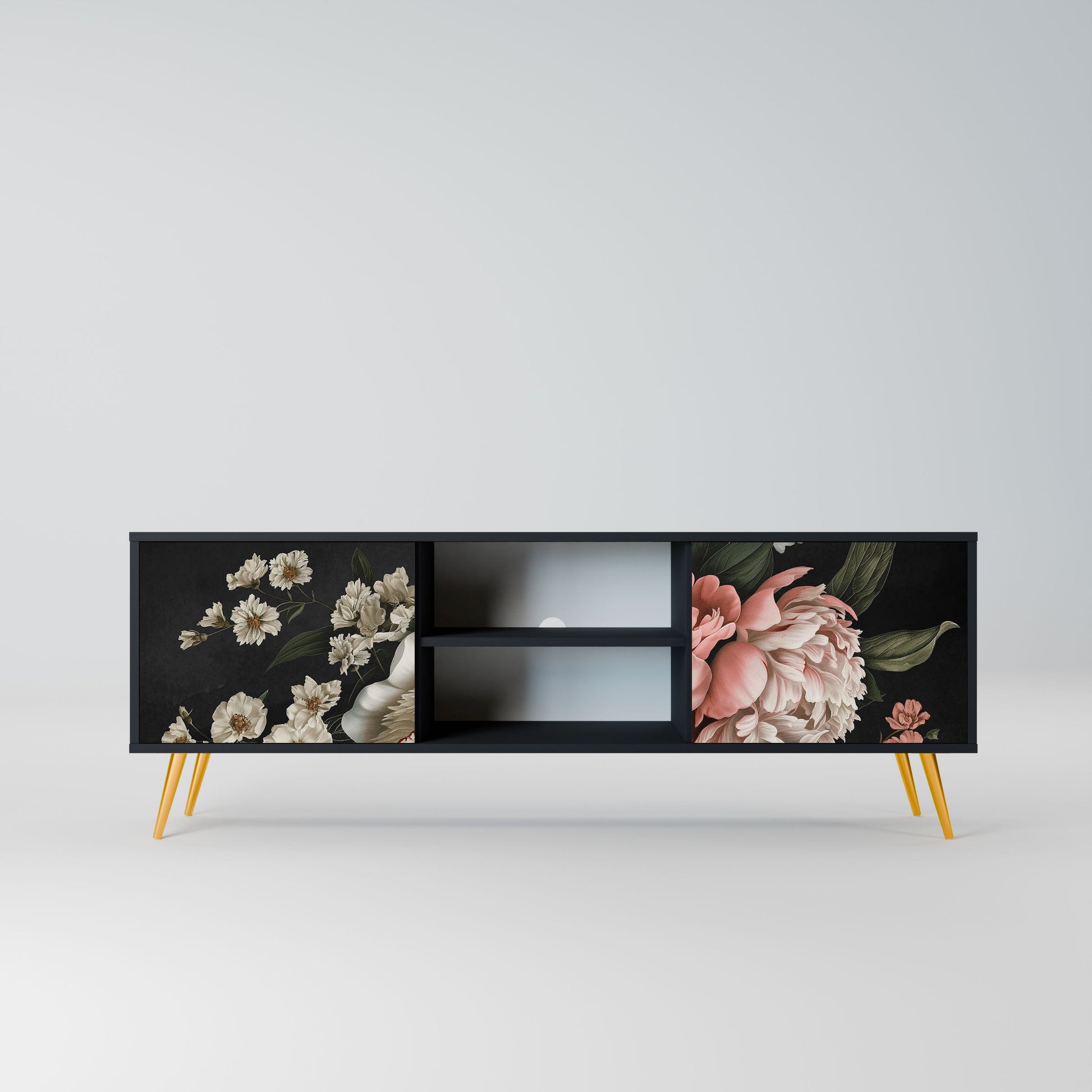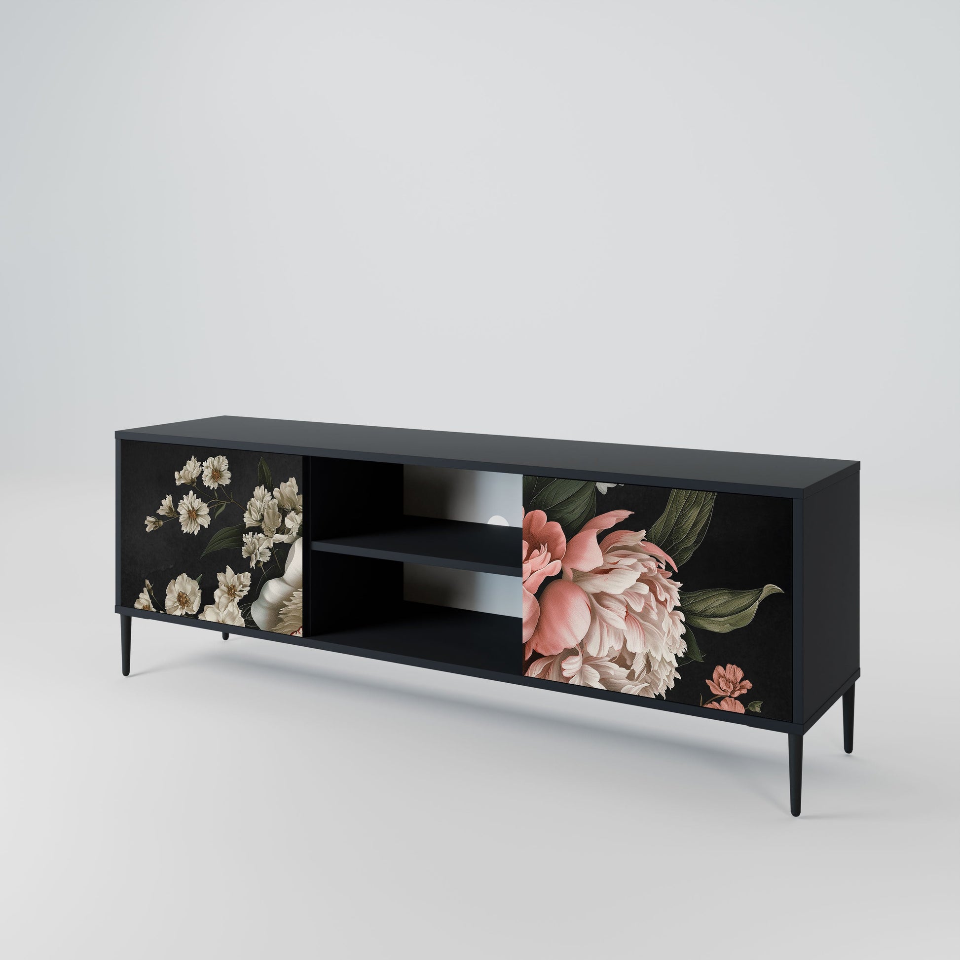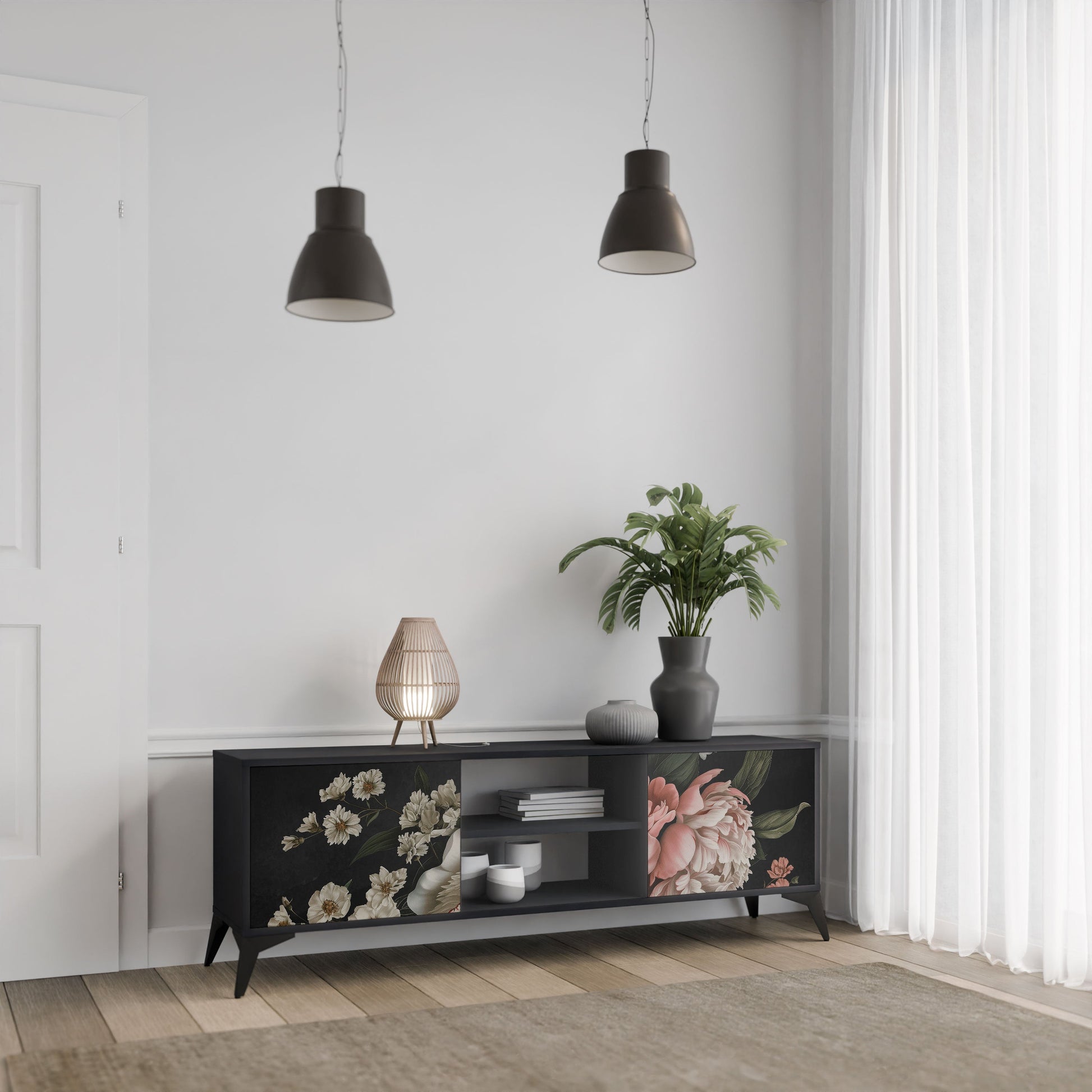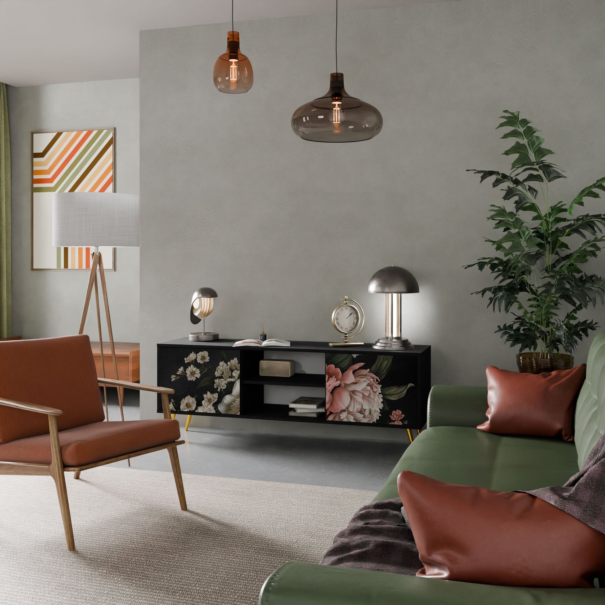 The black body gives the TV stand an elegant, modern look, while the fronts with an exceptional print draw attention, making it the focal point of any room. The spacious interior provides room for electronic devices, cables, remotes, and other accessories, helping you maintain order and organization.