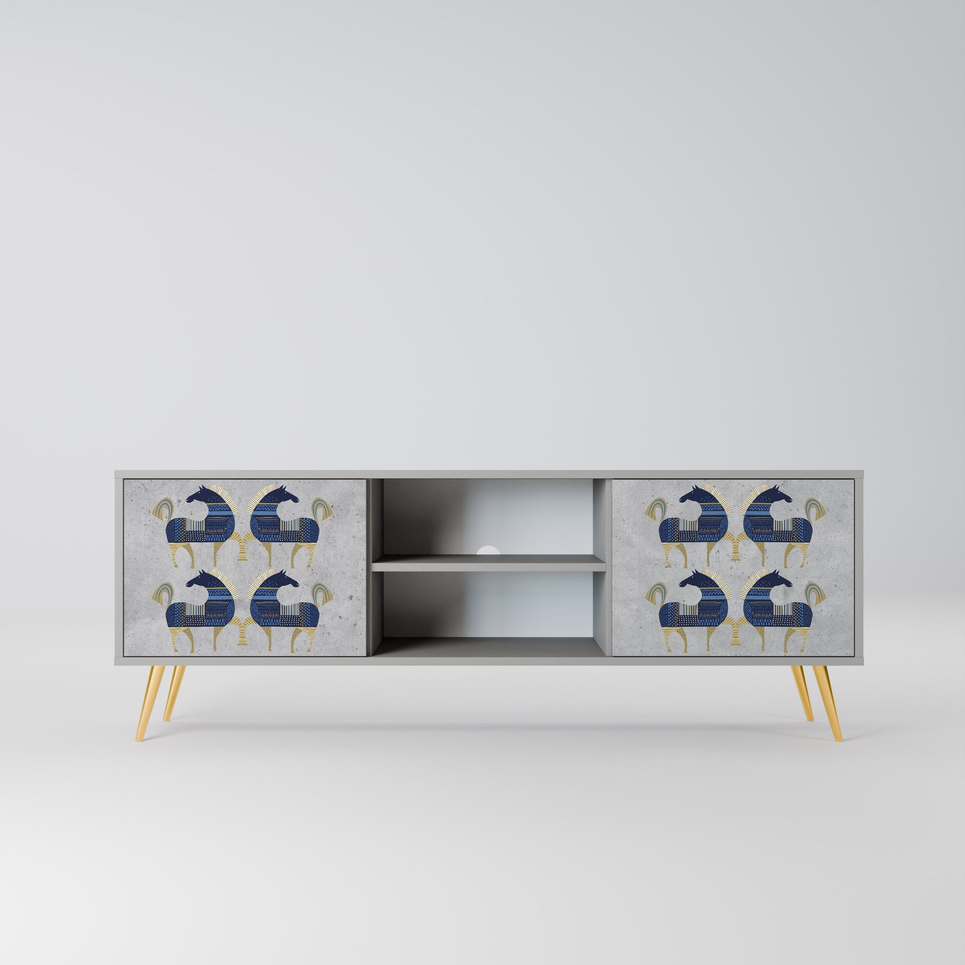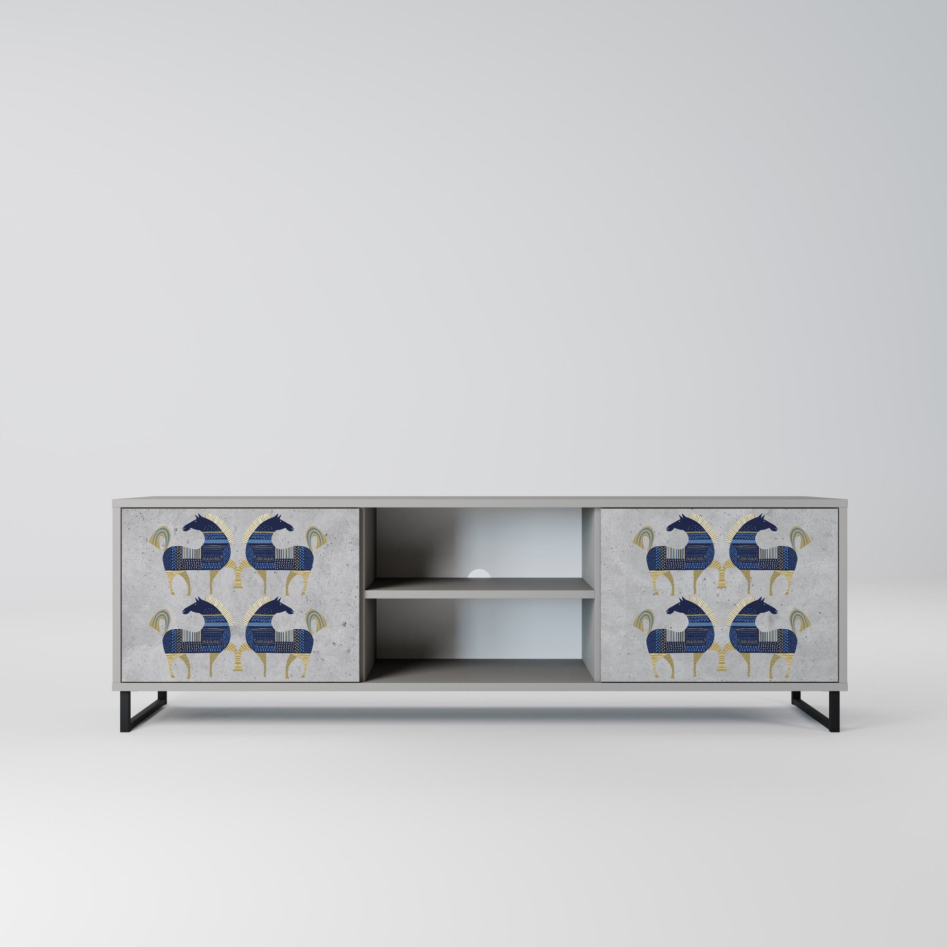 The grey body lends the TV stand a contemporary, refined look, while the fronts with an exceptional print capture attention, becoming the focal point of any room. The spacious interior provides room for electronic devices, cables, remotes, and other accessories, helping you maintain order and organization.