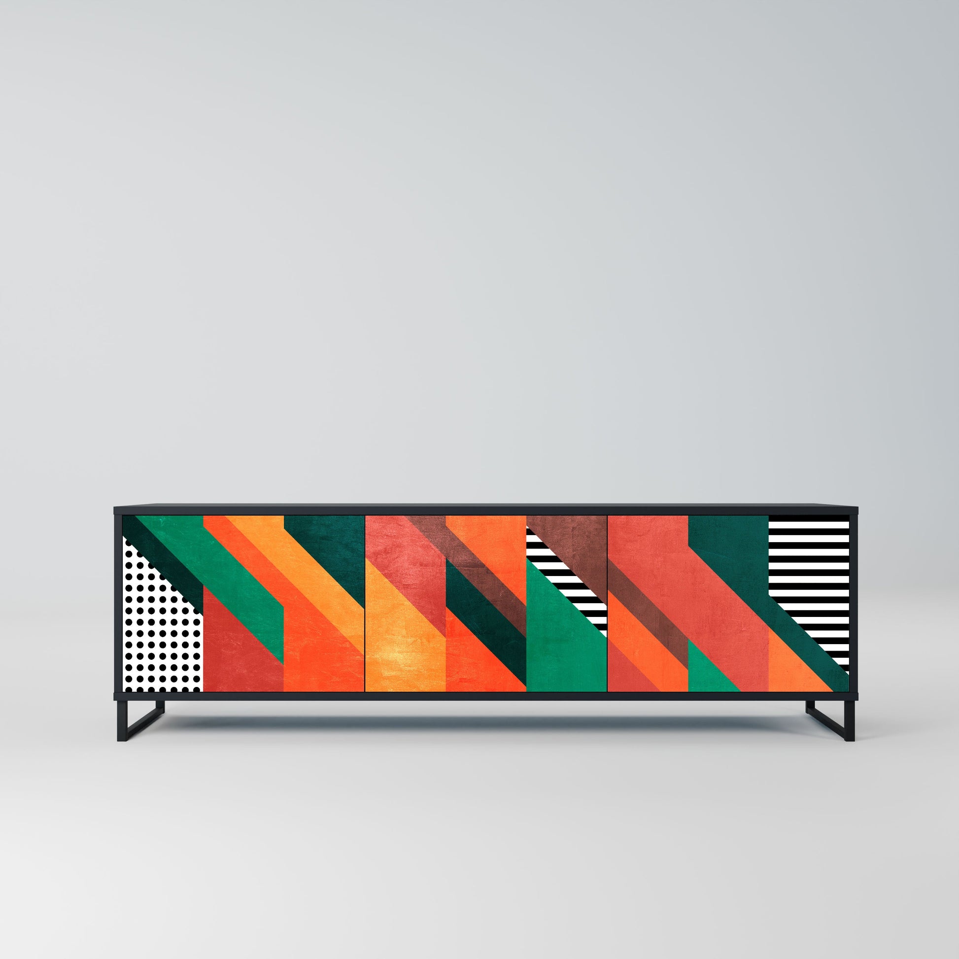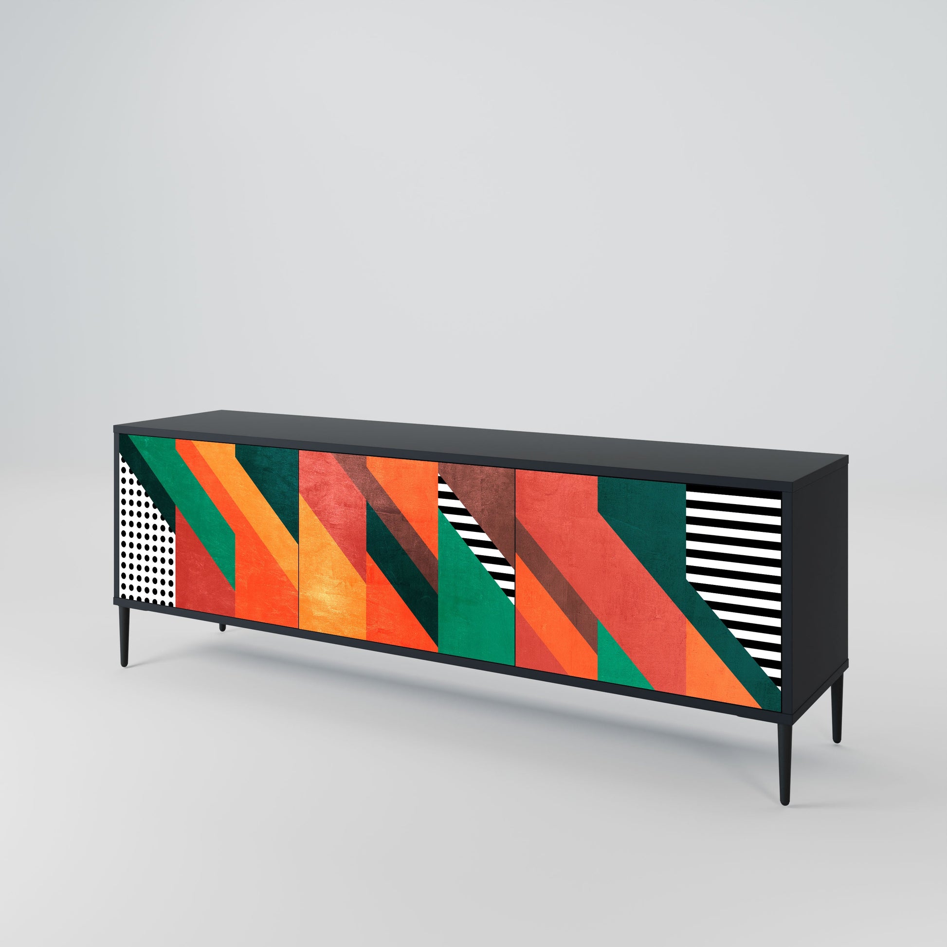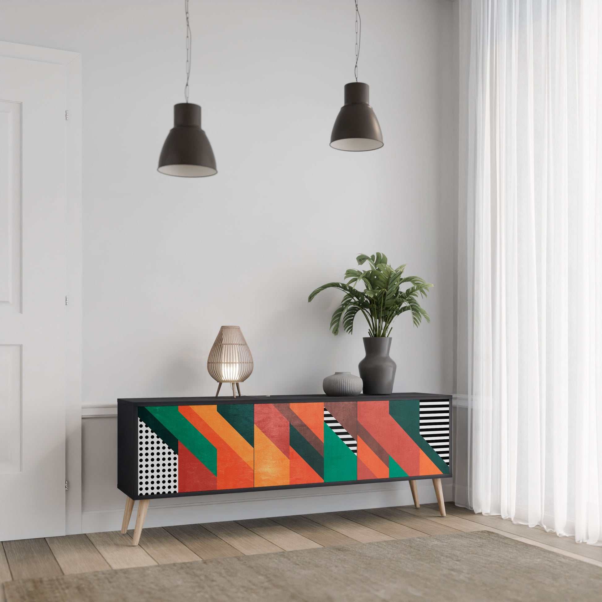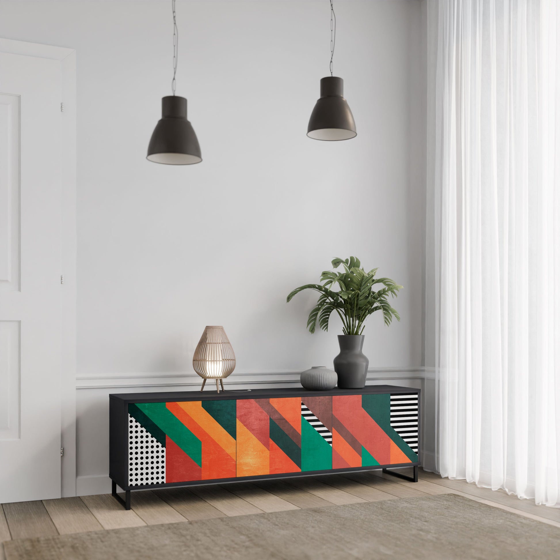 The black body of the stand creates a bold, modern accent that pairs beautifully with industrial and minimalist arrangements. The fronts with a designer print add character and uniqueness, making this piece not only practical but also a standout decorative element.
