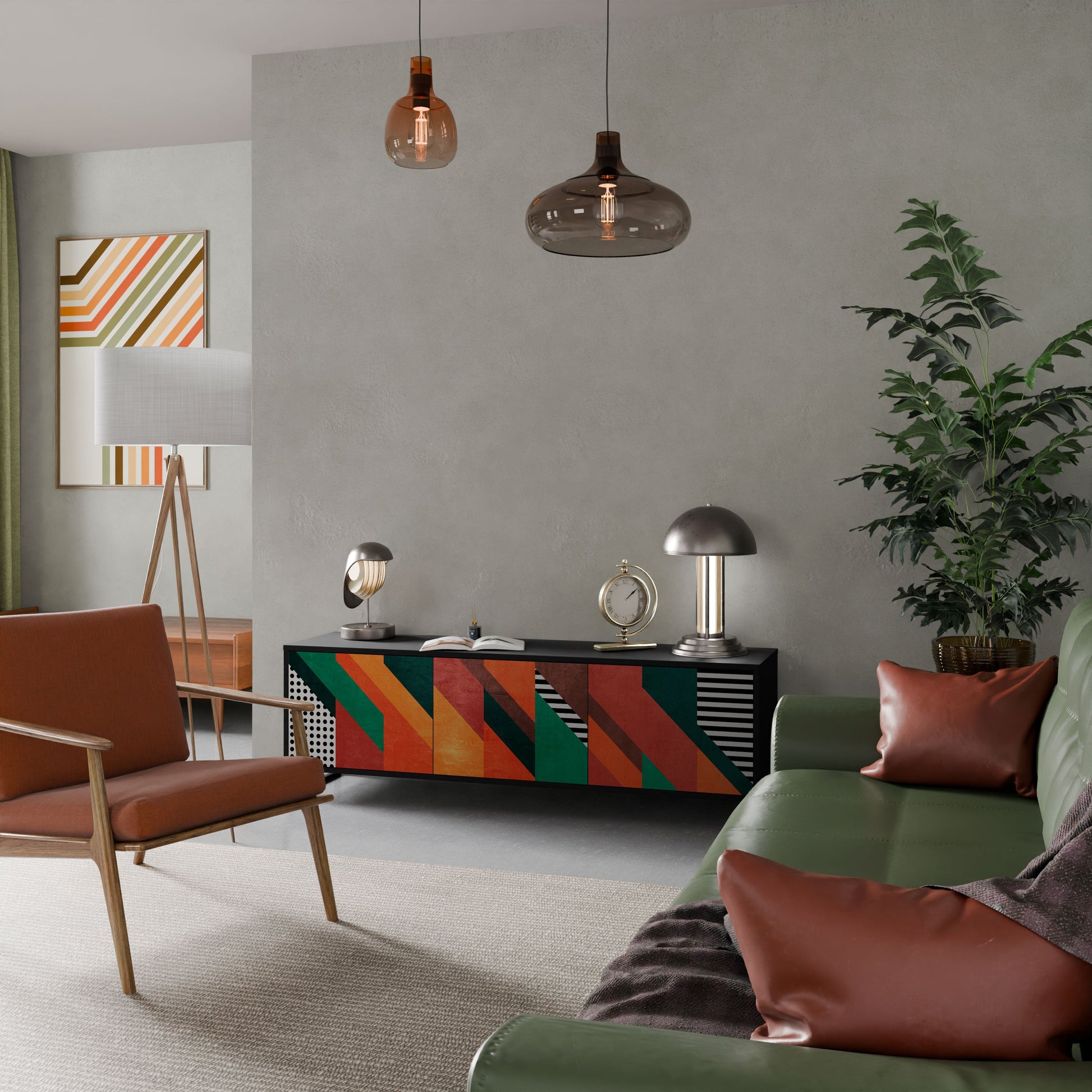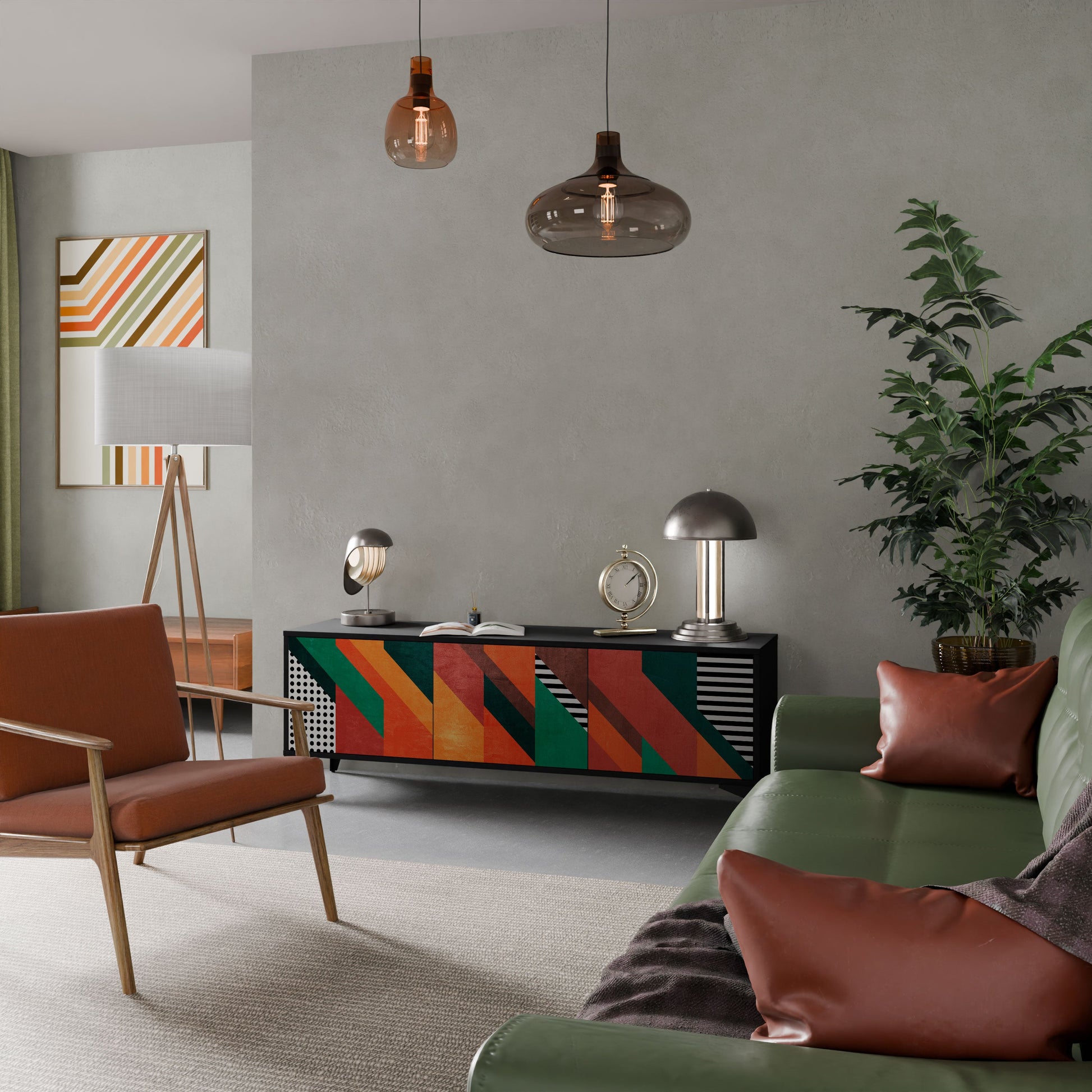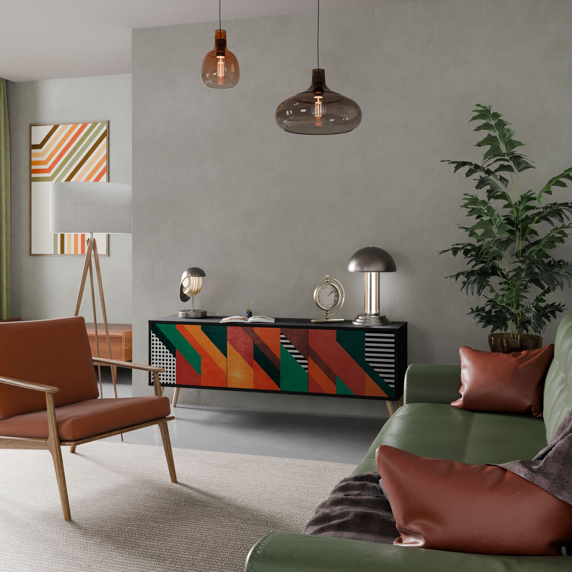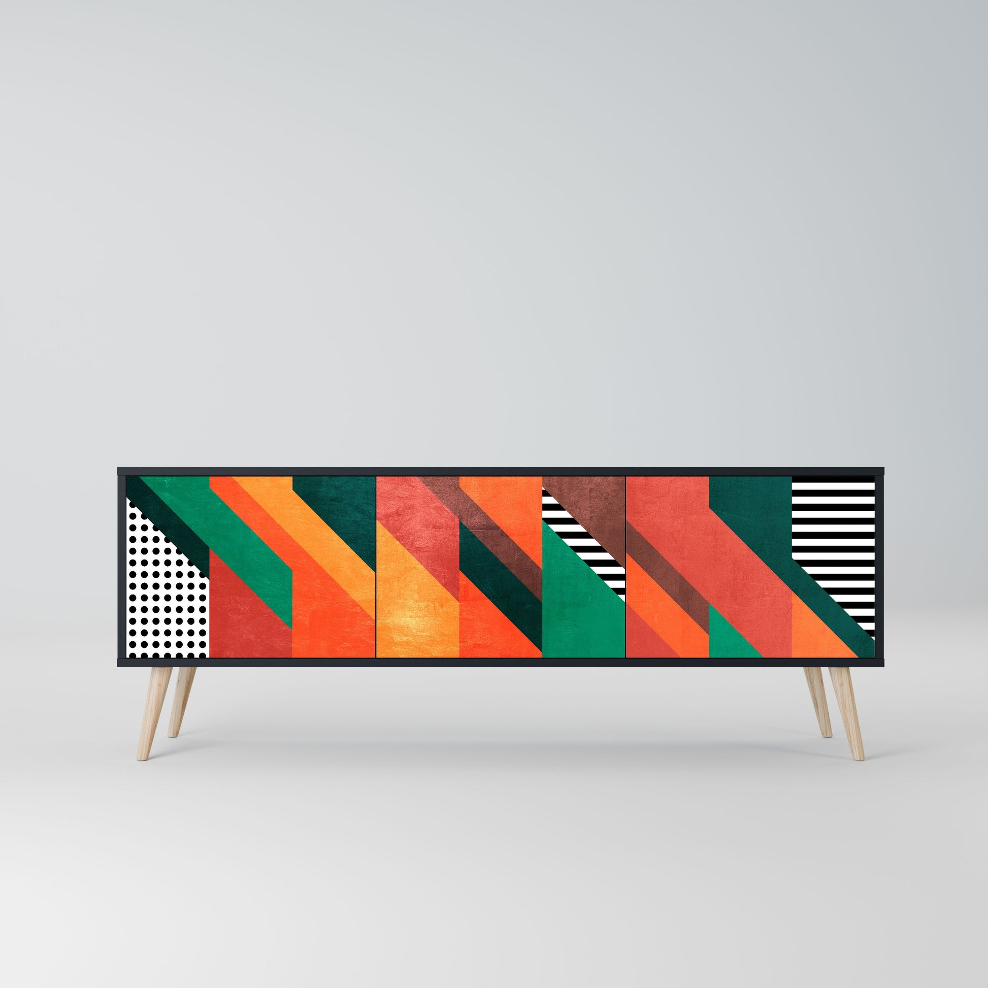 The black body of the stand creates a bold, modern accent that pairs beautifully with industrial and minimalist arrangements. The fronts with a designer print add character and uniqueness, making this piece not only practical but also a standout decorative element.