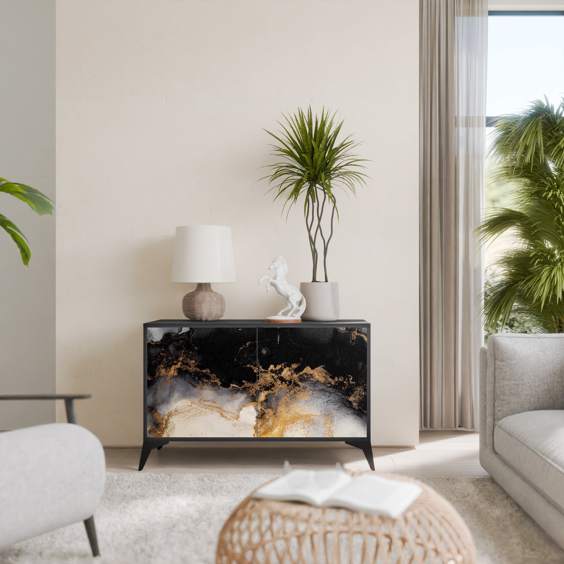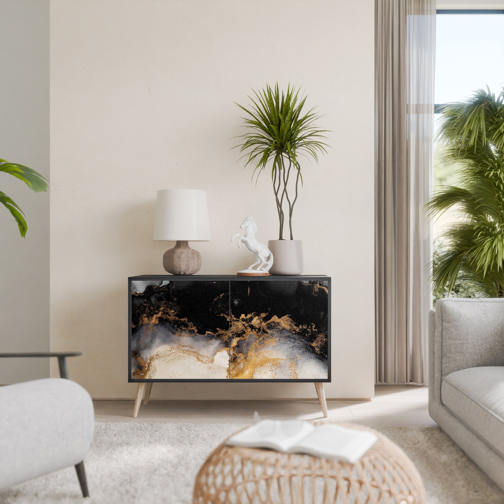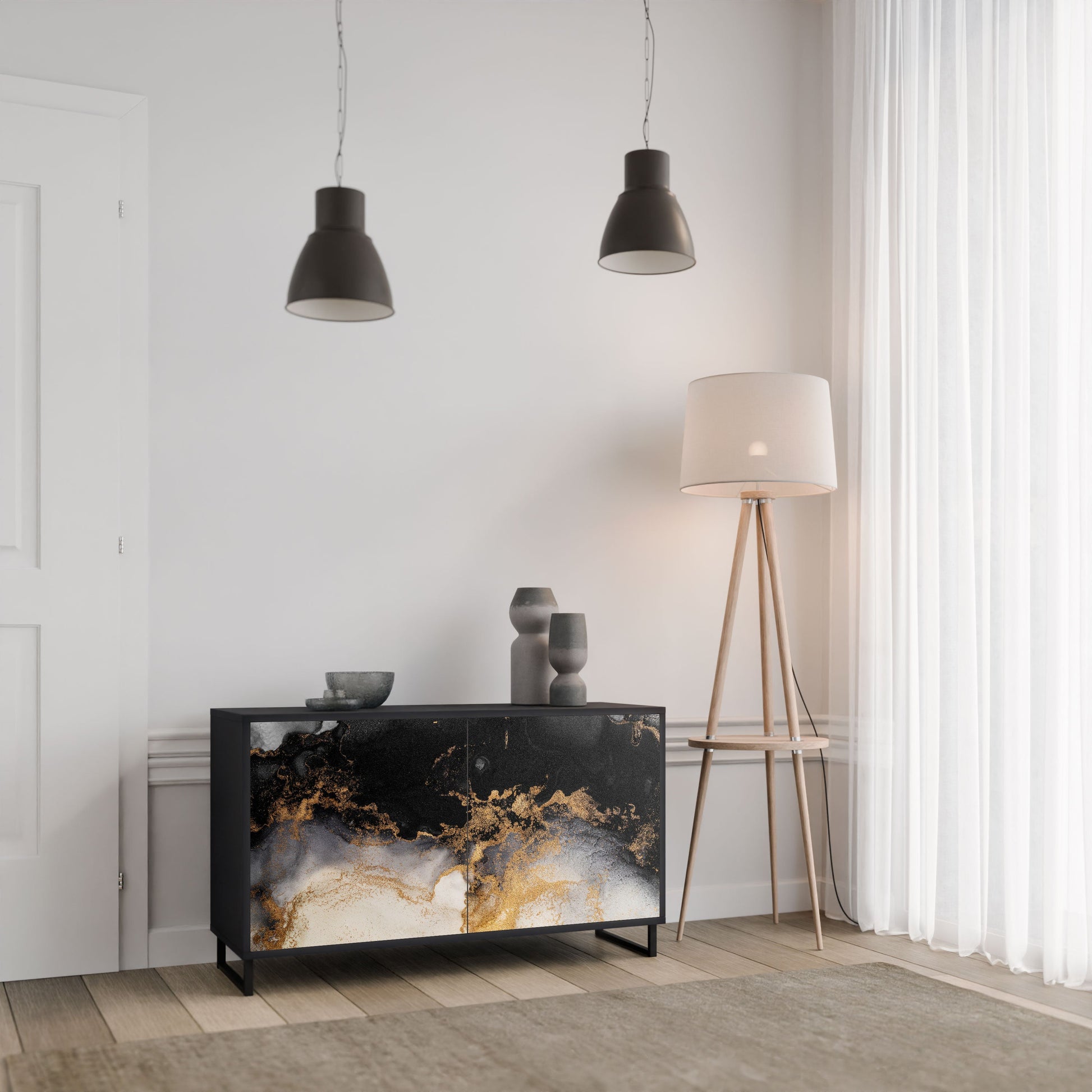 Elegance and functionality in a single piece of furniture – our 2-Door Sideboard with a black body is the perfect solution for lovers of stylish, modern interiors. The black body emphasizes the bold character of the furniture, while the fronts with a unique print add an artistic touch. It fits perfectly in the living room, bedroom, or office, complementing both modern and industrial arrangements.