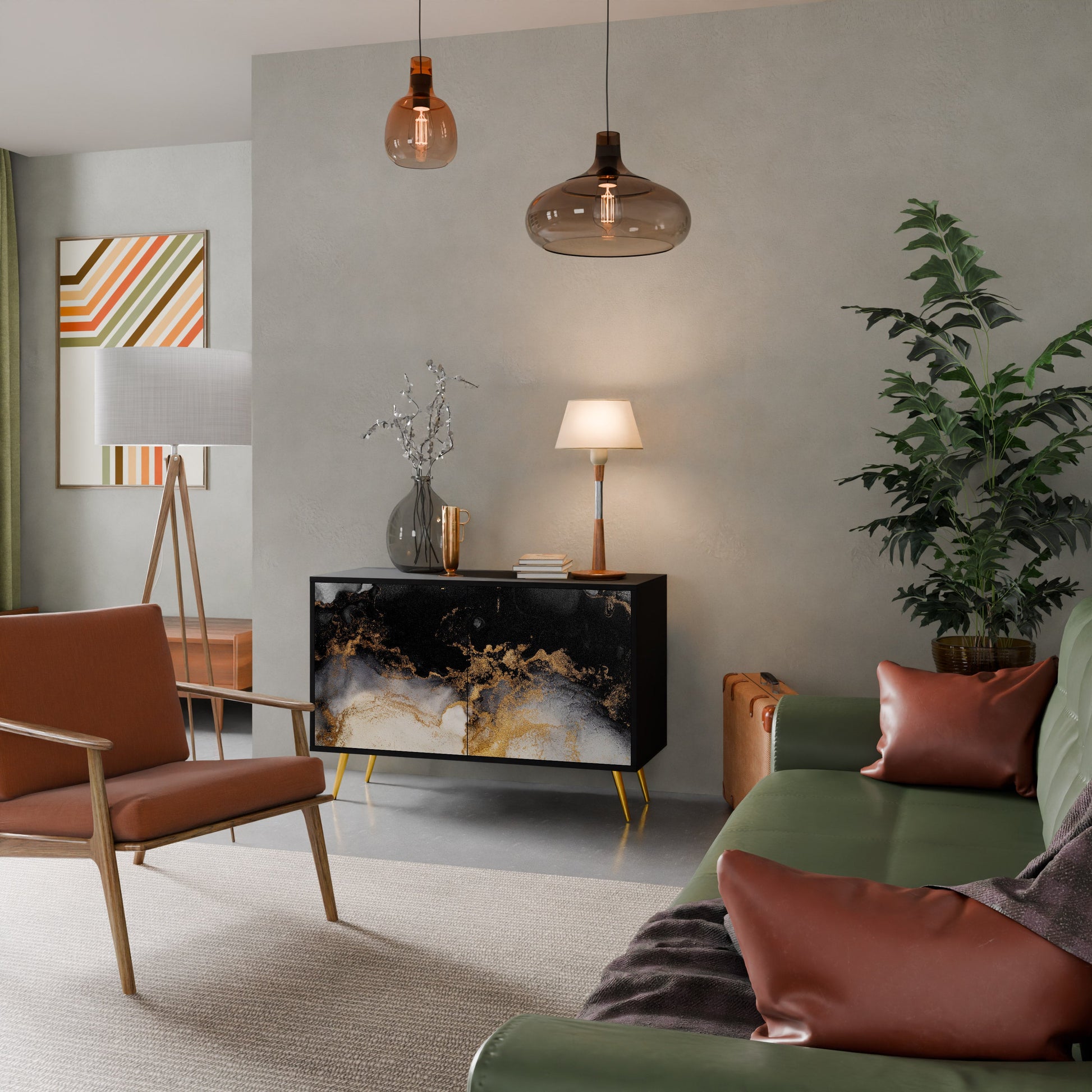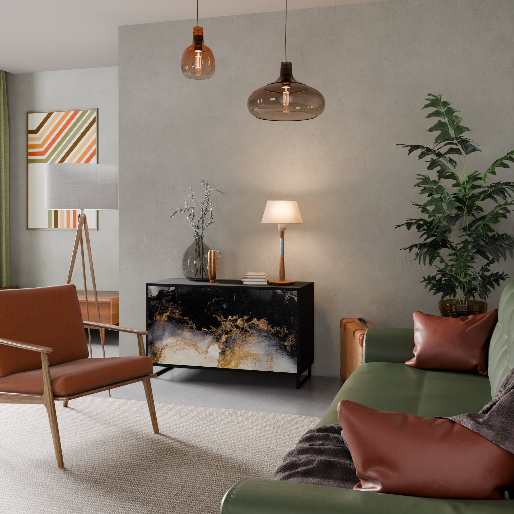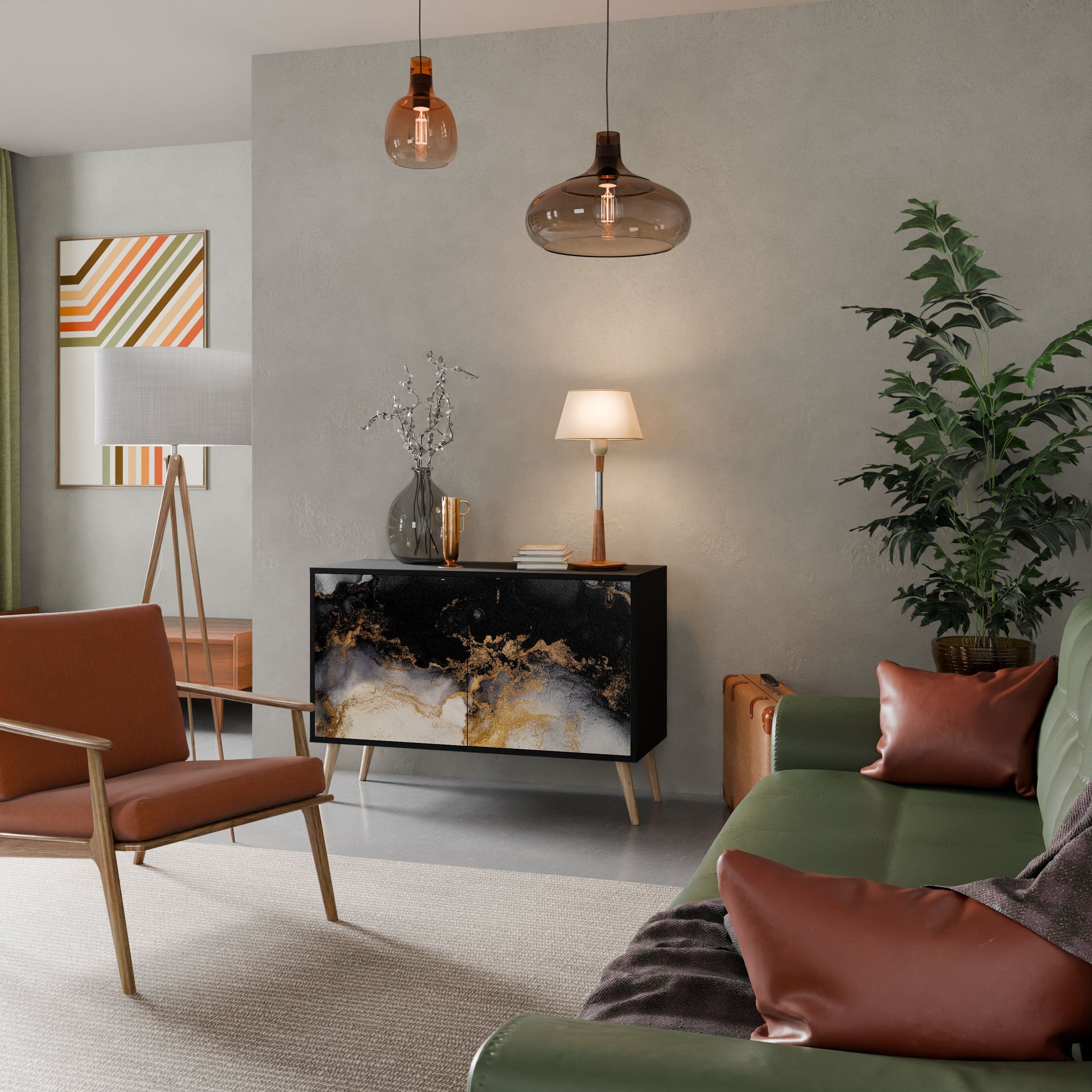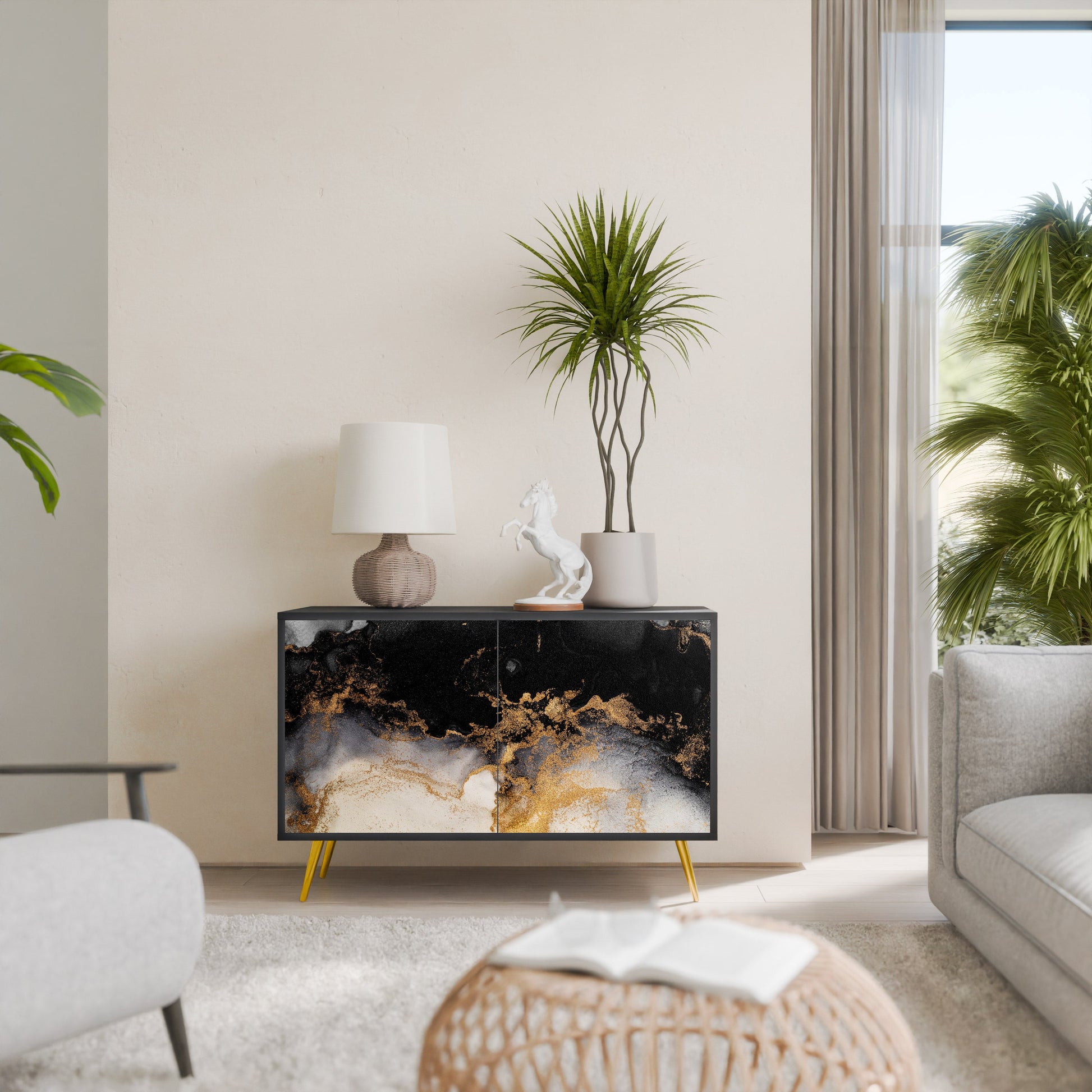 Elegance and functionality in a single piece of furniture – our 2-Door Sideboard with a black body is the perfect solution for lovers of stylish, modern interiors. The black body emphasizes the bold character of the furniture, while the fronts with a unique print add an artistic touch. It fits perfectly in the living room, bedroom, or office, complementing both modern and industrial arrangements.