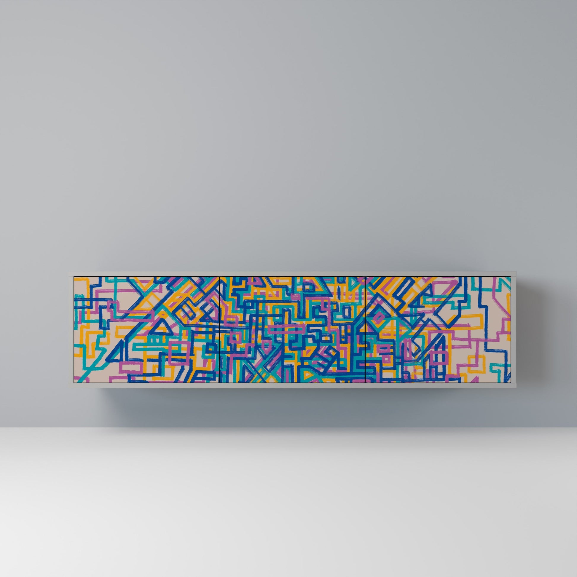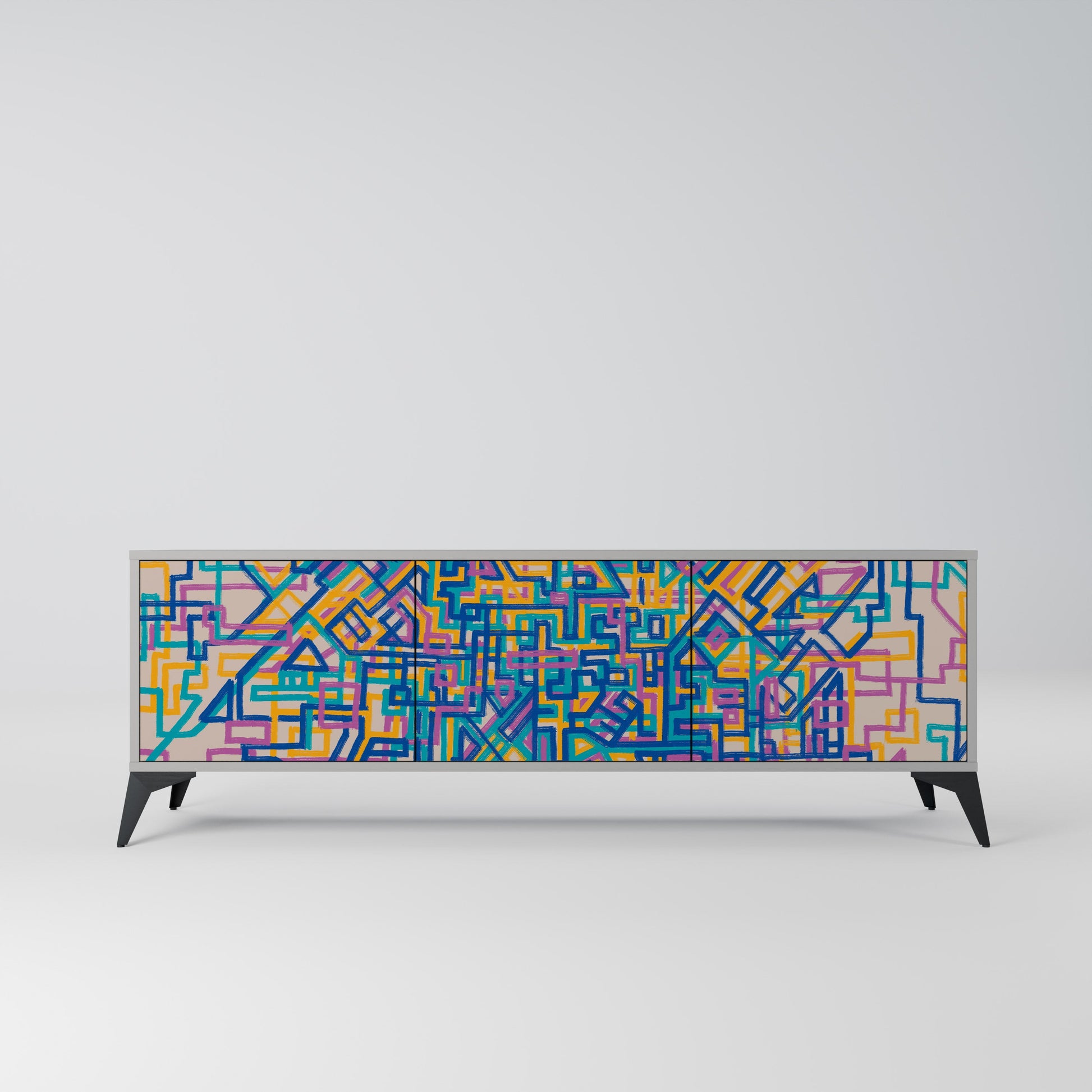 The grey body of the stand creates a refined, modern accent that pairs beautifully with industrial and minimalist arrangements. The fronts with a designer print add character and uniqueness, making this piece not only practical but also a standout decorative element.