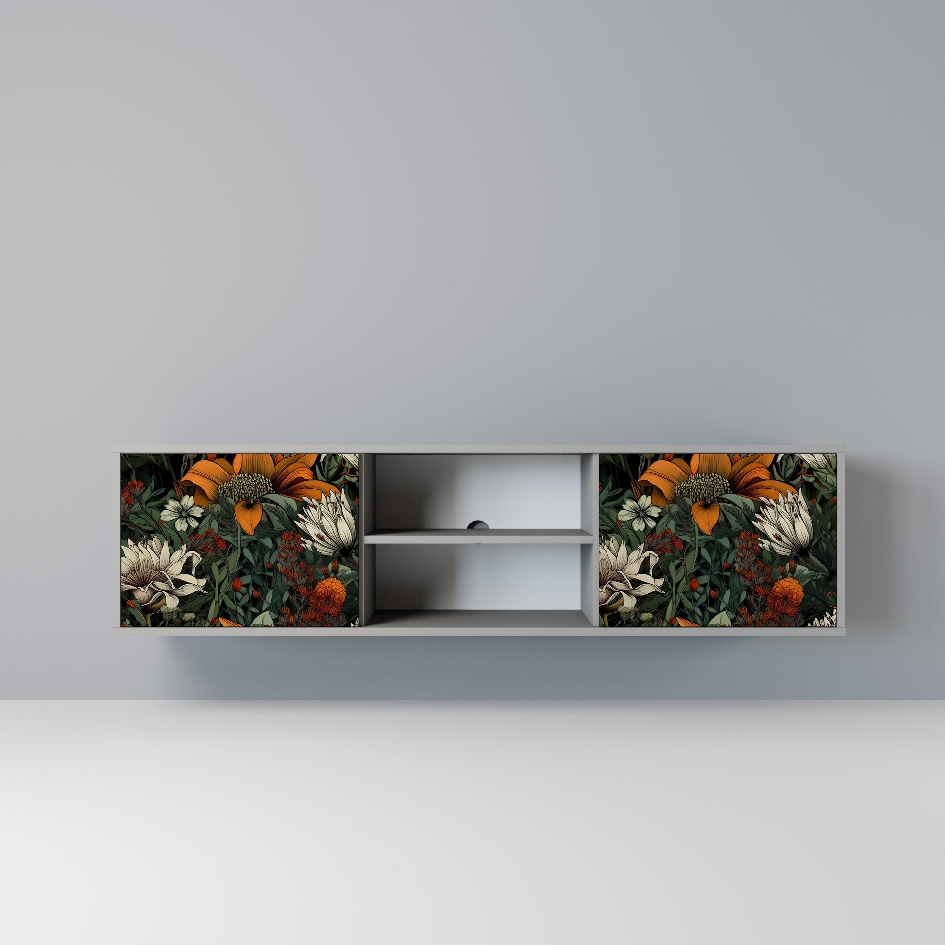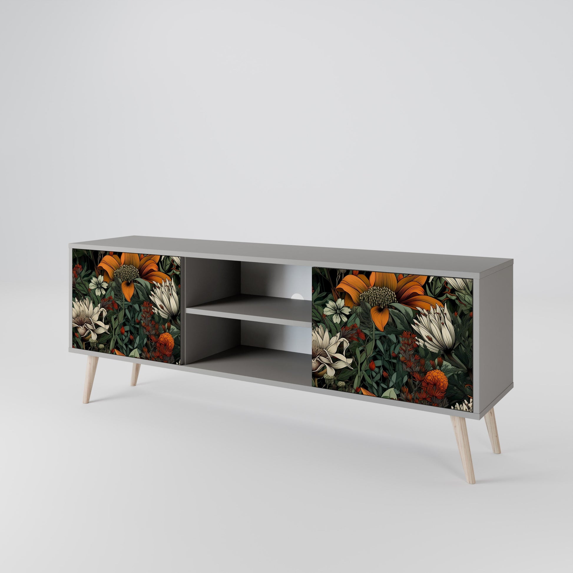 The grey body lends the TV stand a contemporary, refined look, while the fronts with an exceptional print capture attention, becoming the focal point of any room. The spacious interior provides room for electronic devices, cables, remotes, and other accessories, helping you maintain order and organization.