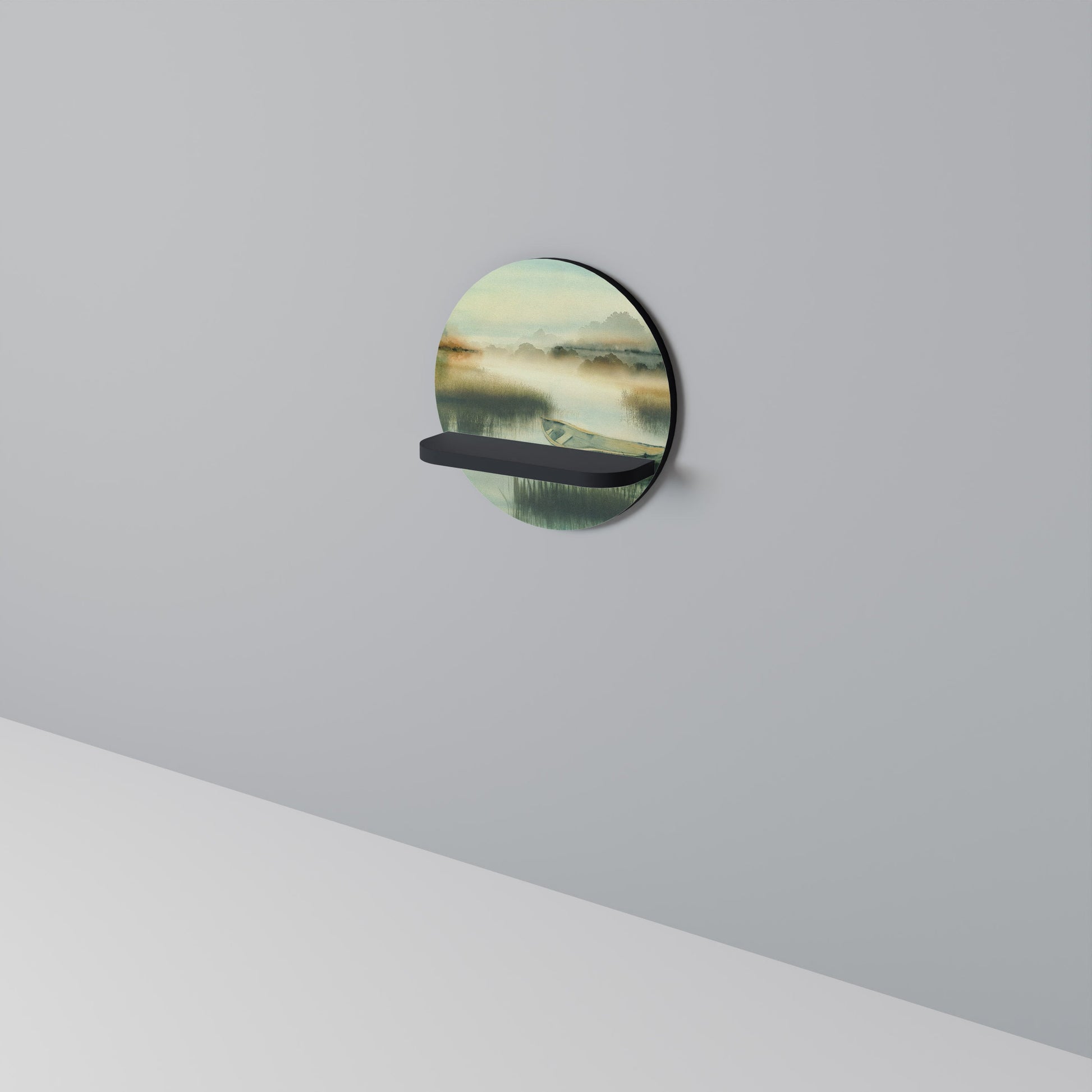 MORNING BY THE LAKE Round Art Shelf In Black Finish
