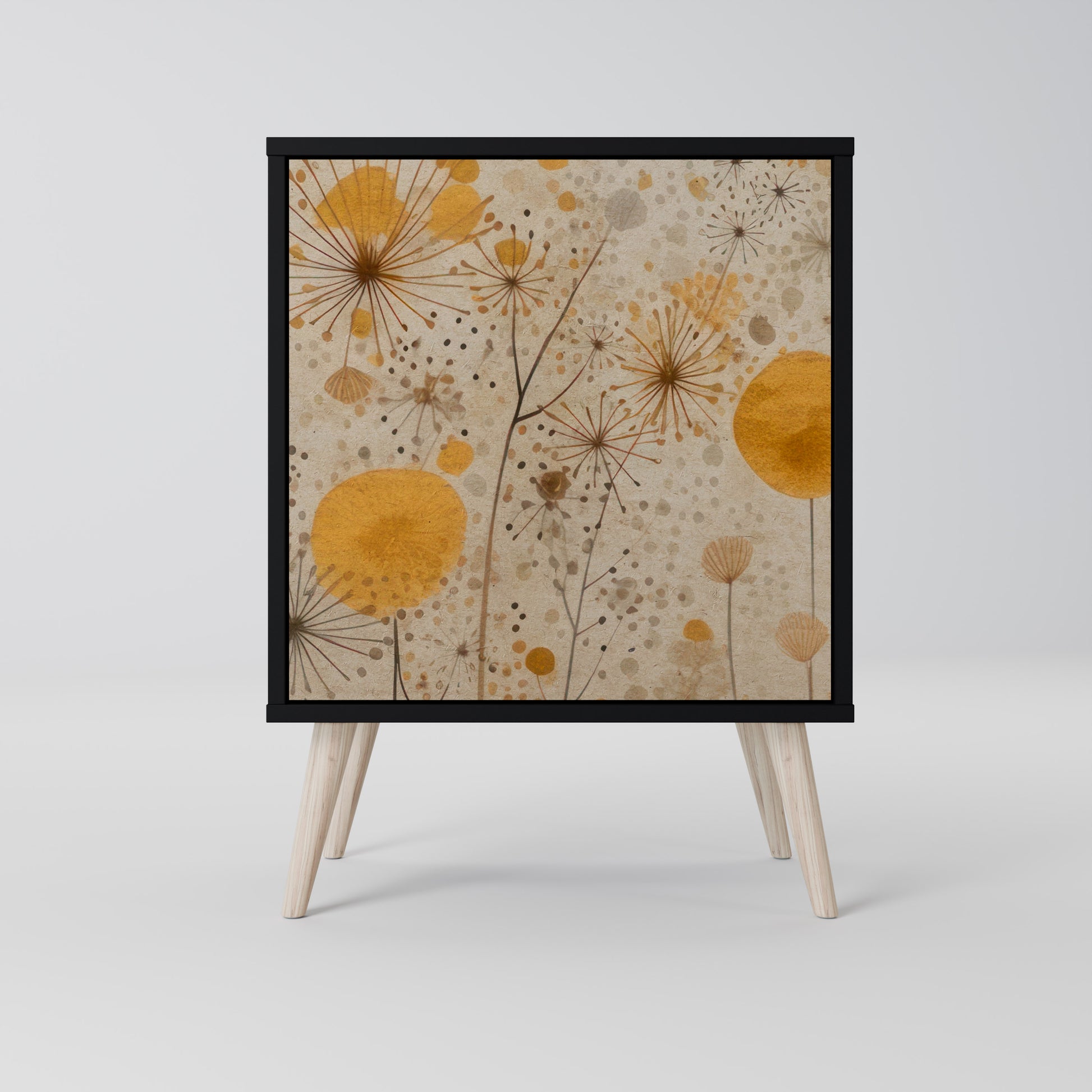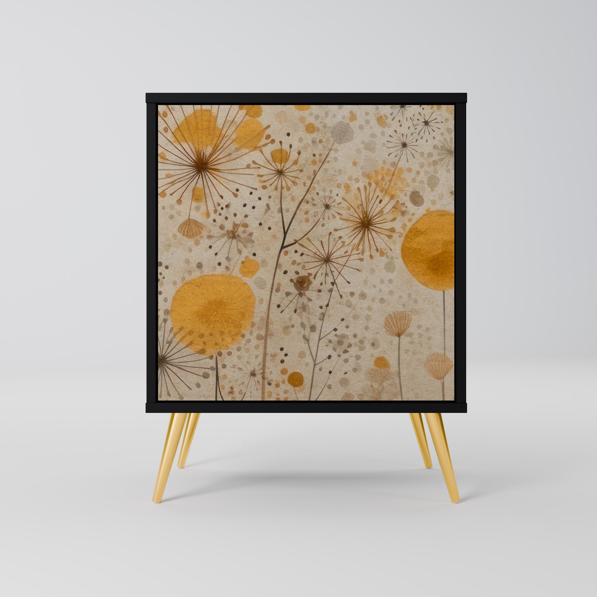 This compact yet remarkably elegant piece of furniture impresses with its minimalist design, perfectly fitting into both modern and classic interiors. The black body emphasizes the furniture’s bold character, while the fronts with a unique print add an artistic touch.
