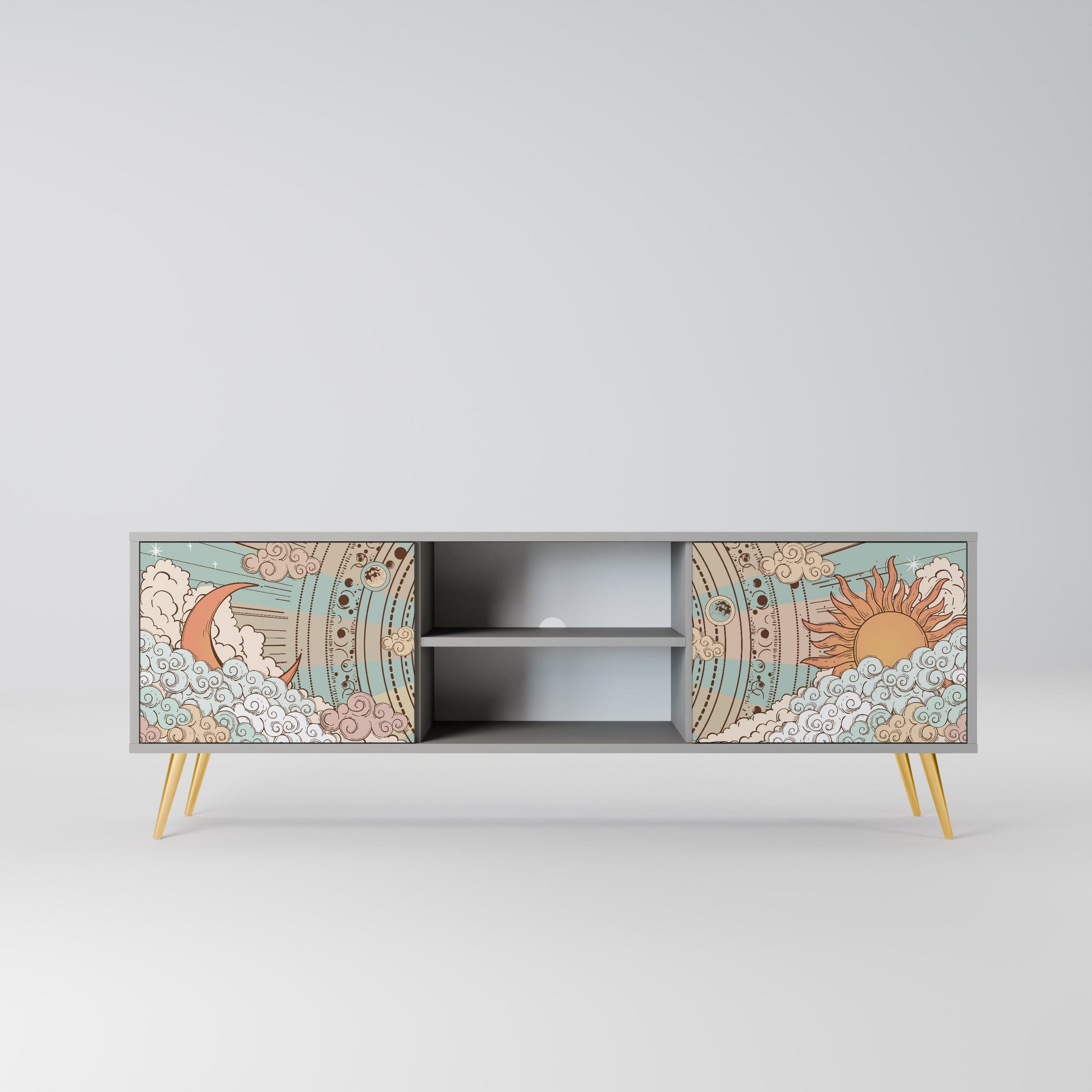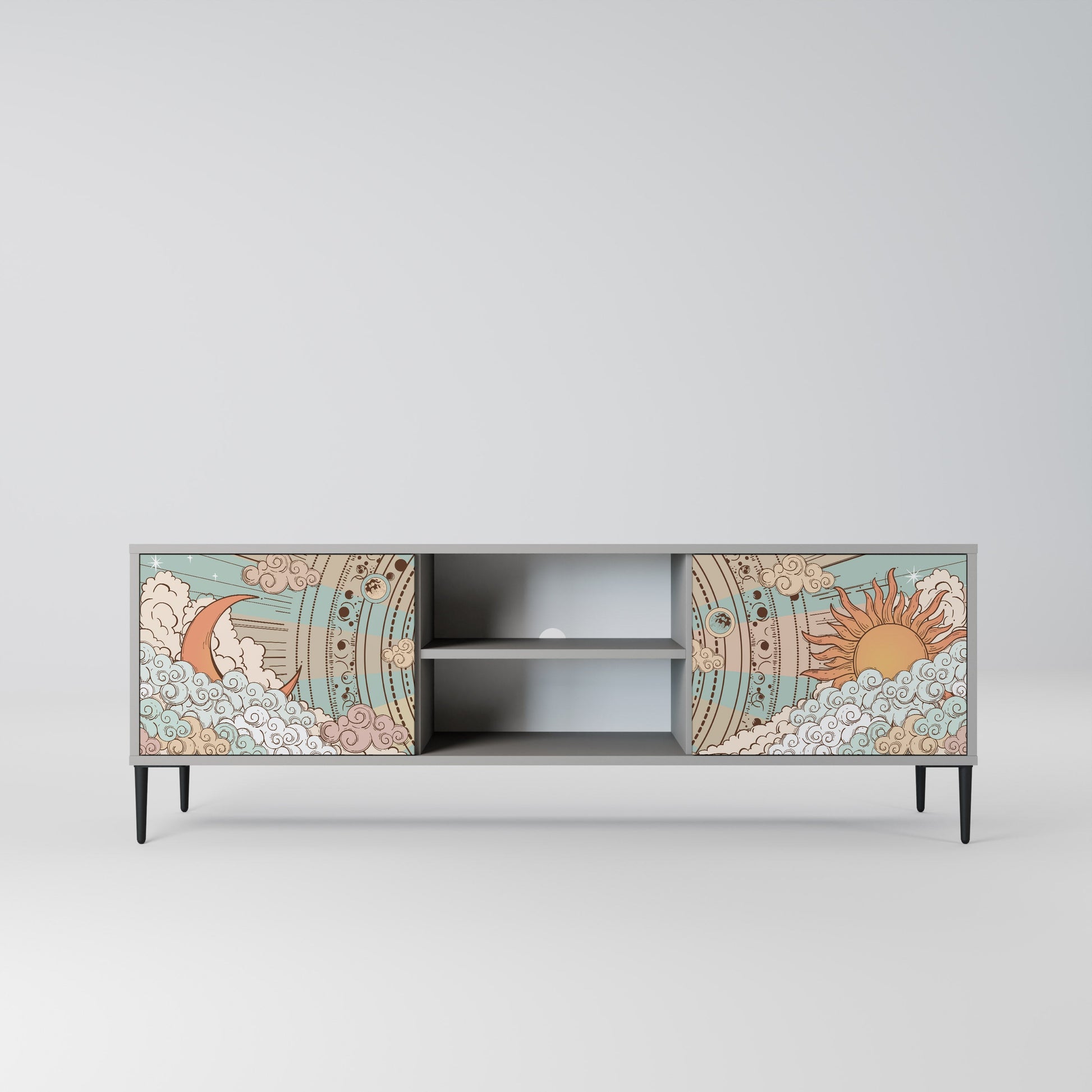 The grey body lends the TV stand a contemporary, refined look, while the fronts with an exceptional print capture attention, becoming the focal point of any room. The spacious interior provides room for electronic devices, cables, remotes, and other accessories, helping you maintain order and organization.