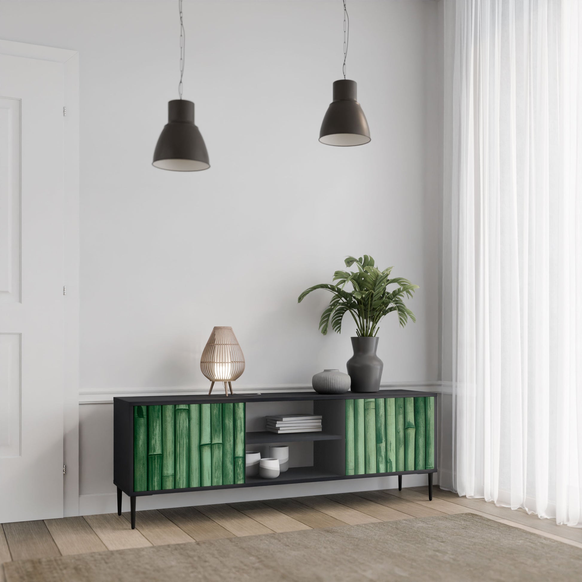 The black body gives the TV stand an elegant, modern look, while the fronts with an exceptional print draw attention, making it the focal point of any room. The spacious interior provides room for electronic devices, cables, remotes, and other accessories, helping you maintain order and organization.