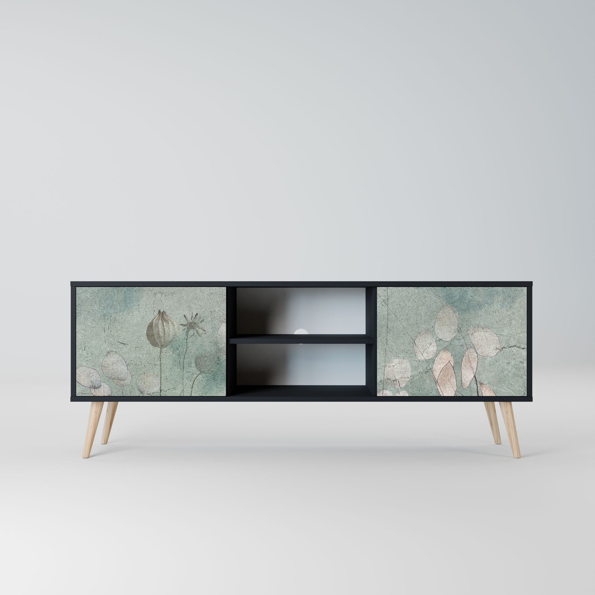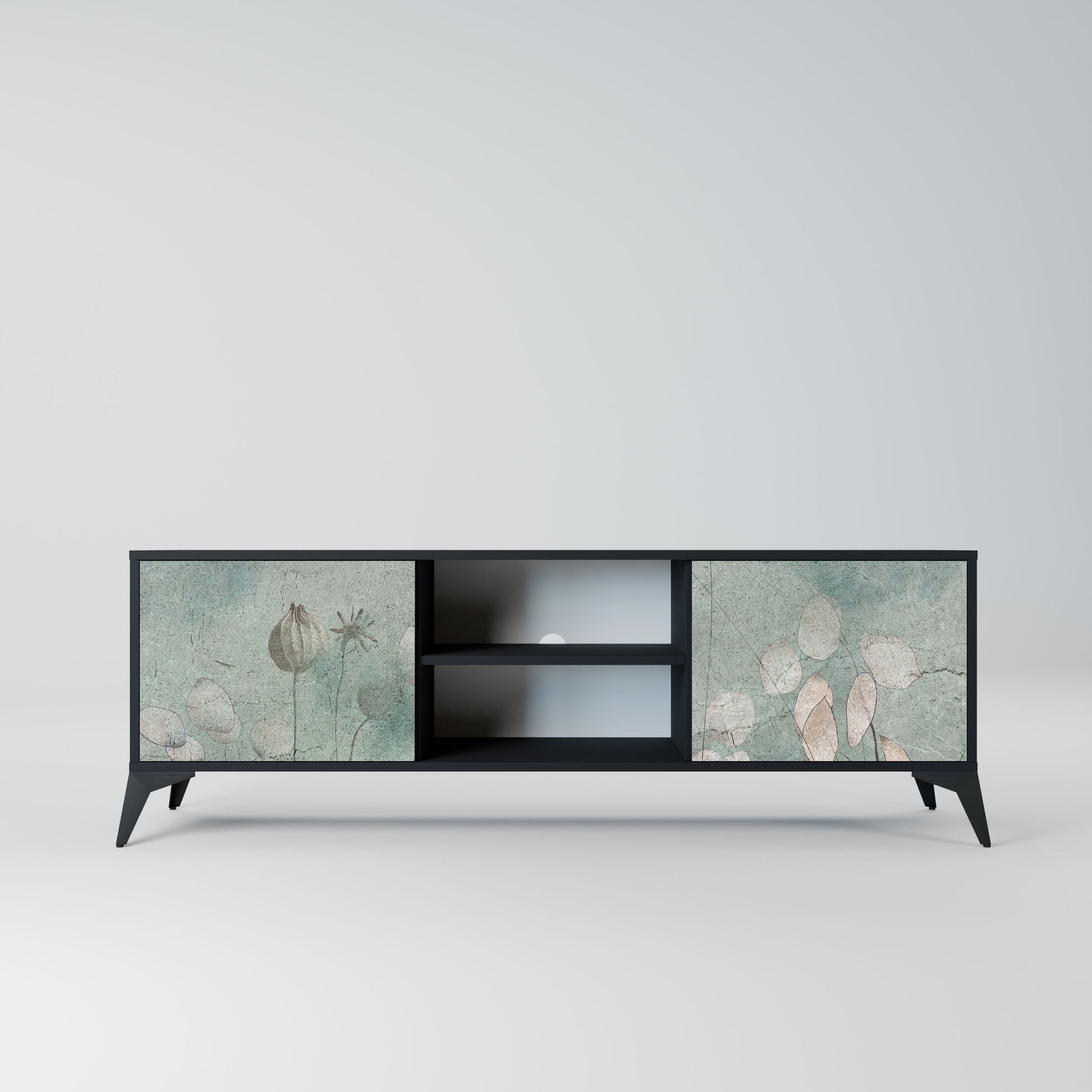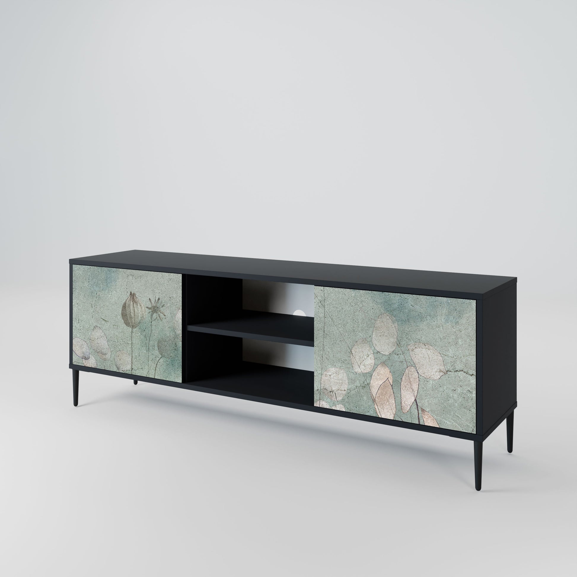 The black body gives the TV stand an elegant, modern look, while the fronts with an exceptional print draw attention, making it the focal point of any room. The spacious interior provides room for electronic devices, cables, remotes, and other accessories, helping you maintain order and organization.