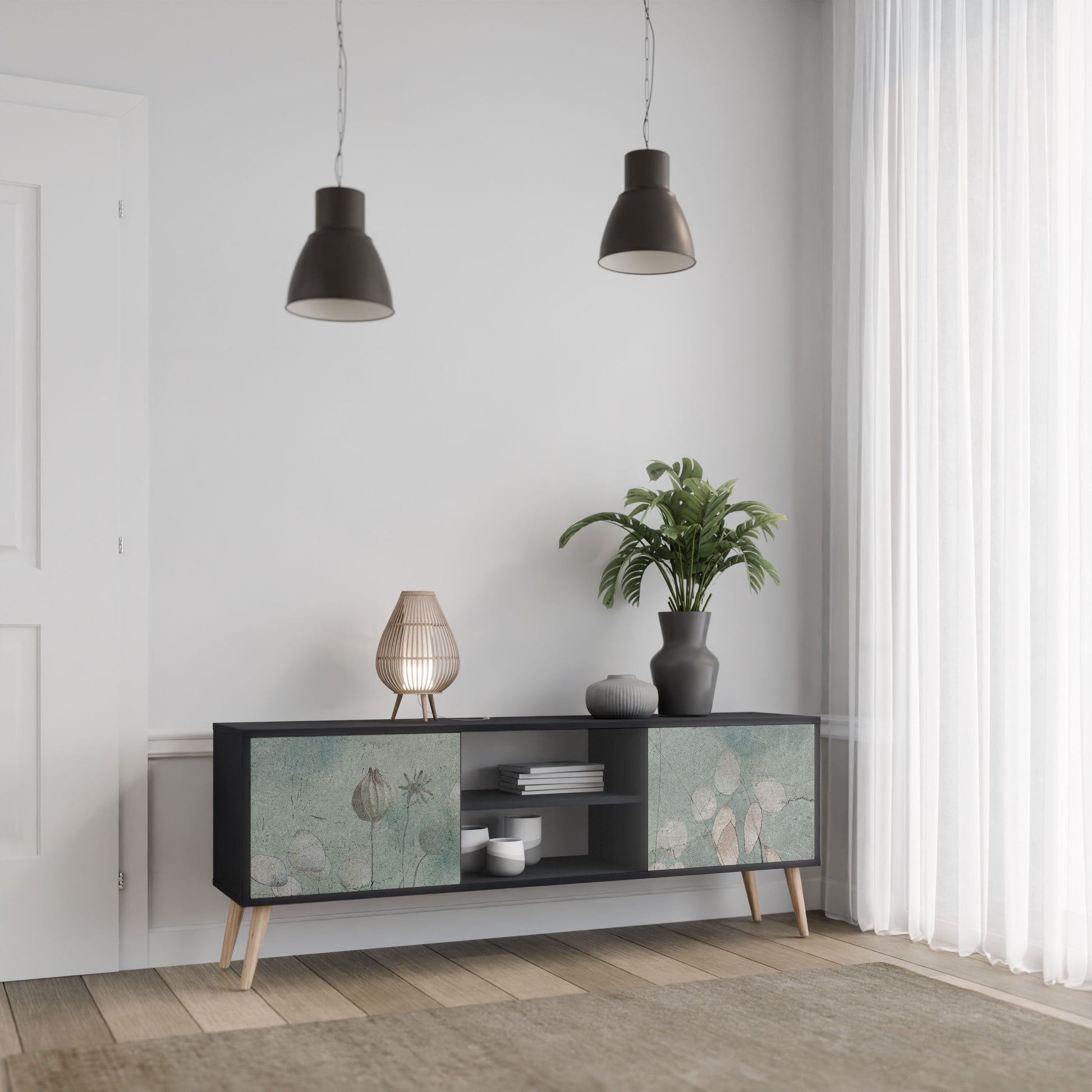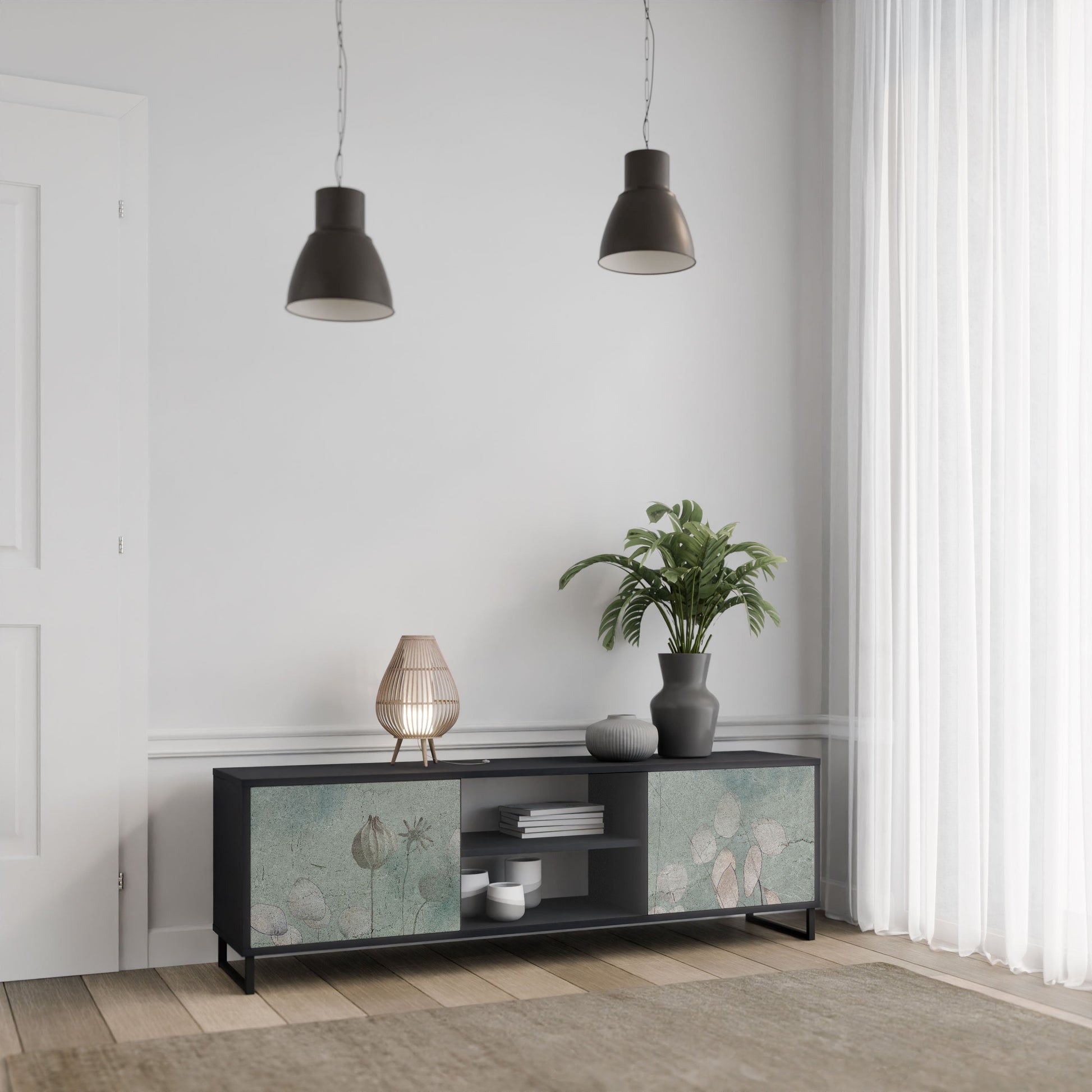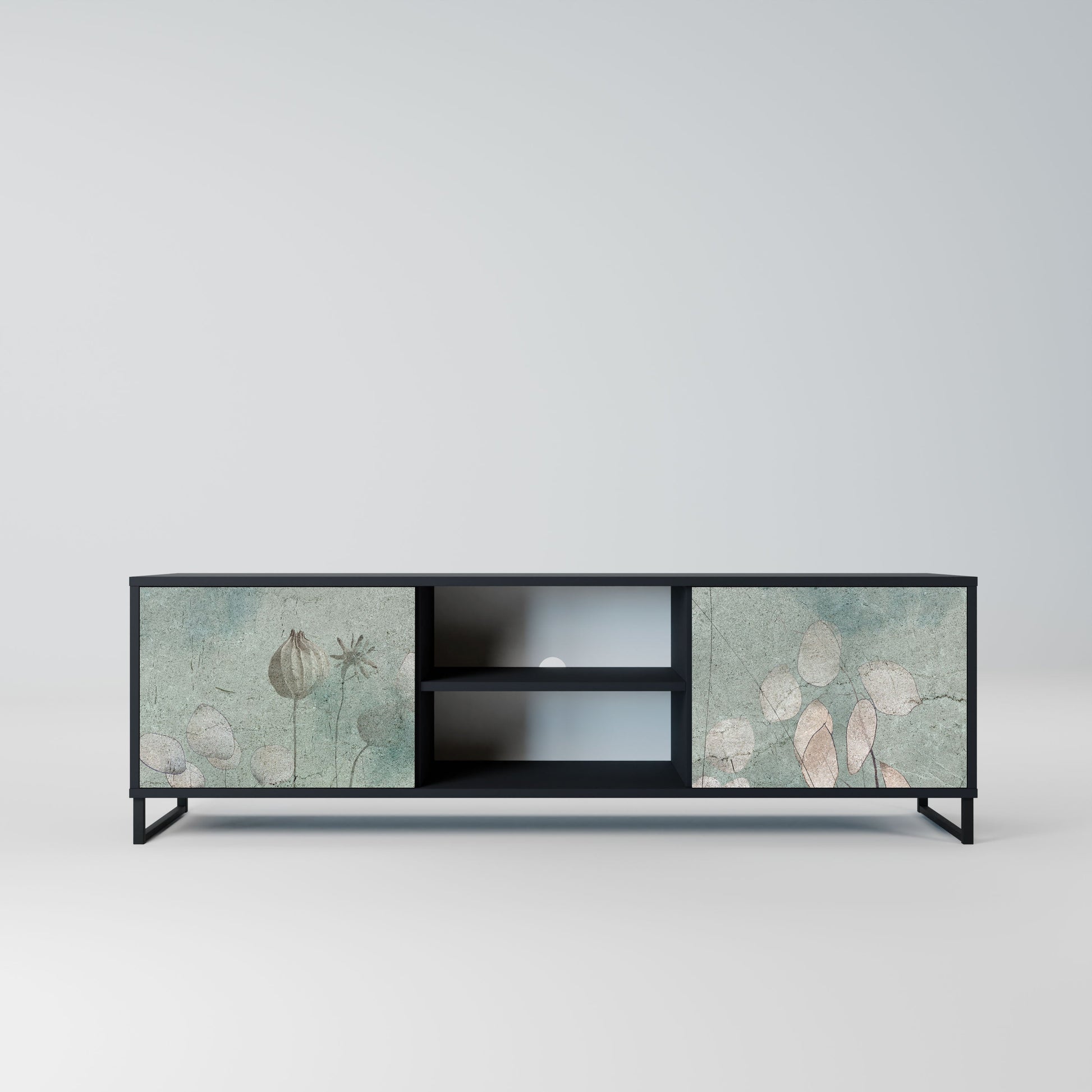 The black body gives the TV stand an elegant, modern look, while the fronts with an exceptional print draw attention, making it the focal point of any room. The spacious interior provides room for electronic devices, cables, remotes, and other accessories, helping you maintain order and organization.