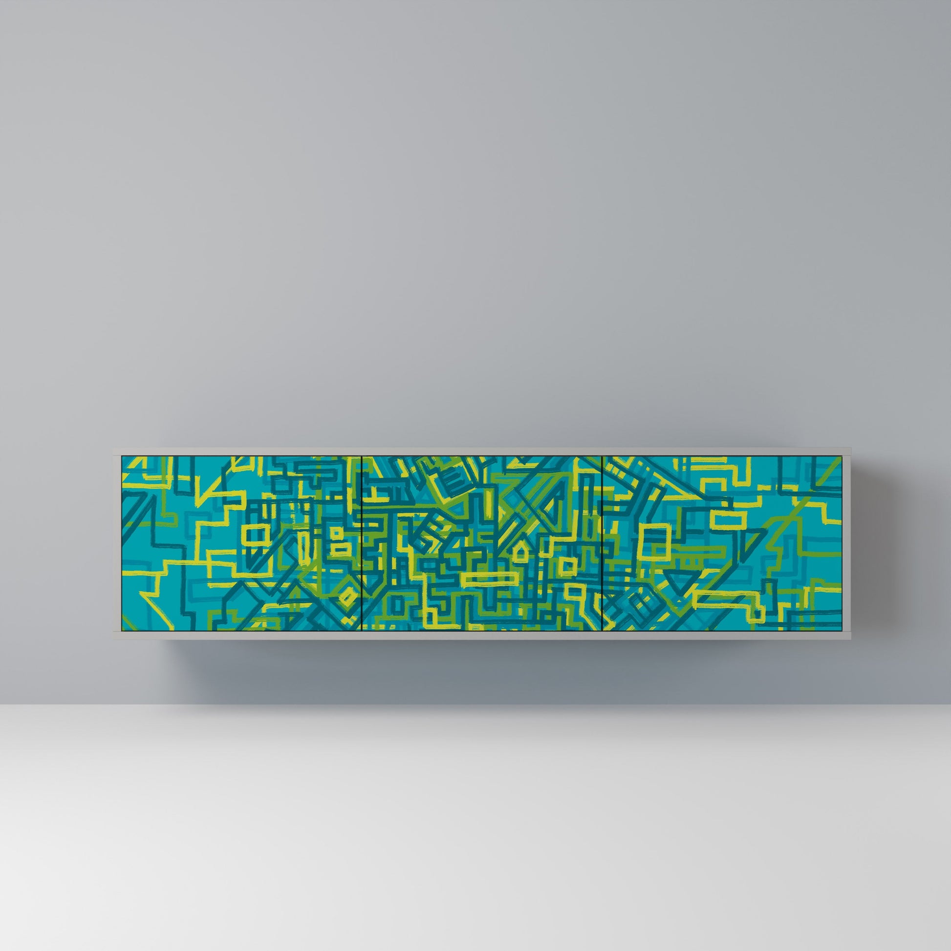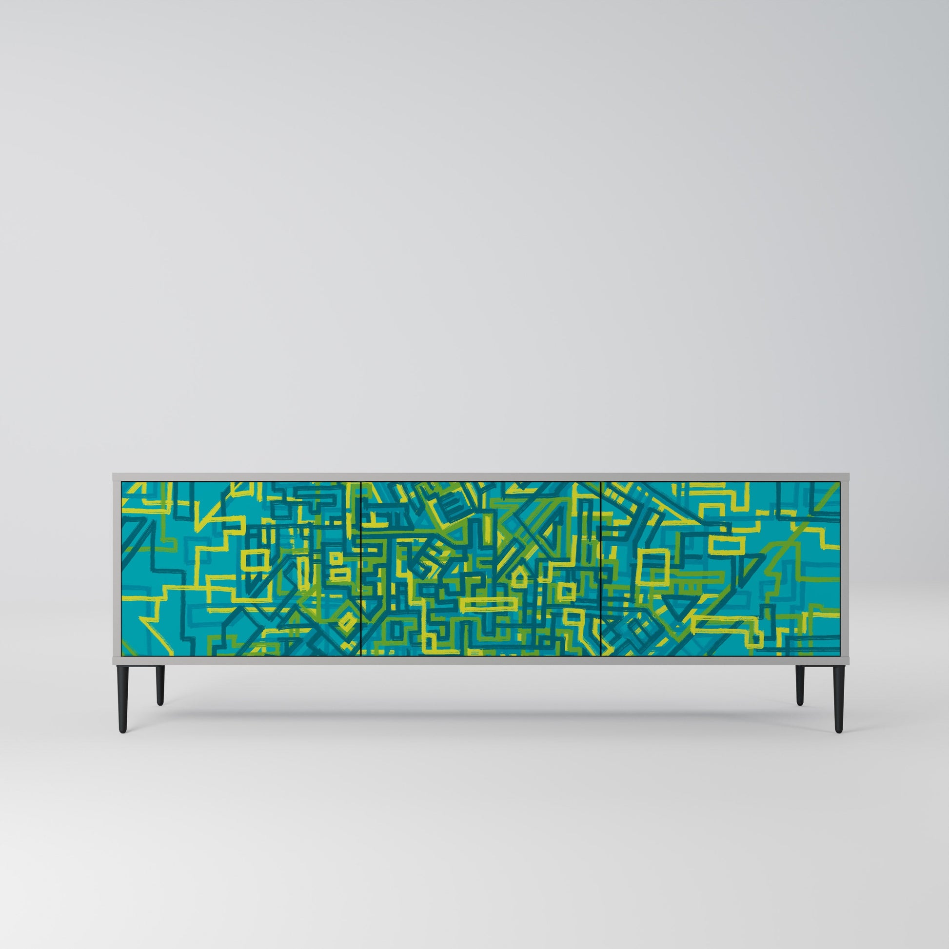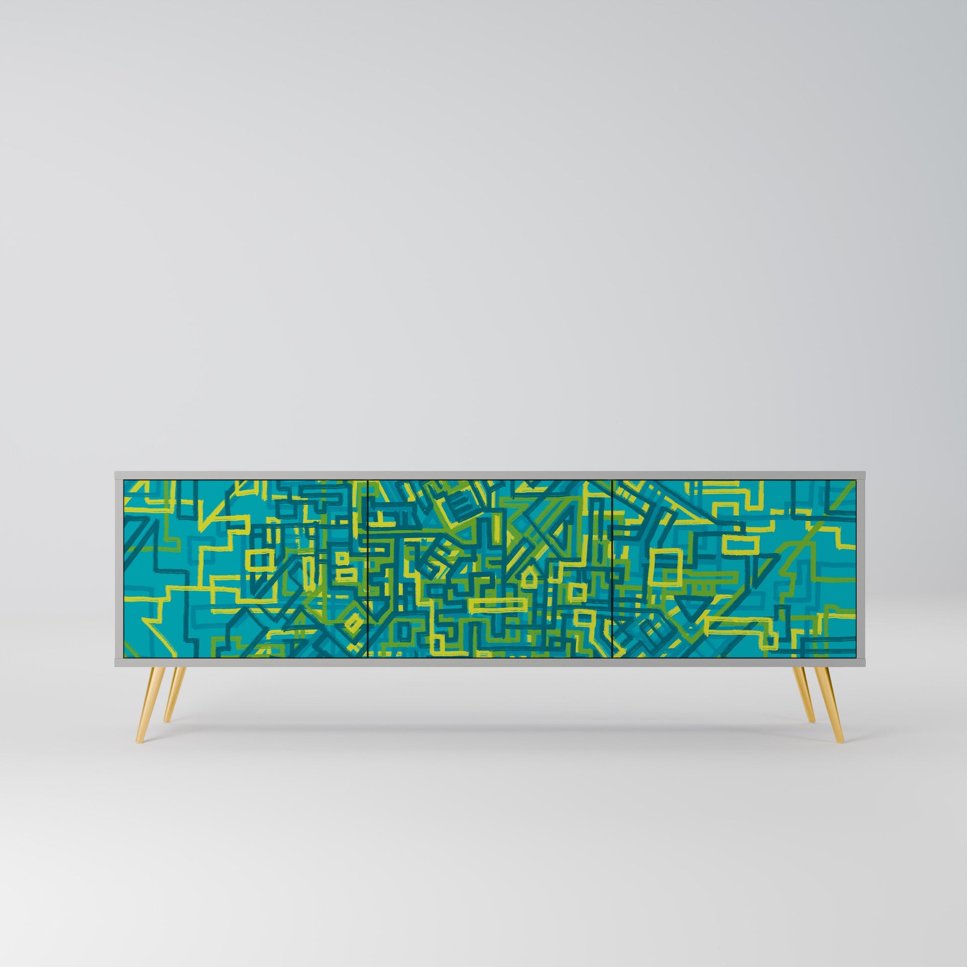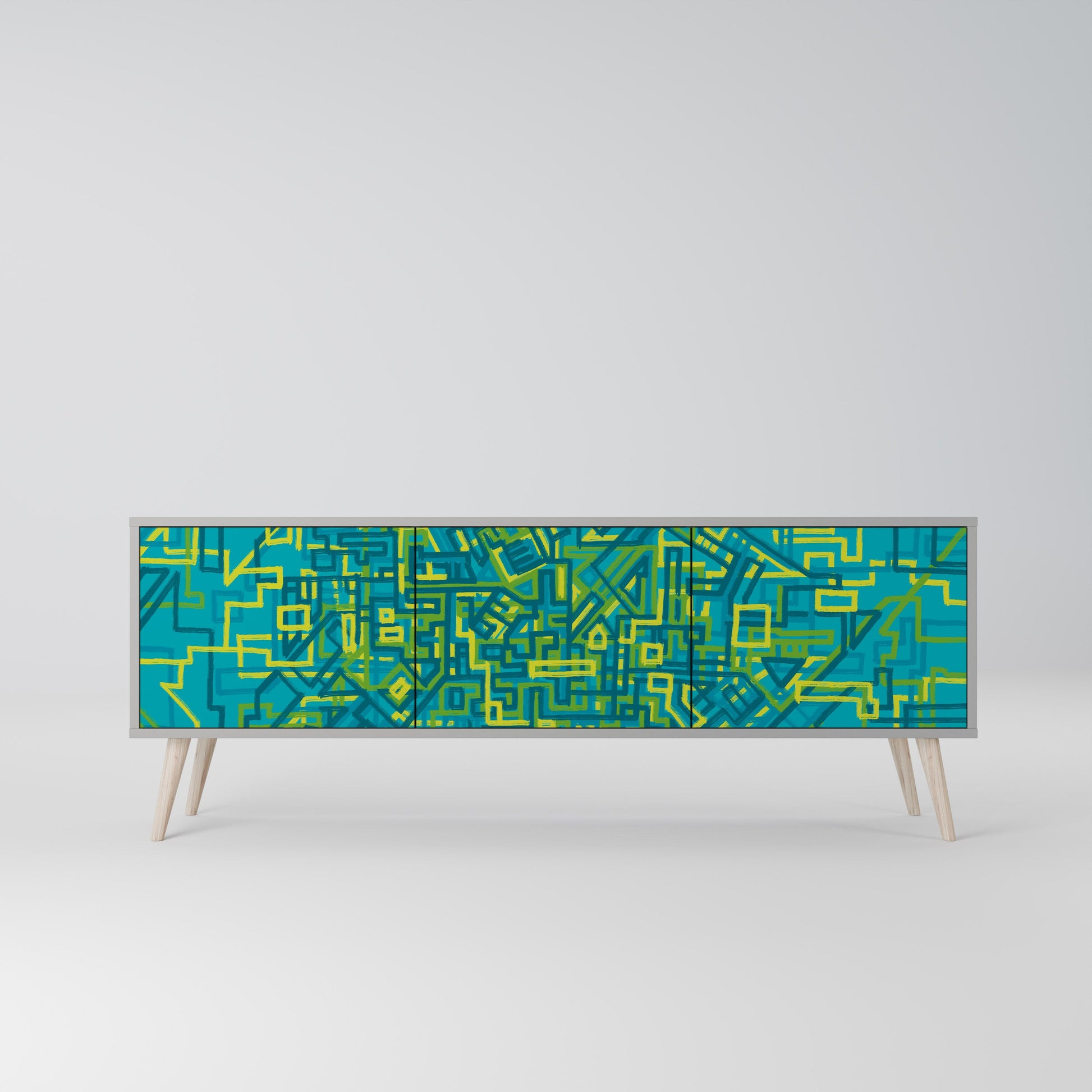 The grey body of the stand creates a refined, modern accent that pairs beautifully with industrial and minimalist arrangements. The fronts with a designer print add character and uniqueness, making this piece not only practical but also a standout decorative element.