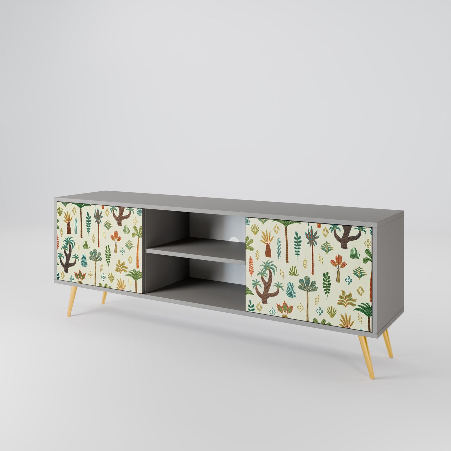 The grey body lends the TV stand a contemporary, refined look, while the fronts with an exceptional print capture attention, becoming the focal point of any room. The spacious interior provides room for electronic devices, cables, remotes, and other accessories, helping you maintain order and organization.