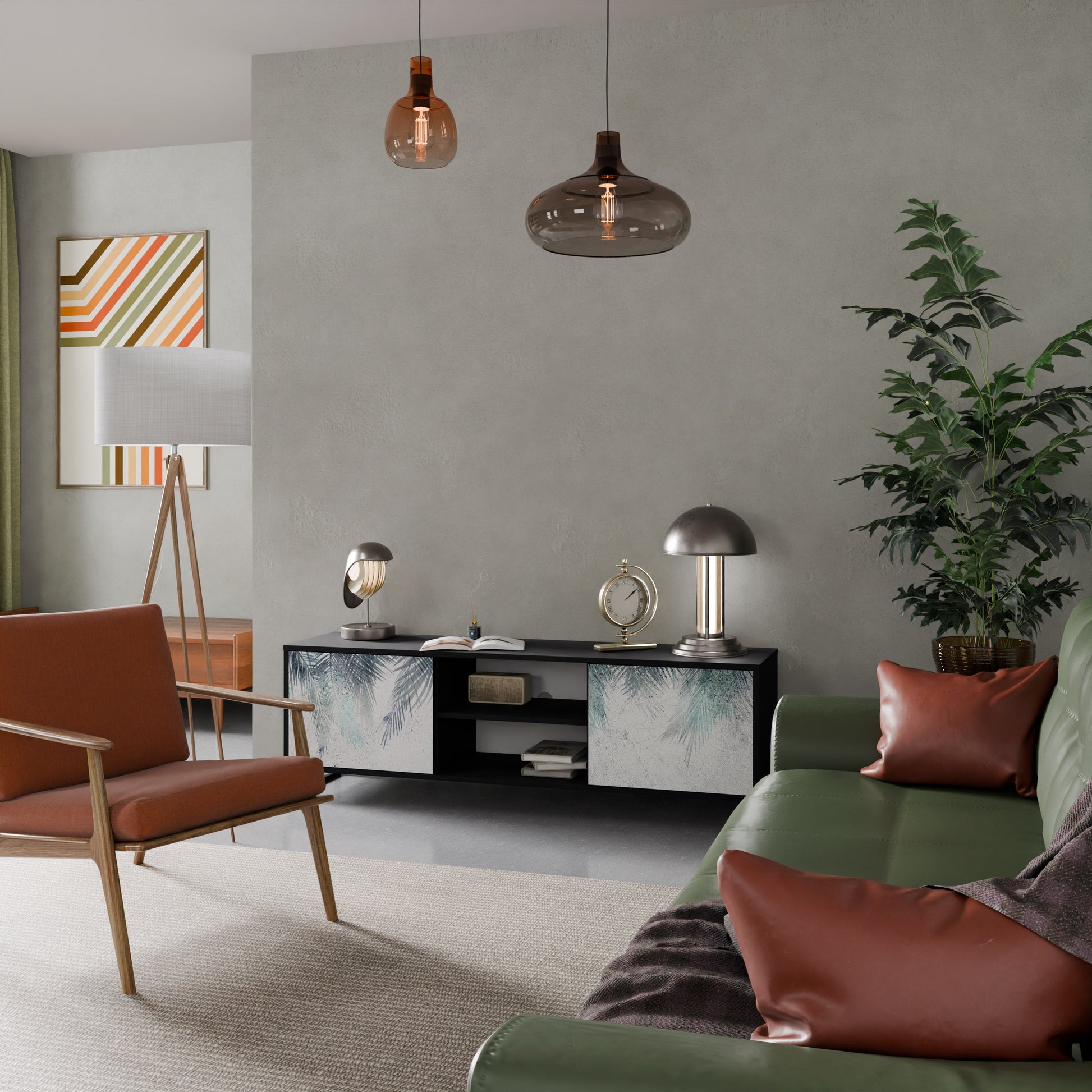 The black body gives the TV stand an elegant, modern look, while the fronts with an exceptional print draw attention, making it the focal point of any room. The spacious interior provides room for electronic devices, cables, remotes, and other accessories, helping you maintain order and organization.
