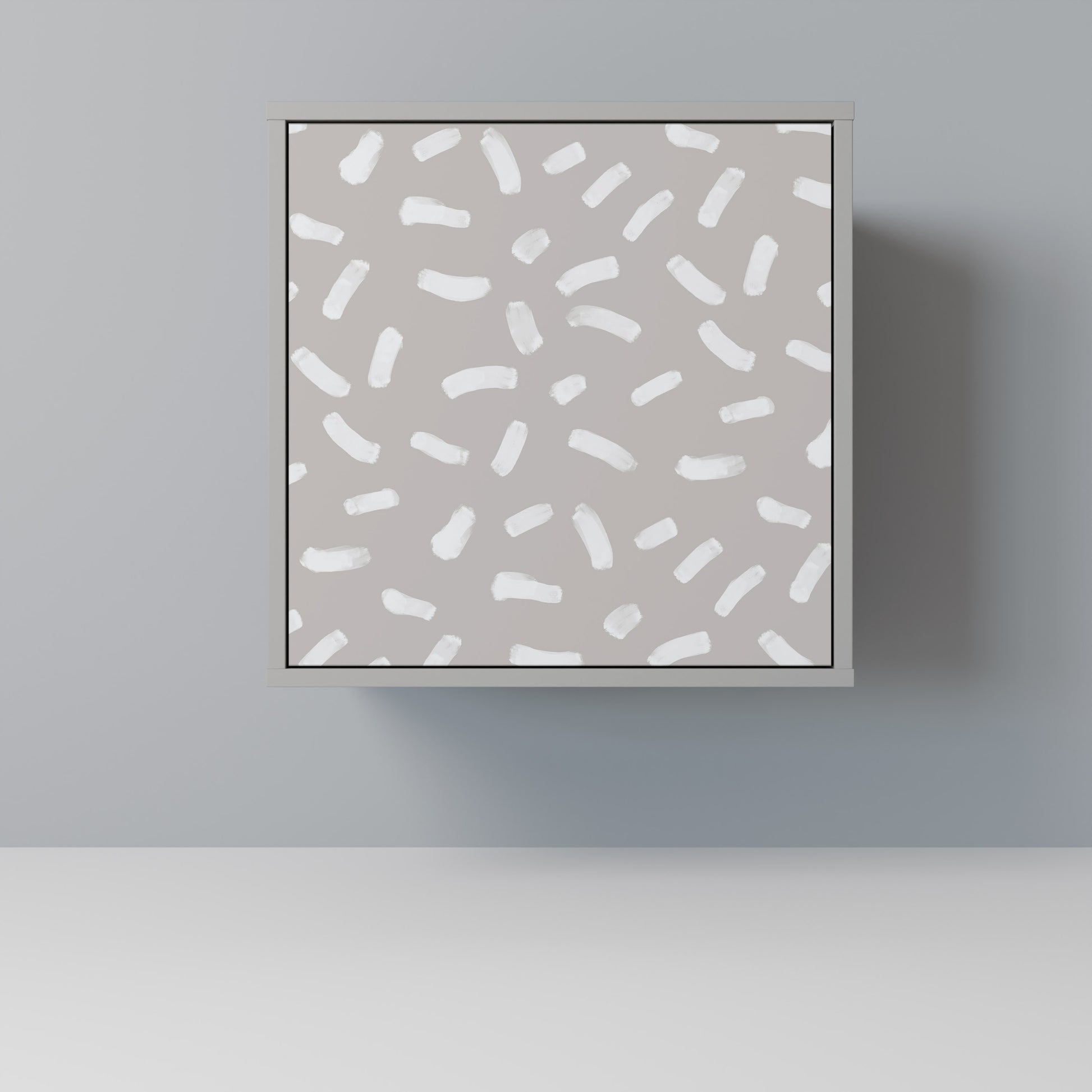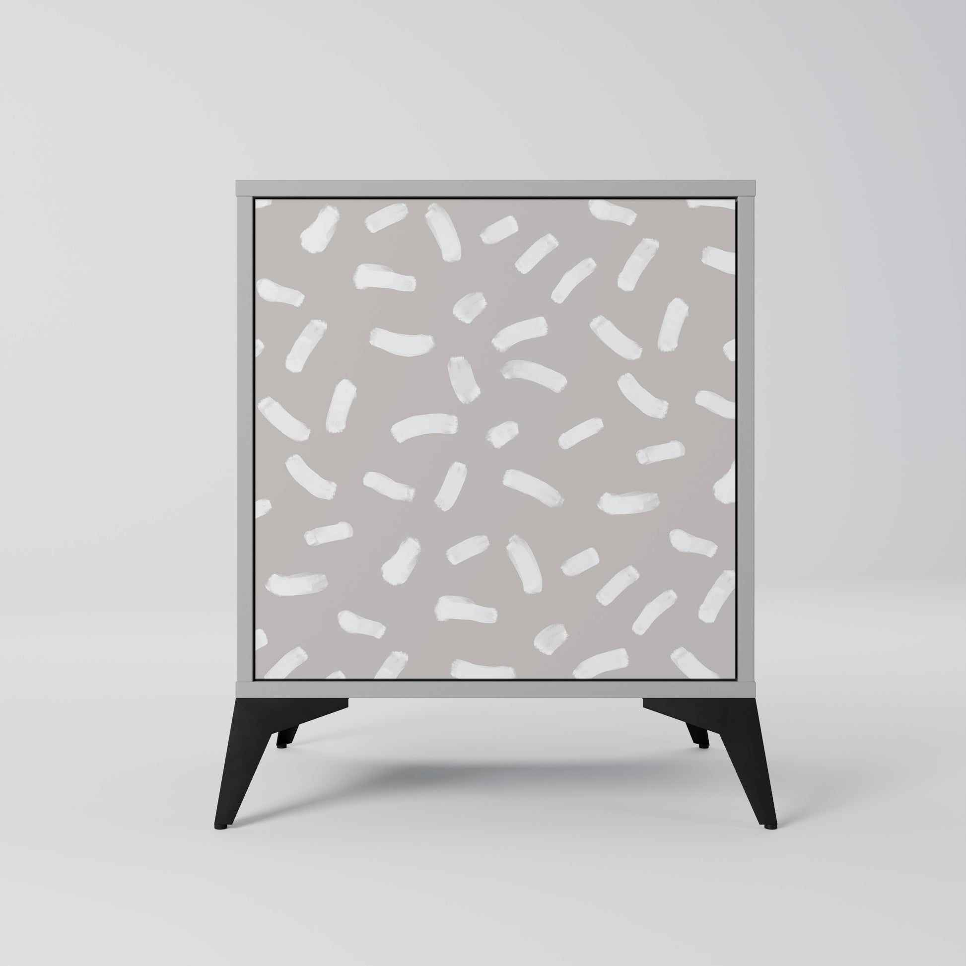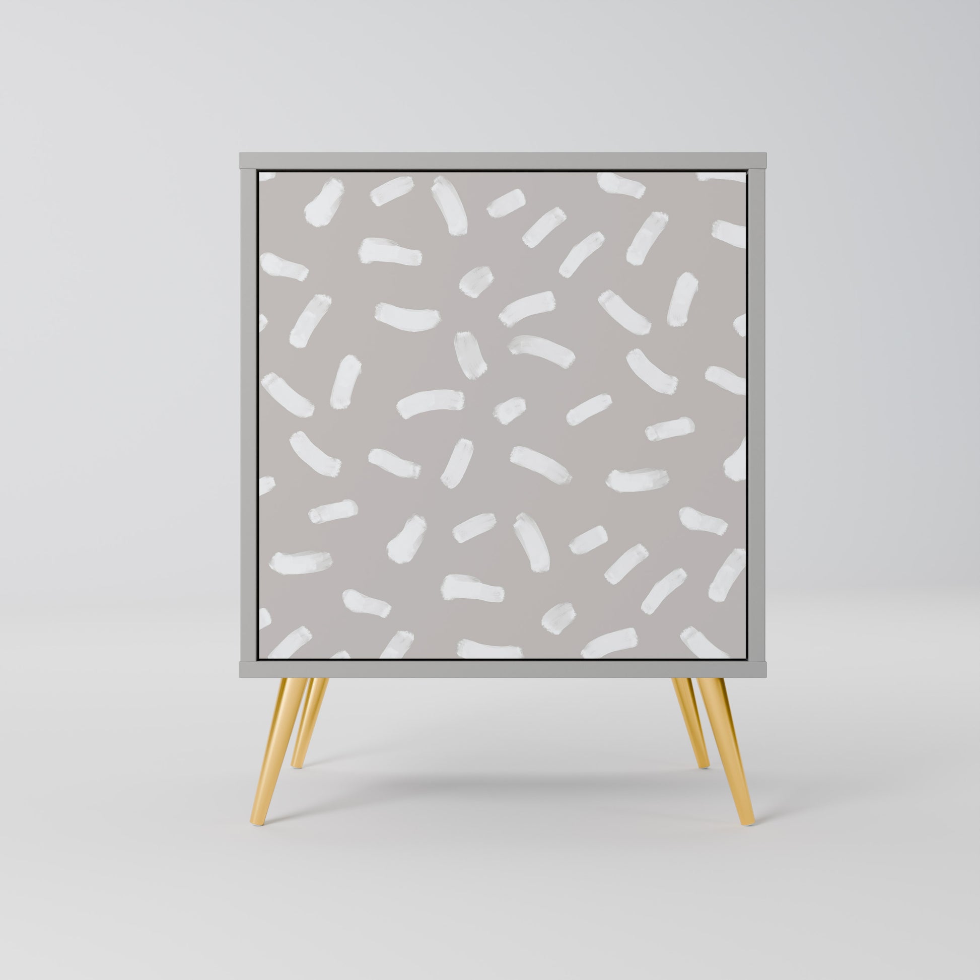 This compact yet remarkably elegant piece of furniture impresses with its minimalist design, perfectly fitting into both modern and classic interiors. The subdued grey color of the body gives the furniture a subtle yet distinctive character, while the fronts with a unique print add an artistic touch.