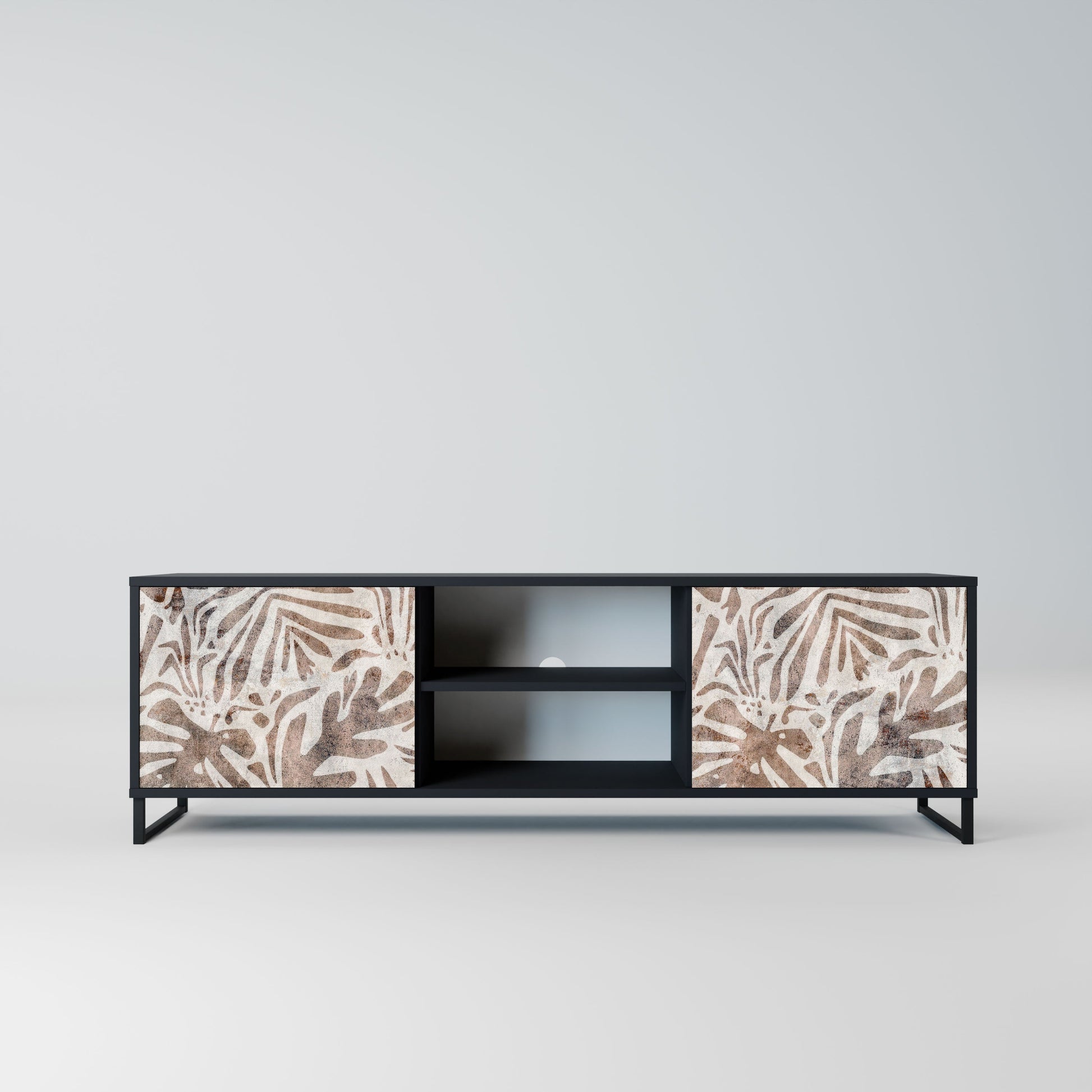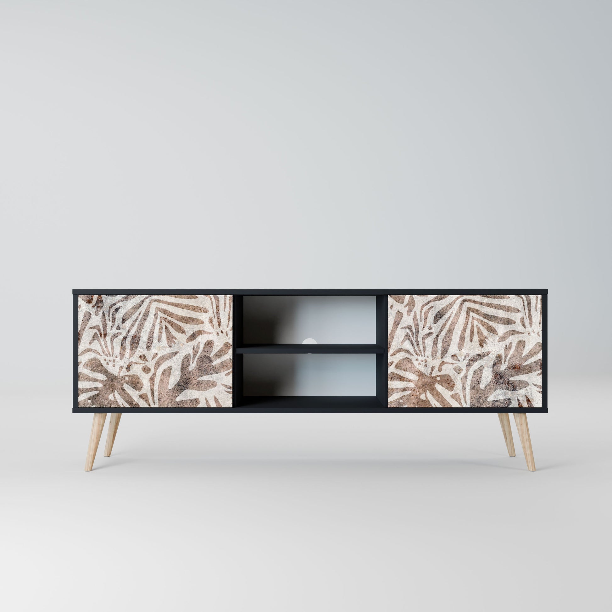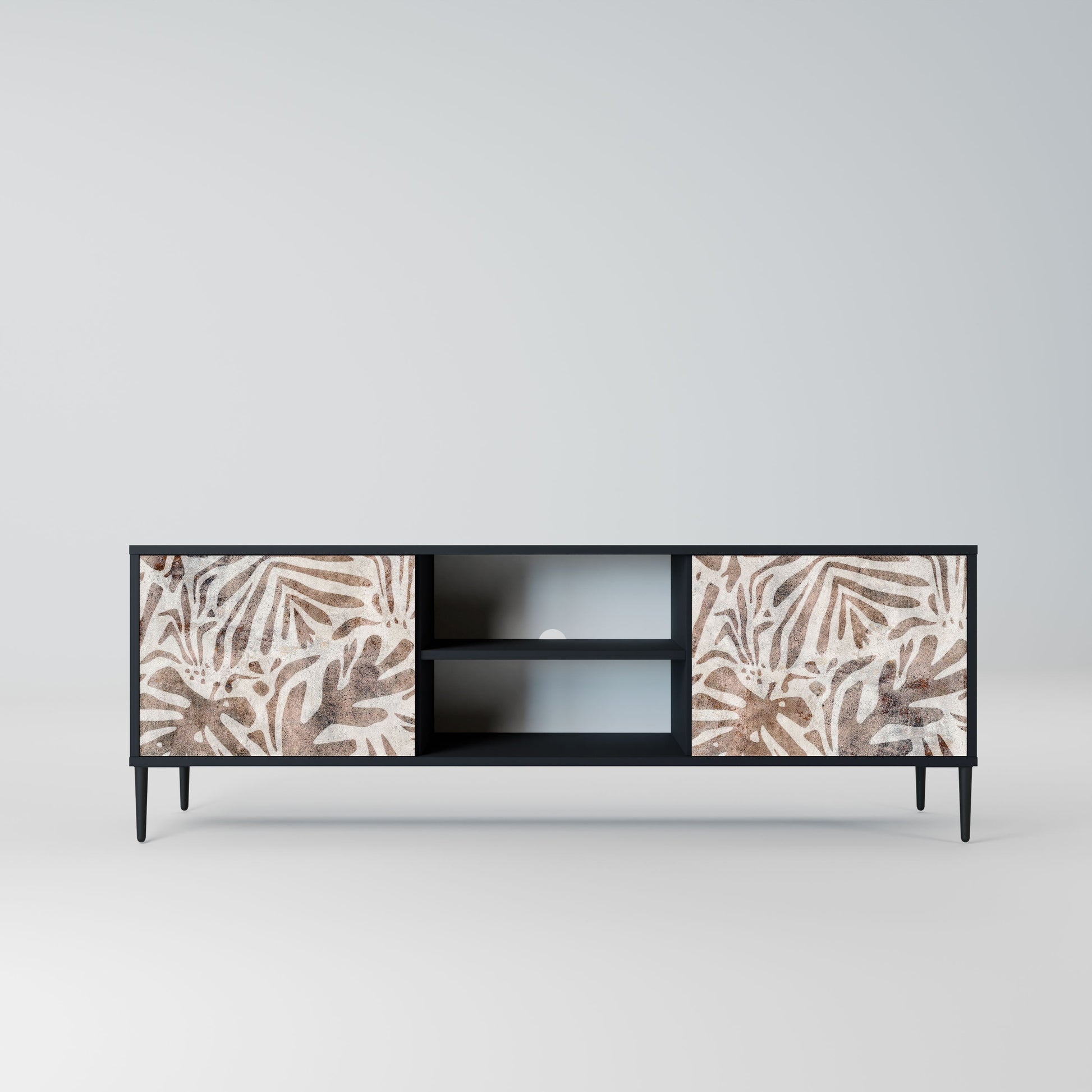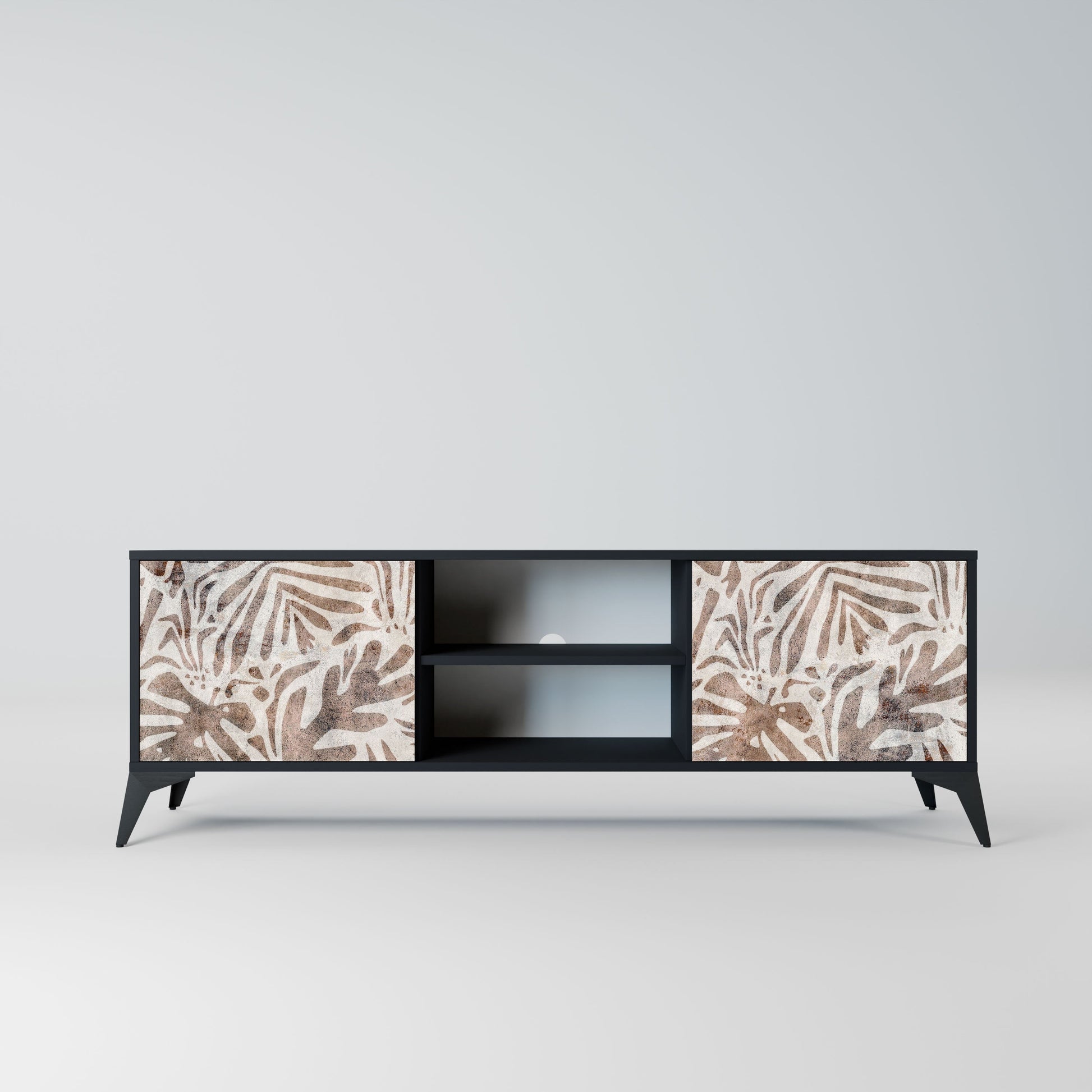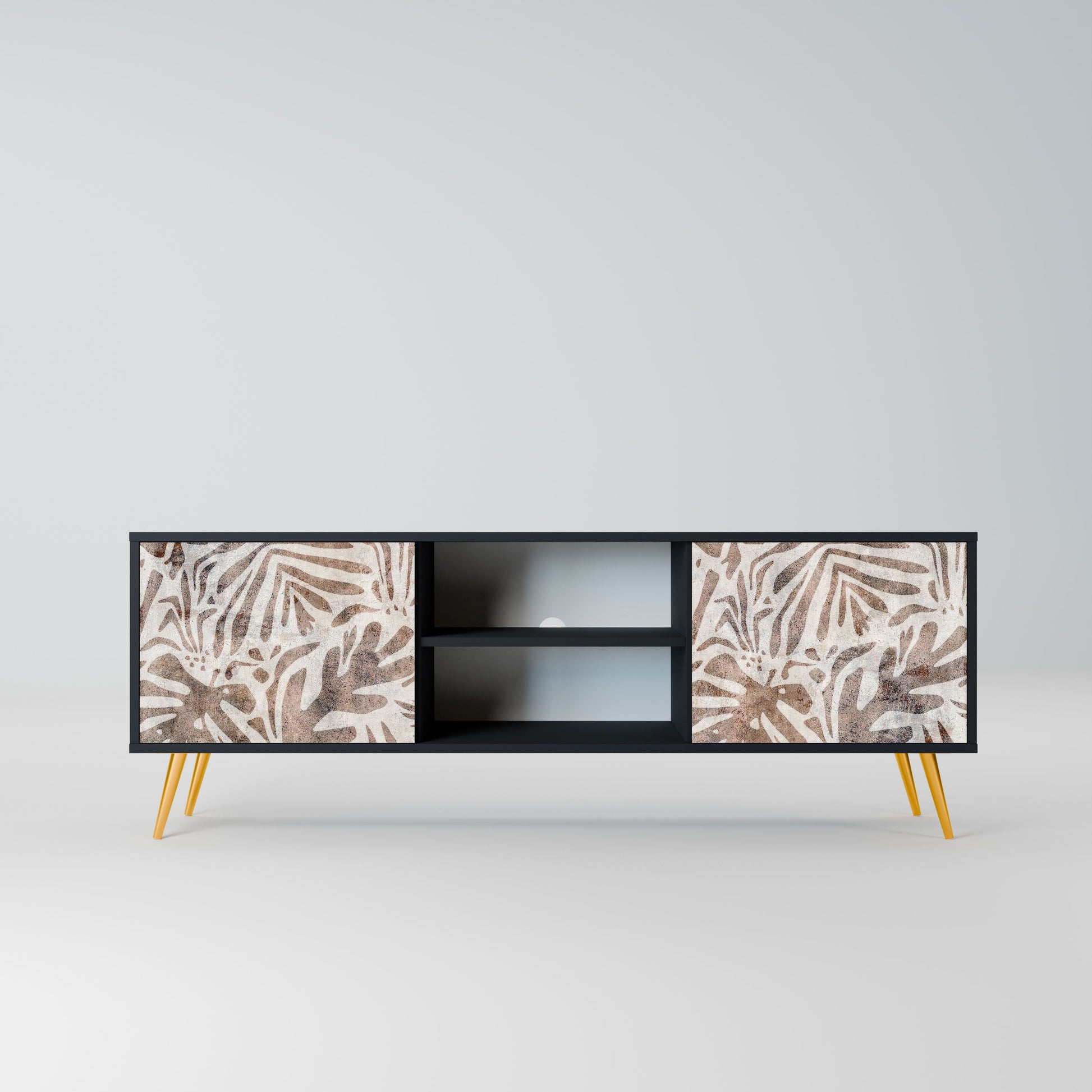 The black body gives the TV stand an elegant, modern look, while the fronts with an exceptional print draw attention, making it the focal point of any room. The spacious interior provides room for electronic devices, cables, remotes, and other accessories, helping you maintain order and organization.