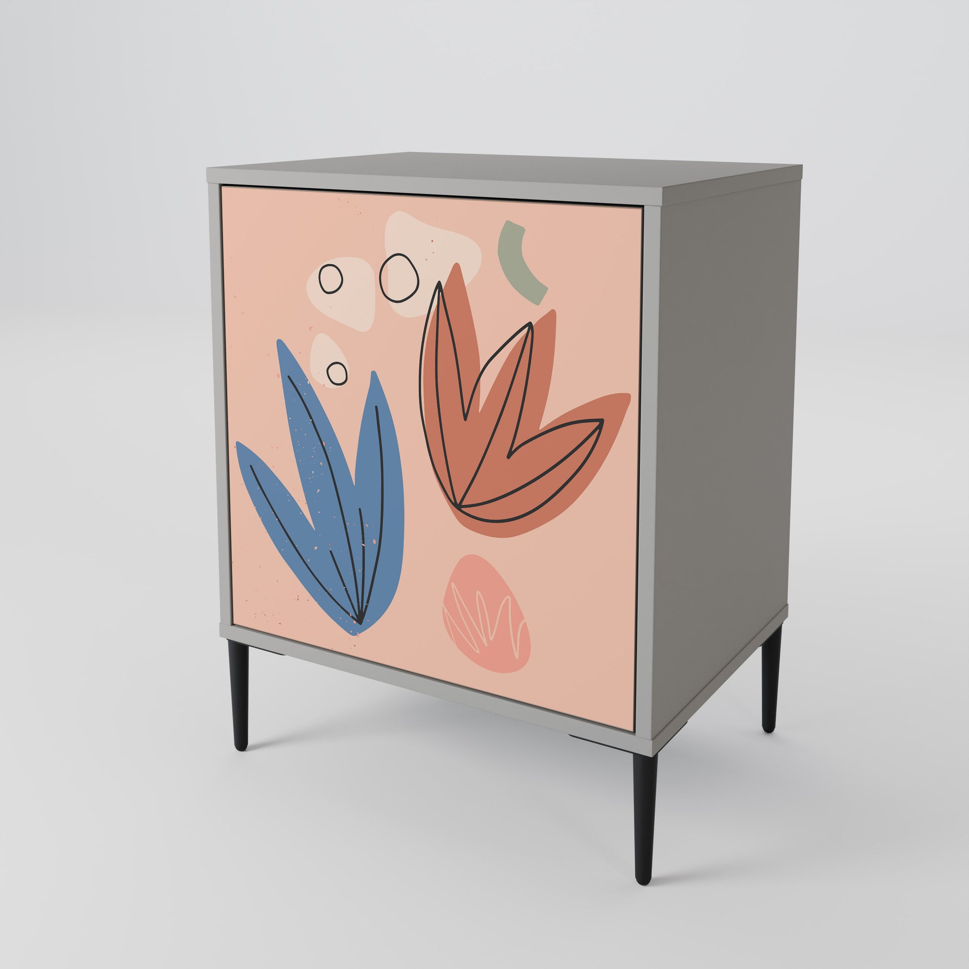 This compact yet remarkably elegant piece of furniture impresses with its minimalist design, perfectly fitting into both modern and classic interiors. The subdued grey color of the body gives the furniture a subtle yet distinctive character, while the fronts with a unique print add an artistic touch.